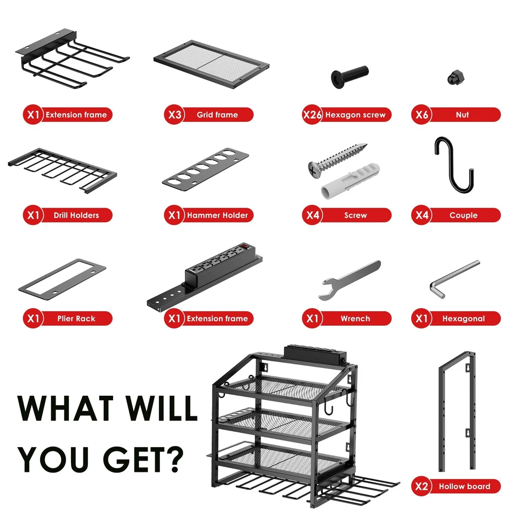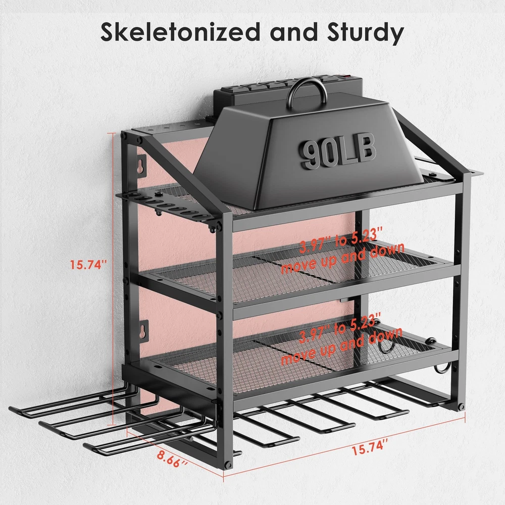 storage and organization : The power tool charging station have 6 AC power outlets, 5 ft power cord, 125V/15A/1875W output, this power tool organizeris suitable for a variety of places such as garages, tool rooms, yards and more. 4 Tiers of Efficient Storage: First tier for cordless tools, second tier is height-adjustable (three centimeters up and down), third tier for garage tools, bottom tier for 4 cordless drills, side tier for 6 pliers and hammers, 4 long hooks, and a drill holder for 2 drills. Drill Holder Wall Mount: Easily hang the tool rack on different walls, such as wall control pegboard, concrete, brick, wood wall, etc., the size of this tool organizer wall mount is 15.75*15.75*8.66 inch, but the skeletonized design allows the to Upgraded Tool Organizer with Charging Station: The power tool organizer with power strip is equipped with 6 outlets and is very convenient for charging tool batteries. This power tool organizeris suitable for a variety of places such as garages, tool rooms, yards and more. 4 Tiers of Efficient Storage: First tier for cordless tools, second tier is height-adjustable (three centimeters up and down), third tier for garage tools, bottom tier for 4 cordless drills, side tier for 6 pliers and hammers, 4 long hooks, and a drill holder for 2 drills. Drill Holder Wall Mount: Easily hang the tool rack on different walls, such as wall control pegboard, concrete, brick, wood wall, etc., the size of this tool organizer wall mount is 15.75*15.75*8.66 inch, but the skeletonized design allows the tool holder to store longer items. HOLD 55 LBS, EASY TO ASSEMBLE: Made of sturdy steel with precision cut and reinforced construction, holds up to 55 lbs, modular design for easy assembly, comes with instructions and can be set up in less than 15 minutes. EXCELLENT AFTER-SALES SERVICE: Our brand offers 2 years after-sales guarantee service for all products, please feel free to contact us if you have any questions. MENS CHRISTMAS GIFTS: Ideal as a Christmas gifts for men, dad, husband, brother, son, or any man in your life, our power tool organizer blends utility Men style to maximize their garage organization.