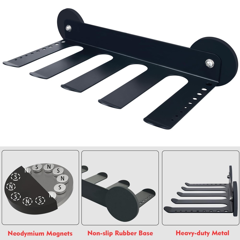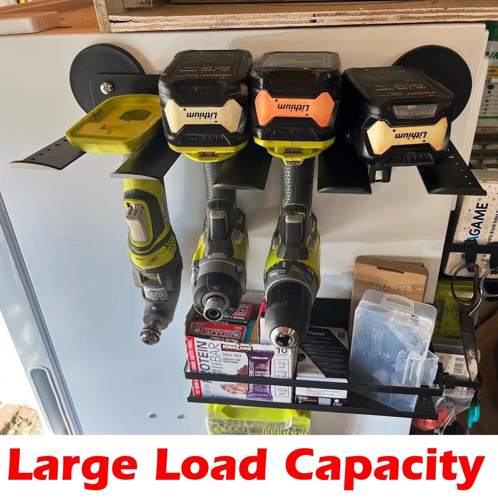 Color:Black · Item Name: Power Tool Organizers and Storage Garage Storage Shelves Magnetic Mount · Magnet Size: Diameter 3.46'';Thickness 0.32''. · Product Size:Length 14.96''; Width 7.08'';Height 1.96'';. · Nut on magnet size: M8 * 0.59''. . Package Weight: 3.08 pound(1.4 KG) · Packing Included: Magnetic Bases x2 +Drill Holder Plate x1 + #M8 Nut x2 + Flat Washers and Spring Washer x2. [Magnetic Mount Larger Rack] Owned large load capability and four slots perfect for any power tools with a handle, such as a circular saw, cordless impact wrench, or cordless drill. attaching to any ferrous metal surface tool box, tool chest steel workstation surface [Anti-slip Magnetic Bases]The power tools holder includes super power neodymium magnets, contributes a magnetic tool holder with large capability, sturdy steel plate that could hold heavy-duty power tools, and keep stability, will not slide off [Durable Steel Construction] The power drilling tool holder is made of heavy 3mm solid steel with powder coating. The steel frame designed with 4 slots, will not decay, fracture, crack, or fade, and is a good choice for a storeroom and garage [Removable Design Easy To Install] Magnetic tool organizers are designed for ease of movement and installation. The magnetic shelves can be temporarily fixed in a garage, workroom, or workstation and are easy to install and release [Versatile and Universal] Magnetic tool rack owned large load capacity, perfect for power tools handy, such as a circular saw, cordless impact wrench, or cordless drill. attaching to toolbox, tool chest steel workstation, keep tools closed at hand