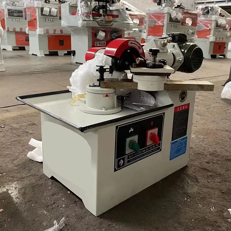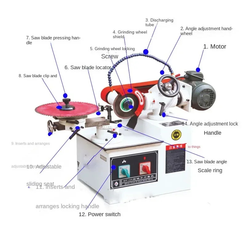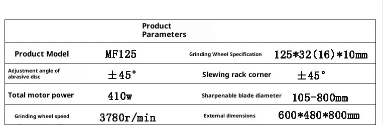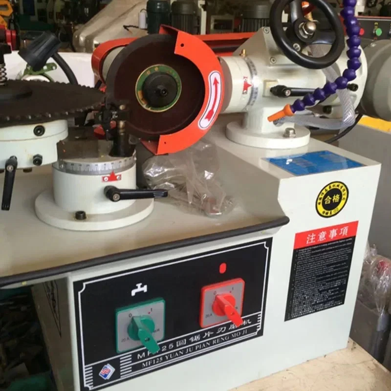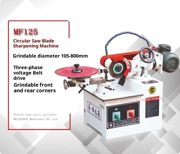 Power Tools MF125 Alloy Saw Blade Grinding Machine Small Manual Saw Blade 220V This machine is designed for sharpening various carbide saw blades. It features an adjustable ring clamp that maximizes support for the tooth face or other workpieces, preventing vibration and enhancing sharpening quality. Equipped with positioning pins, it allows adjustment to the optimal position based on the saw blade diameter. The sliding plate pivots horizontally, ensuring the saw blade's original grinding angle can be maintained or altered. The saw blade carriage features a swivel platform for adjusting the feed angle during grinding. This platform incorporates a slider, mandrel, and limit screw, facilitating operation while guaranteeing the grinding radius to the center. The grinding head includes a +45° rotation mechanism to accommodate grinding beveled saw blades.
