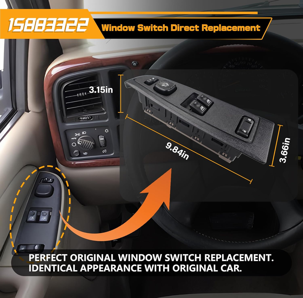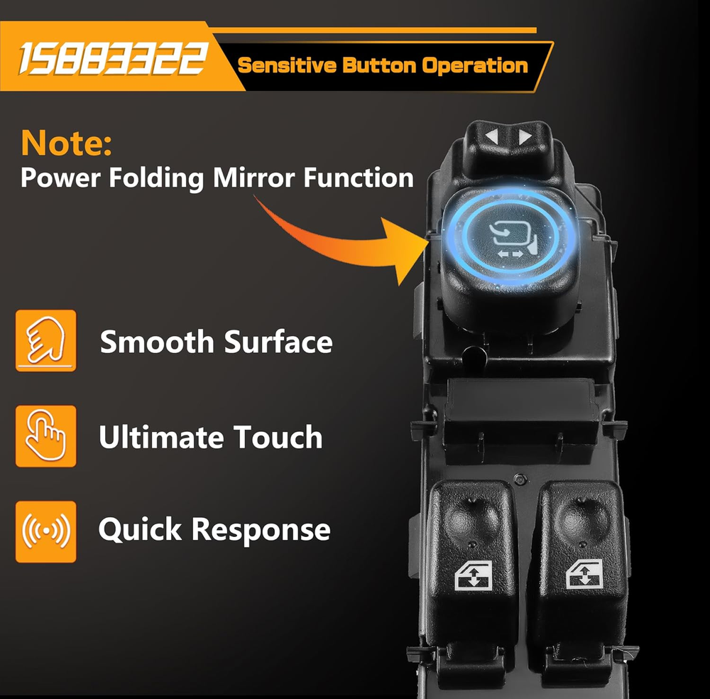 Replace Part Number: 920-024, DWS-248,10398567, 15109665, 15112969, 15125140, 15162500, 15173691, 15186212, 15195298, 15202848, 15745880, 15883322 . Please check the part number of original switch before ordering. Vehicle Fitment-1: Compatible with Chevrolet Silverado 1500 06, Silverado 1500 Classic 07, Silverado 2500 03-04, Silverado 2500 HD 03-06, Silverado 2500 HD Classic 07, Silverado 3500 HD 03-06, Silverado 3500 Classic 07. Vehicle Fitment-2: Compatible with Sierra 1500 03-06, Sierra 1500 Classic 07, Sierra 2500 03-04, Sierra 2500 HD 03-06, Sierra 2500 HD Classic 07, Sierra 3500 03-06, Sierra 3500 Classic 07. Precise Design: Perfect original switch replacement, very easy to install, ideal solution for your defective window switch. Premium Quality: This window door switch assembly is made of quality ABS & polycarbonate material to provide better performance and sensitive. Product Description