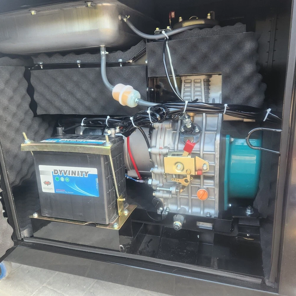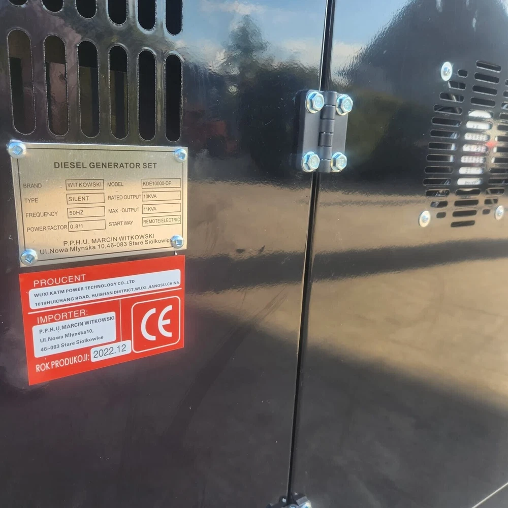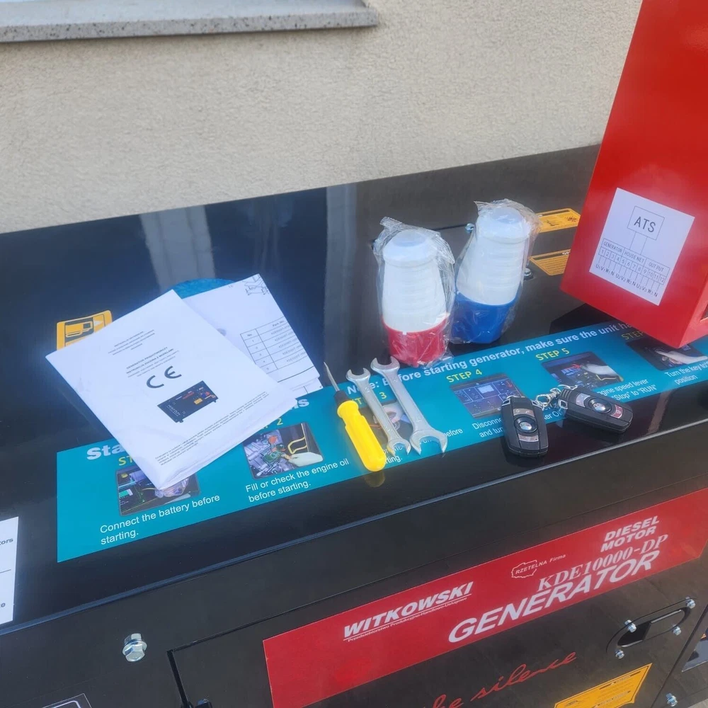 KDE10000DP WITKOWSKI (including ATS BOX) Innovative DUAL POWER technology. With a normal power generator, only 1/3 of the power of the storm generator is available per 230V socket. With this technology, the full power of the storm generator can be used at both 400 V and 230 V. It allows the connection of high power and single-phase devices. The storm aggregate becomes a versatile device with full performance. ADDITIONAL INFORMATION ONLY HERE! The KDE10000DP model is equipped with glow plugs, which make igniting the storm generator just as easy in frost as in plus temperatures. The high output power of the storm generator offers more freedom when connecting single-phase devices and enables the connection of large power devices (three-phase). Low fuel consumption: a maximum of 1.3 liters of oil per hour at maximum load. Easy starting even at minus 20 degrees thanks to the spacious 36Ah battery. 100% copper generator. Remote control with a range of up to 80 m. In addition to an automatic decompressor, the storm unit also has a manual decompressor, which makes starting up even easier. Our generator set has a detailed fuel filter (like in a car), eliminating the need for two filters, reducing operating costs. You also protect the engine from damage because the two-filter system does not have to be constantly ventilated. Adaptation to ATS (automation that allows self-ignition in the event of a power failure and automatic shutdown of the generator when the genset returns from the power plant) via a microprocessor in the electrical panel, solenoid valve and connection socket. If necessary, it is sufficient to purchase an ATS device that allows the storm generator to operate automatically. The storm unit is equipped with an AVR voltage stabilizer. Exhaust gas routing is possible with the hose available in our range. WARRANTY 24 months. Readily available spare parts. Operating instructions in German with EC declaration of conformity. Before delivery, we carry out the initial commissioning. We deliver the storm unit tested and ready for operation - flooded with engine oil and fuel. Technical data The single-cylinder 4-stroke diesel engine KM1100FA with a high power of 11 kW/3000 rpm is a guarantee for the life of the entire power generation unit Self-ignition maximum engine power 15 HP Displacement 670 cc Measuring time on sprockets Fuel: diesel Fuel fed overflow with forced return direct injection; Injection pump Combustion 1.1 l/h ON at 5.5kW, 0.9 l/h at 3.5kW Paper fuel filter forced lubrication; Oil pump Oil level and pressure sensor built-in reusable oil filter (metal) Oil pan capacity 1.65 l 1.2kW electric starter equipped with an electric valve that allows commissioning without a decompression lever replaceable paper air filter Volume 65 ~ 74 dB - distance 7 m Weight of the generators alone 50 kg - generators completely wrapped in copper, stator length 15 cm. Rated power at 230V 8.0 kW (10kVA) Rated power at 400V 8.0 kW (10kVA) maximum power at 230V 8.8kW (11kVA) maximum power at 400V 8.8kW (11kVA) Output voltage 400V/230V/12V C16 protection at 400V, C32 protection at 230V (very important: indicates the power of the generator) Frequency 50Hz AVR (Variable Voltage Stabilization) brushless self-starting generator - very durable Length of the device 1050 mm Width 620mm Height 730mm Weight of 200kg 25 liter tank Furnishing Electric start with the key (starter). Large 36Ah battery Electronic display showing operating hours, voltage and frequency. Additional manual decompressor Rectifier for charging other external batteries. Adapted for ATS (components: microprocessor in the electrical panel, electric valve and junction box 230V 32A in the electrical panel). After purchasing the ATS device, the storm unit can work in automatic mode. Socket 400V 16A Socket 230V 32A Fuel tank 25 l Full-fledged transport wheels for easy transport A 39mm diameter exhaust that allows the exhaust to be extended and the exhaust to be routed outside the room (hoses on offer) Remote controls that work at a distance of 60-80 m depending on the location of the unit (open space, walls, ceilings). Accessories for daily operations 230V (output) x 1 x 230V (standard) Schuko plug Plug 16A 400V Key set (8/10/12/14) screwdriver 2 remote controls Operating instructions in German DELIVERY 3-5 DAYS At the customer's request, the device may not be fired.