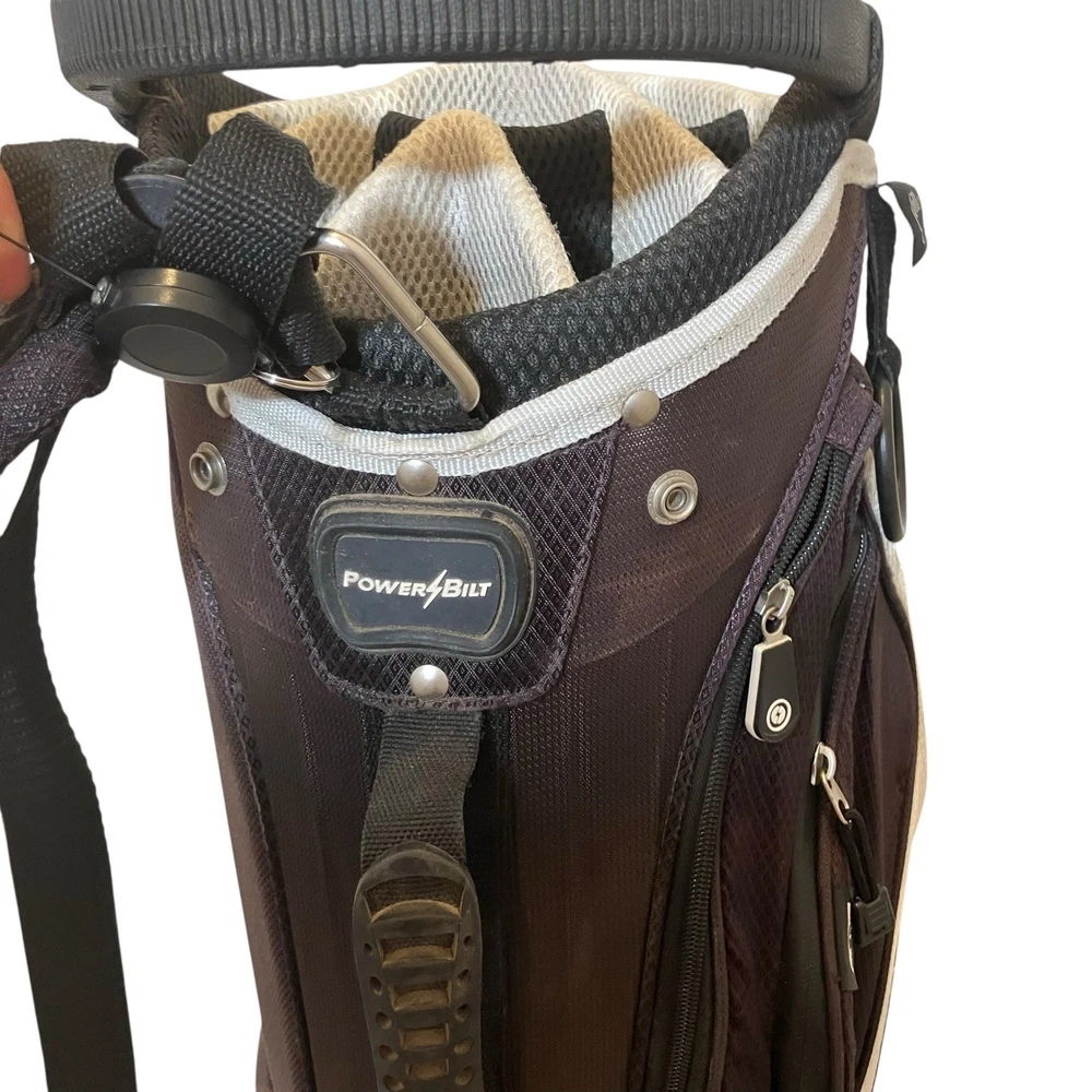 Preowned Powerbilt TPS Dunes 14-Way stand golf bag in all-black. Features a 14-way top for perfect club organization, including individual full-length dividers to protect shafts. Lightweight and designed for comfortable walking or cart use. Includes multiple pockets for apparel, accessories, and valuables. Stand legs function smoothly, straps are in good condition, and bag shows normal minor wear. Ready to hit the course!