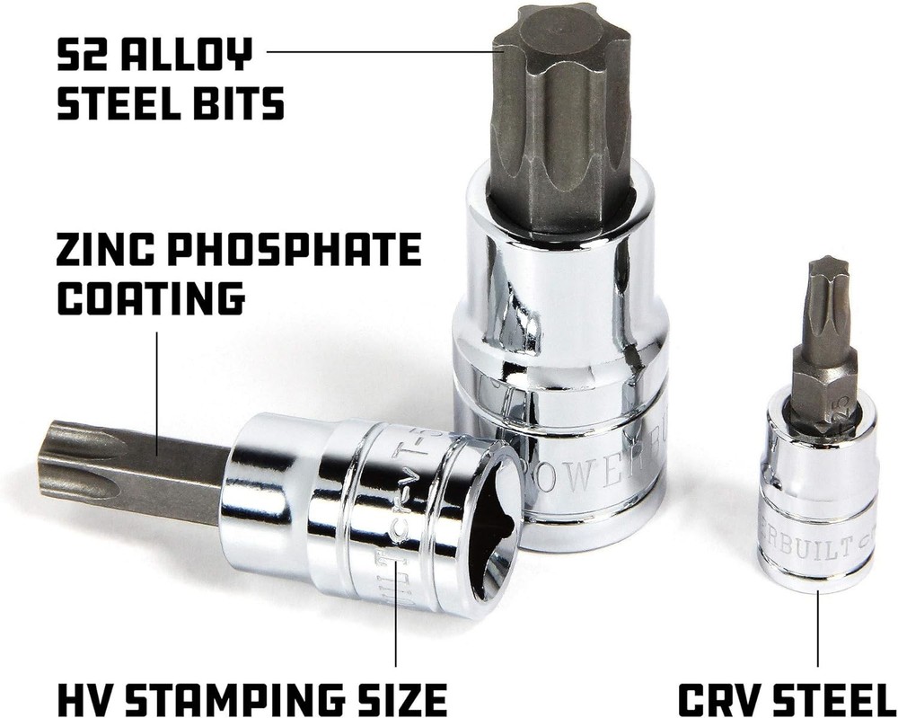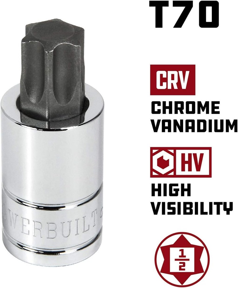 Powerbuilt T-70 Star Bit Socket, 1/2 Inch Drive, Torx, High T 70, Silver Product Details Brand: Powerbuilt Item Length: 0.08 Meters Material: Chrome Vanadium Steel Drive System: Star Finish Type: Chrome Vanadium Number of Pieces: 70 UPC: 028907312903 Global Trade Identification Number: 00028907312903 Manufacturer: Powerbuilt Part Number: 940363 Item Weight: 4 ounces Country of Origin: Taiwan Item model number: 940363 Is Discontinued By Manufacturer: No Size: T 70 Color: Silver Style: T-70 Finish: Chrome Vanadium Item Package Quantity: 1 Measurement System: Metric Compatible Fastener Range: 0.5 inch Included Components: 1/2" Dr. T-70 Star Bit Socket Batteries Included?: No Batteries Required?: No Brand: Powerbuilt Item Length: 0.08 Meters Material: Chrome Vanadium Steel Drive System: Star Finish Type: Chrome Vanadium Superb fit, finish and performance Premium chrome vanadium steel sockets Hardened S2 chrome vanadium steel bits Jumbo size markings forged into the socket wall Durable and long lasting Meets or exceeds ANSI standards
