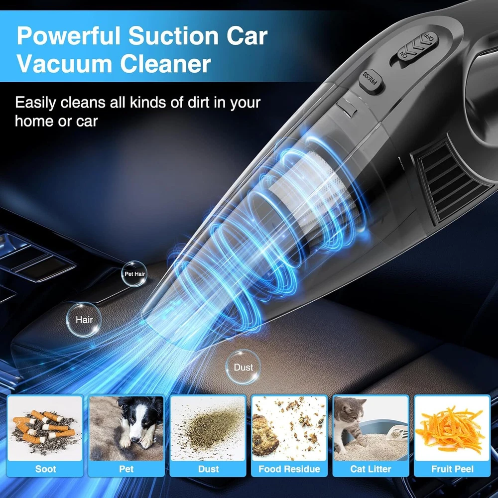 This car vacuum is a game-changer! The 11,000PA suction power picks up crumbs, pet hair, and dust effortlessly. Compact yet powerful, it plugs right into your car's 12V outlet, making cleanup a breeze. The 0.5L capacity is perfect for quick cleanups, and the cloth filter is easy to empty. Lightweight and easy to store, it's a must-have for keeping your car spotless. Highly recommend!