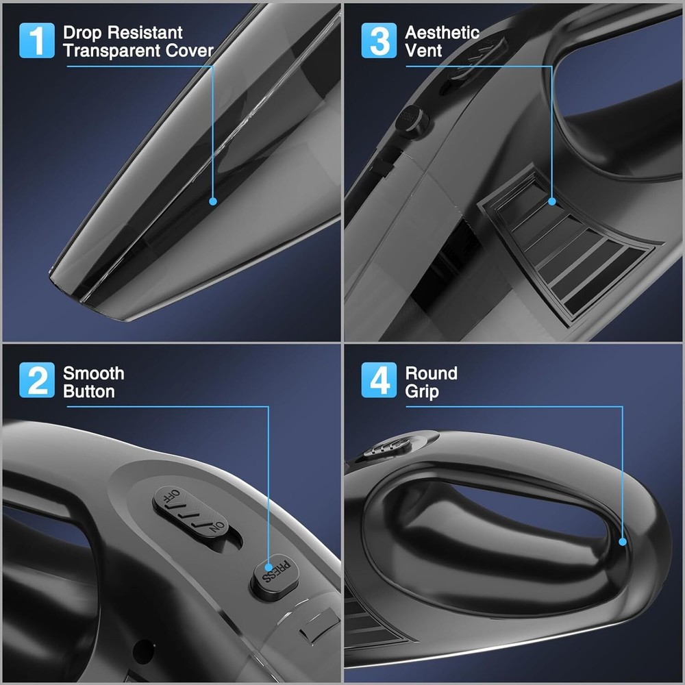 Car Vacuum,Portable Vacuum Cleaner with 11000PA Suction,DC 12V,0.5L Black Product Details Brand: suvnufk Special Feature: Car vacuum Filter Type: Cloth Included Components: Fan Blade included Capacity: 1 Pounds Form Factor: Handheld Color: Black Model Name: XCQ-001 Product Dimensions: 1"L x 1"W x 1"H Manufacturer: suvnufk Number of Items: 1 Style: English Item Weight: 1 pounds Item model number: XCQ-001 Batteries: 1 Lithium Ion batteries required. (included) Batteries required: Yes Surface RecommendationPower Source: CarpetDC VoltageItem Weight: 12 Volts16 ounces High-Powered Suction, Ideal for Daily Car Cleaning: This 12V DC car vacuum provides strong suction to quickly remove dust and debris from carpets, seats, and door mats, keeping your car interior spotless. Comprehensive Attachments for Deep Cleaning: Comes with various nozzles, including a brush and crevice tool, designed to tackle every corner and crevice within the car, ensuring no area is left uncleaned. Long Power Cord for Full Vehicle Coverage: The extended power cord connects to your car’s 12V outlet, reaching every part of your car, from the backseat to the trunk, ensuring a thorough clean. Portable Design, Perfect for On-the-Go: Compact and lightweight, easily stored in your car’s compartments, ready for use whenever and wherever you need a quick clean. Low-Noise Design for a Quiet Operation: Built with noise-reduction technology, this vacuum operates quietly, creating a more pleasant cleaning experience without disturbing the calm of your car. Ideal for maintaining a peaceful atmosphere during and after cleaning.