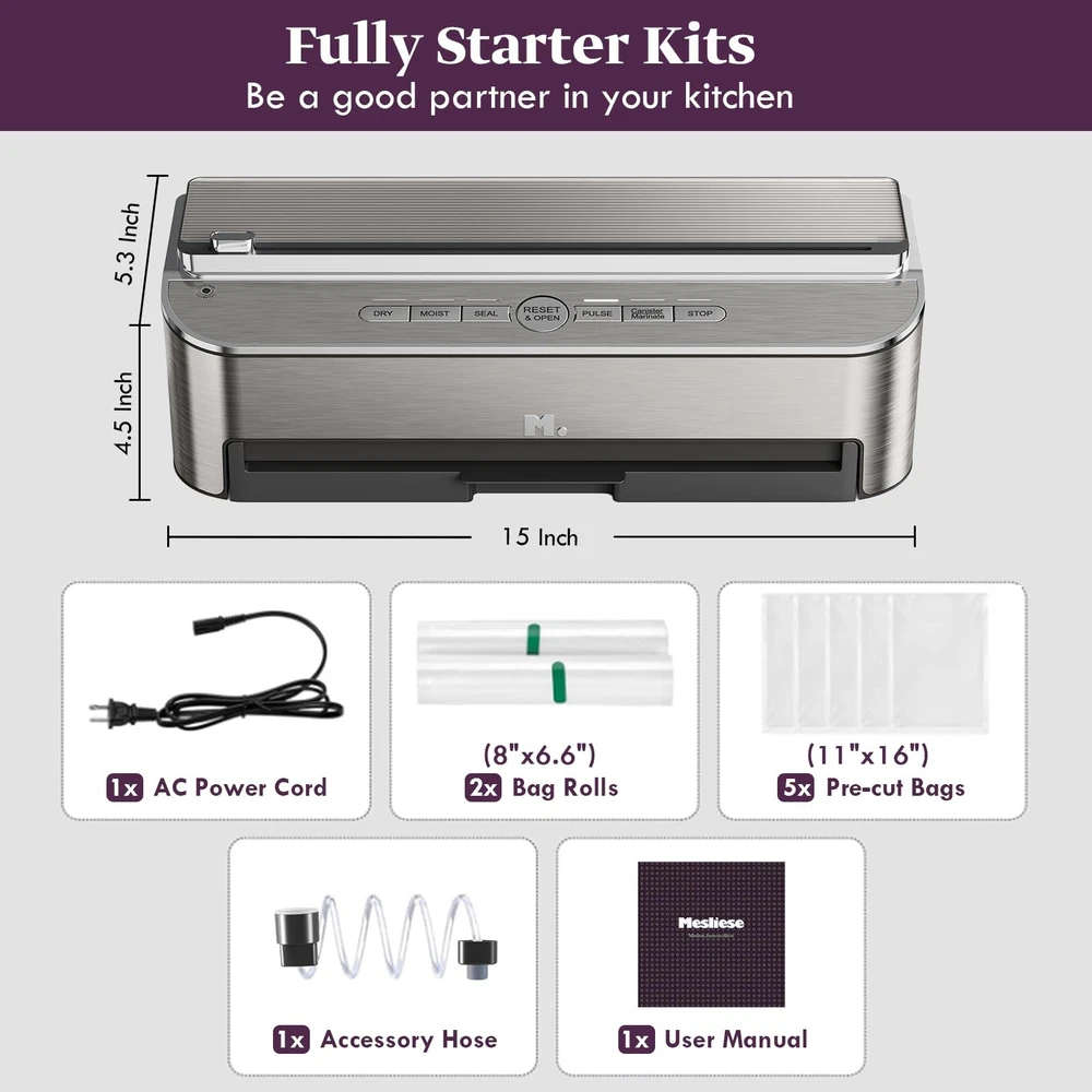 Vacuum Sealer Machine, 85kPa 120W Automatic Food Sealer, Powerful Sealing System, Build-in Cutter | Bags Storage | Moist Mode and Air Suction Hose | 2 Bag Rolls and 5pcs Pre-cut Bags 【Automatic Function Easy Operation】 DRY VAC & SEAL - For dry food, press to vacuum and seal. MOIST VAC&SEAL - For moist food, press to vacuum and seal. SEAL ONLY - One Press to seal. OPEN - Press to open the vacuum chamber cover automatically. PULSE - Control the vacuum pressure manually. EXTRA-VAC/MARINATE - For jars, canisters, wine preservation, wine preservation and marinate. CANCEL - Stop the current operation at any time. 【85kPa 120W Powerful Suction】The vacuum sealer boasts 120 watts of high power to achieve a rapid vacuum speed of 6-18 seconds. The upgraded copper core pump ensures corrosion resistance, heat resistance, and friction resistance, delivering a stable and security suction power of up to 85KPA. The vacuum sealer is ETL certified. We provide Trusted Safety Use for every of our customers. 【Built-in Cutter, Bag Storage, with Bag Rolls】 This vacuum machine is designed with a built-in Cutter, and a Storage Container for bag rolls Inside. Also, it included 2 bag rolls (8"x6.6"), 5pcs Pre-cut vacuum sealer bags, you do not need to buy the sealing bag additionally. Removable Drip Tray helps you clean the vacuum sealer easily. 【11.8" Upgrade Sealing Strip】The food sealer is equipped with 11.8-inch upgraded heat sealing strips, ensuring that every seal is perfect. It works well with sealing bags from other brands, ensuring a good sealing effect. Plus, the high-density and resilient silicone gaskets ensure that every seal is tight, this will keep food fresher for much longer. 【5 Year Warranty and Satisfied Service】You will receive 1 x vacuum sealer machine, 2 x vacuum bag rolls (8"x6.6"), 5x Pre-cut Vacuum bags (11"x16"), bags and rolls are BPA free, safe for Sous Vide, 1 x Air suction hose, 1 x User manual, We offer a 5-year warranty and friendly 24-hour customer service.