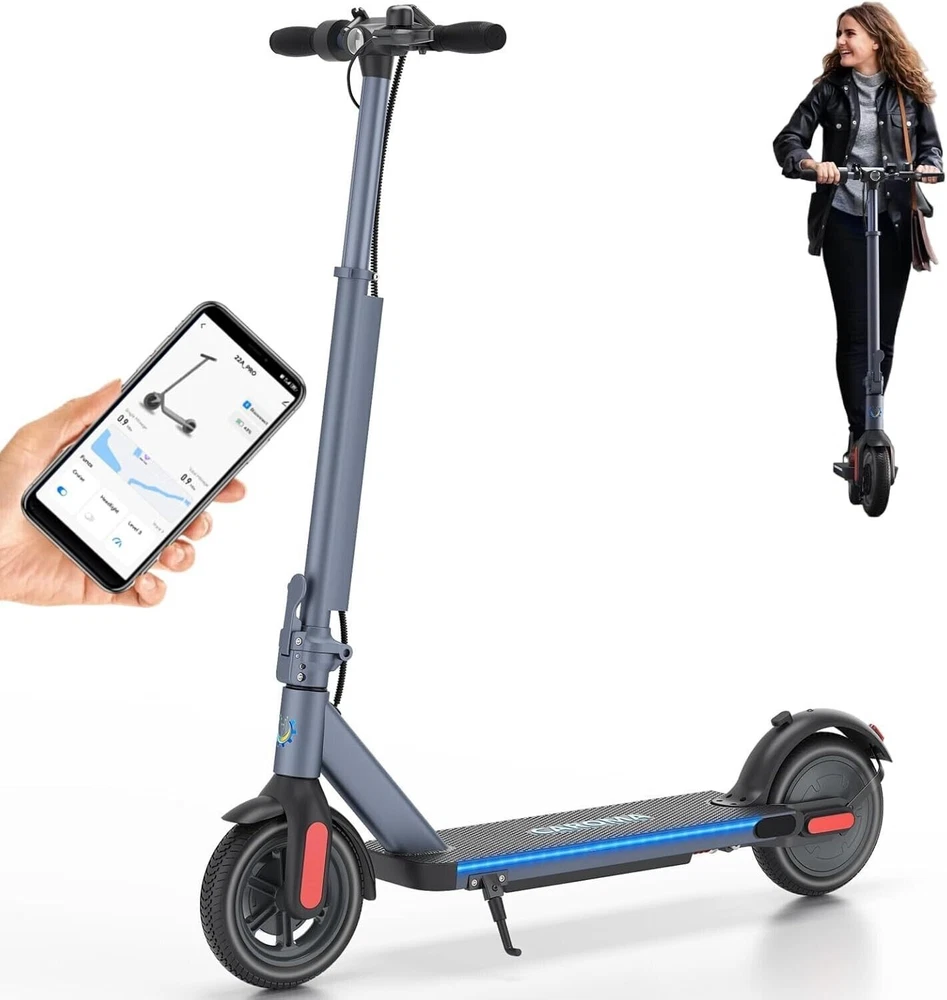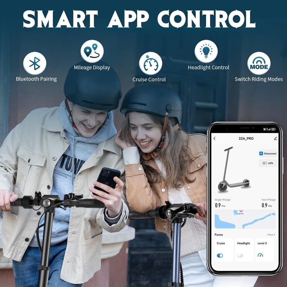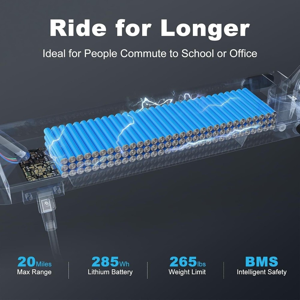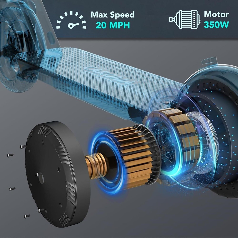 Product Description About this item Ideal Commute Partner: Caroma electric scooter is equipped with a 350W rear-wheel motor that delivers up to 630W of powerful power, which makes the scooter reach max speed 20 mph and ride on 20° max slope easily. Thanks to the 285Wh large capacity battery and superior battery management system, you can reach travel range up to max 20 miles. Caroma electric scooter adults can take you anywhere in the city and is also the perfect solution for the last mile of your commute Comfortable and Safe Riding: Auto Triple Lighting System(automatic headlight, taillight & pedal light) lights up road of night riding. Adjustable height handlebar (40" - 46") fits for teens and adults. 9" honeycomb solid tires are explosion-proof, anti-puncture and self-healing. Rear Shock Absorber brings up comfortable riding experience. Dual braking system(EABS & Drum braking) make sure riders can safely stop scooter in seconds Intelligent APP Control: Connect the mobile app to the electric scooter's Bluetooth. You can control speed mode, cruise control, headlight and pedal light. At the same time, you can record the data of each ride, so that you can easily enjoy riding LED Display and Three Speed Modes: The LED display shows real-time speed, battery life, speed mode and cruise control. With multifunctional button console, riders can easily control headlight, switch speed mode, activate cruise control. In order to meet the different needs of use from teens to adults, the electric scooter is equipped with 3 speed gears: 9.3 mph/15.5 mph/20 mph Folding Portable Design: This adult electric scooter features an convenient one step folding system, and the weight of the electric scooter is only 34.7 lbs. The folded size is 44.5" x 18.5" x 19.7". It's great convenience for storage and portability, you can take it on the subway, bus and trunk of car Tip: Actual range is affected by different loads, road conditions, temperature conditions and riding habits.