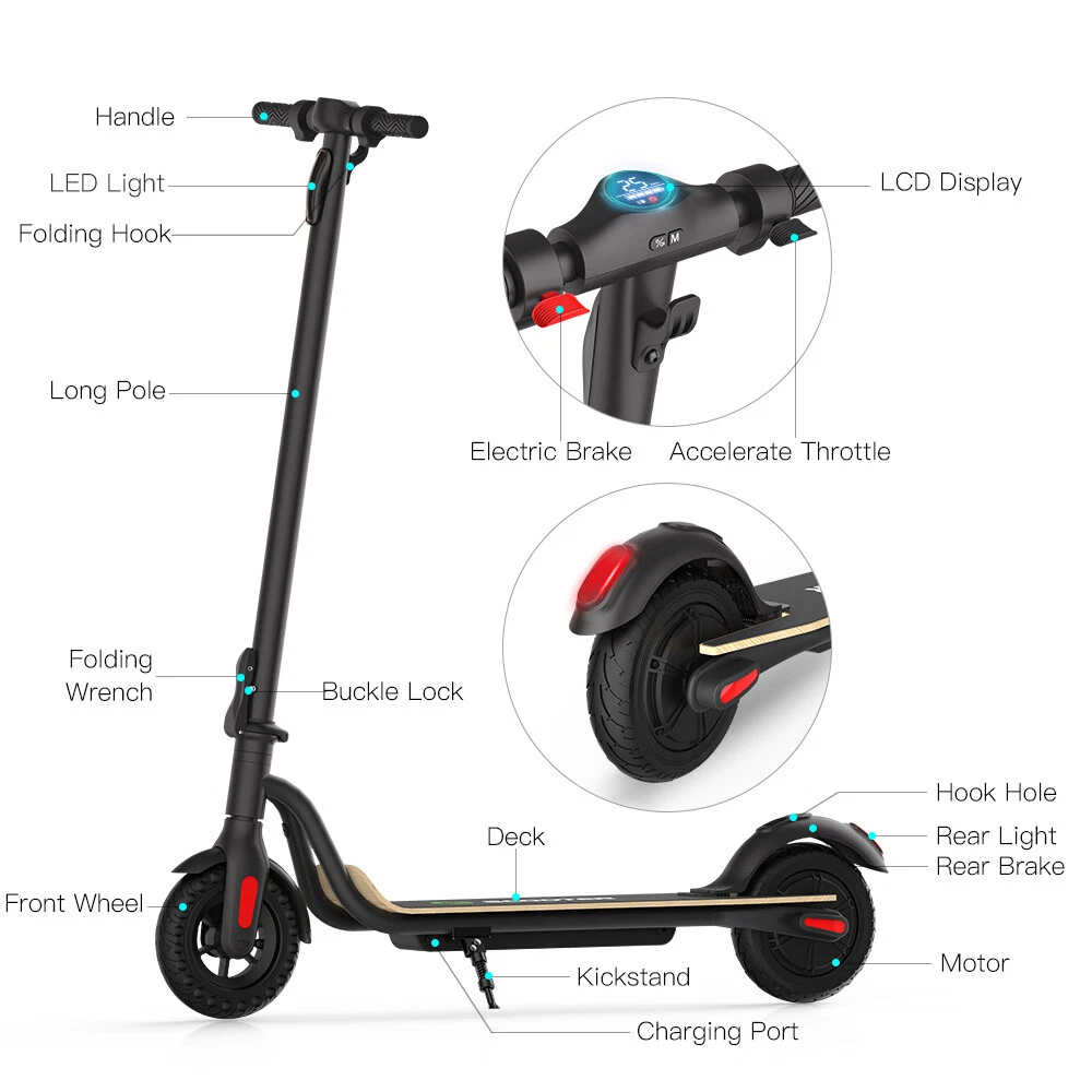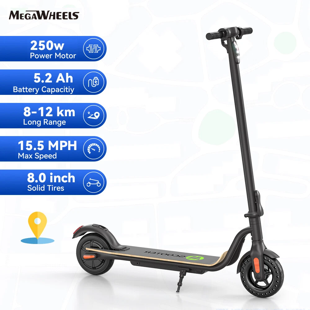 Main features: LONG RANGE BATTERY LIFE - Powerful 250W motor and 5.2 Ah/36V lithium battery pack that supports a speed of up to 15.5 Mph with a range up to 7 Miles. Updated large-capacity battery life, designed for commuters and longer distances. 8.0" HONEYCOMB & SOLID TIRES - Shock-absorbing rubber tires offer a smooth ride even over bumpy surfaces. PORTABLE FOLDING DESIGN - Electric scooter can be folded easily in 3 seconds with quick folding latch for easy carrying and storage. BATTERY INDICATOR AND LIGHTS - Battery indicator keeps to track battery life. Ultra bright LED headlight and taillight. Fast recharging about 5 hours. GEAR SHIFT SETTING - 1st gear for a 7.5 Mph comfortable ride or 3rd gear to get the 15.5 Mph fast experience. Extremely fun to ride and end boring commutes. Specification: Brand: Megawheels Model: S10 Dimension: Unfolding 105 x 43 x 118 cm; Folding: 105 x 43 x 48 cm Net Weight: 11.9kg Color: Black Frame Material: Aluminium Tires: 8.0" Honeycomb Front Tire & Solid Rear Tire Max Load: 100kg Max speed: 25KM/h Speed level: Gear 1--Max 10km/h ; Gear 2--Max 20km/h; Gear 3--Max 25km/h Mileage: 8-12km Grade Ability: 20 degree slope Working Temperature: -15°C-50°C Storage Temperature: -20°C-25°C Mode Type of Motor: Brushless hub motor Battery Type: High quality lithium battery Battery Capacitiy: 5.2 Ah Battery Voltage: 36V Charger Input Voltage: 100V-240V Charger Frequent: 50Hz/60Hz Charging time: 4 hours Package Contents: 1 * Folding Electric Scooter 1 * Battery Charger 1 * User's Manual Riding Skills: -Put your foot in the front of the scooter and the other foot on the floor before riding. -Make sure that the riding route is smooth. -Slide forward with the food standing on the floor before starting (like riding the scooter without power). -Immediately press the acceleration button and lean forward to avoid falling over backward due to inertia, so that the electric scooter will enter the working status. -Avoid pressing the handle with your body in the acceleration and deceleration process. Put one foot ahead and the other behind (like on the sliding plate/surfboard, put one foot ahead and the other behind by 70-90 for better comfort). -Turning – The turning principle of the electric scooter is the same with that of surfboard/sliding plate/skis. The handle shall be balanced with the body. Observe and make sure that turning is safe before turning. Tips: Before riding the scooter, please put one foot on the scooter deck and the other foot on floor and push the scooter forward by kicking the floor for some distance, in this way, the scooter will get some impulse to run forward. Note: This products have been certified under UL2272 safety standards.