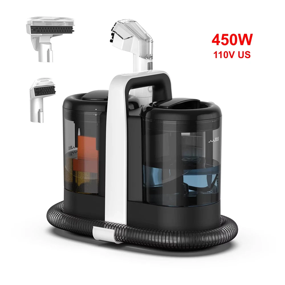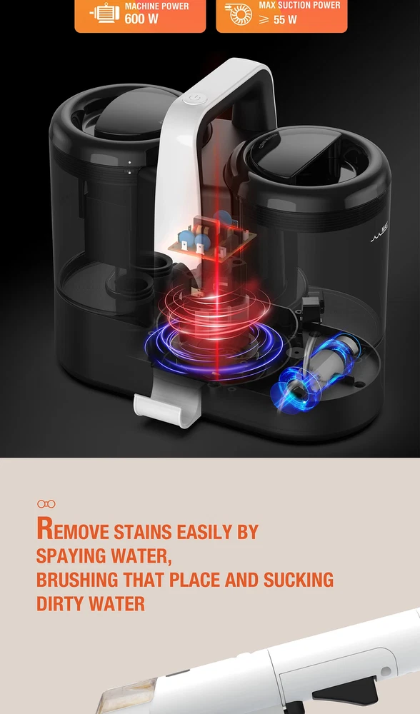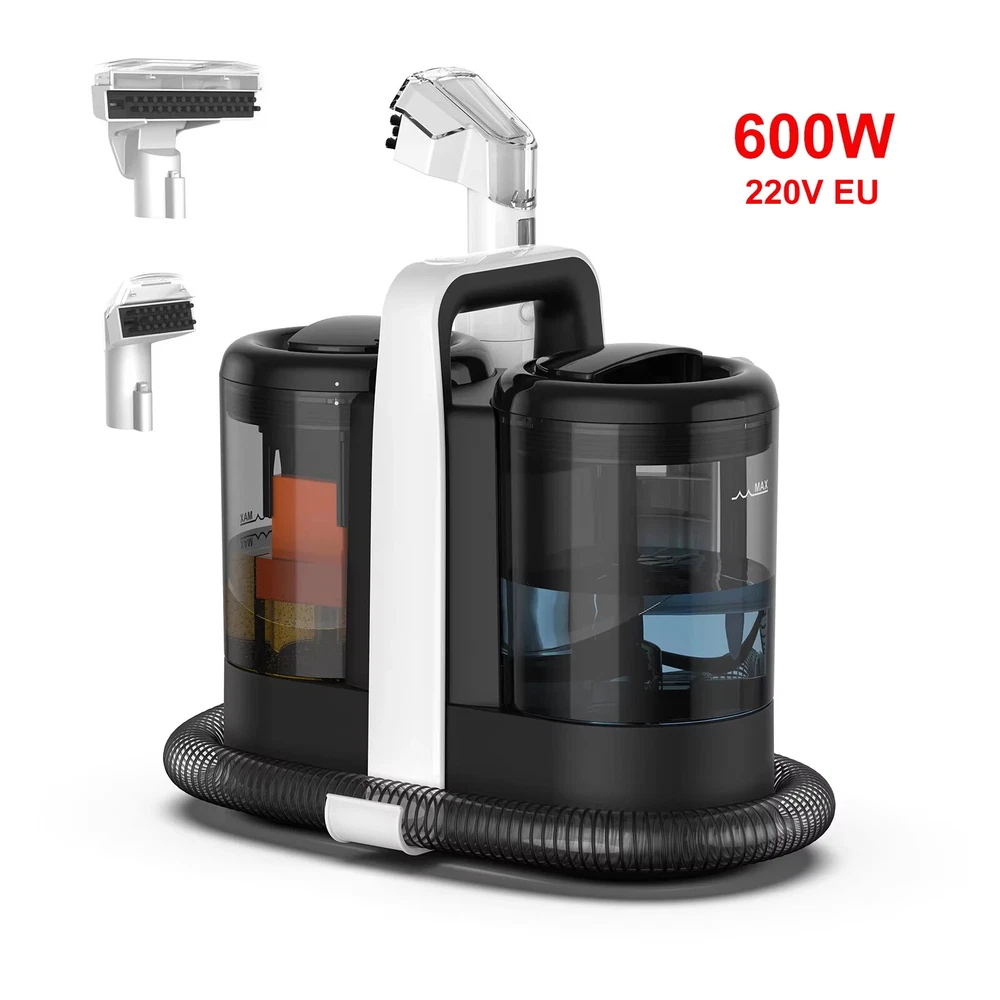 Spot Cleaner 600/450W 15/11KPa Handheld Carpet Cleaner for Sofa Curtain Spray Suction Integrated Machine Clean Machine Rated inlet power:450/600W Max Suction:11/15Kpa Rated Voltage:220-240V(EU)/110V(US) Rated Frequency:50/60Hz Max air flow:≥11.5 l/s Suction Water Speed(Big brush):400 ml/min Suction Water Speed(Small brush):370 ml/min Sound power noise:≤80 dB(A) Protection Class:IPX4 Certification:CE,CB Clear Water Tank Capacity:1500ml Dirty Water Tank Capacity:700ml Power Cord Length:3.0m Hose Specification: ø32,1.2m