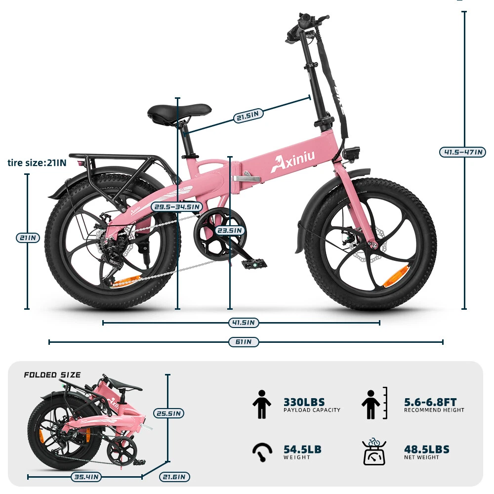 Store Categories Store Categories LED Work Light LED Light Bar LED Headlight LED Whip Light Led Fog Light Front&rear Bumpers Mount Bracket Home & Garden Children Toy discount items Business & Industrial E-bike UTV Accessories Other About this item 【Foldable & lightweight 】Axiniu foldable electric bikes Crafted from strong , aluminum alloy. Aluminum frames are lighter(Weighs: 50lbs / 45lbs without battery), stiffer, more aerodynamic, and more efficient. They also do not corrode. This adult electric bike can be easily folded and stored into the trunk of a car or brought into the subway, making it the best commute and travel companion. (Folded size:35.4*21.6*25.5inch) 【6 Spoke Wheels Fat Tires】20"*3.0" fat tires provide stronger grip and traction, Aluminium rims are lighter and stiffer than steel ones. In terms of durability, 6 spoke wheels are typically more robust than traditional wheels. Their solid construction makes them less prone to damage and deformation. Which makes your foldable electric Bike for adults conquer all kinds of rough terrain 【UL Certified Li-ion Battery】Enjoy long-distance riding with the 360WH 10Ah lithium-ion battery, allowing for up to 25-35 miles pure electric or 35-45 miles PAS range (Depends on load,slope,speed, temperature and surroundings). Our commitment to safety has been recognized by GCC through certifications UL 2849 (for the whole e bike) 【Powerful Riding Performance】The adult foldable electric bike is powered by 850W Peak brushless motor with a top speed of 25MPH. Explore 3 riding modes for a fulfilling journey! Effortlessly cruise, exercise, or commute seamlessly – we have you covered. Select Pure Electric Mode, Pedal-Assist Mode, or ride like a normal bike, tailoring your mode to match the purpose of your journey. 【Reliable Components】The 7-speed gear system, Dual disc brakes ensure potent stopping, enhancing safety and comfort. Enhanced visibility via bell, The bright headlight and rear light ensures night rides are as secure as daytime. With these safety elements, ride confidently regardless of time or road conditions. 【Easy To Install】Axiniu Cityrun Electric Bike is 95% pre-assembled with instructions and tools included.The installation video is attached to our product page. Features: 48V/10.4Ah Removable Built-in Lithium-ion Battery 850W Powerful Brushless Motor Large Intuitive LCD Display & Adjustable handlebar Customer questions & answers Package: 1 X Electric Bicycle with Battery 1x Free Lock 1x battery charger The item is UL 2849 certified Payment Shipping Returns Contact us Feedback Payment We only accept payment via eBay by PAYPAL . Item will be shipped out within 24-48 hours after payment completed. Please make sure your eBay address is correct before you pay. All the unpaid case will automatically opened after 4 days because the ebay final value charge of the transaction. Shipping United States Shipped by USPS/UPS/Fedex , usually takes 3-7 working days to complete delivery. Package will be sent out within 24-48 hours after the pament is cleared. Pick-up is unsupported service. We will not be responsible for any delivery failure due to unclear address. Delivery is not available on weekends, public holidays or after business hours. Returns We will accept returns or refund or exchange if they are unused and unmarked within 60 days . If you received wrong of defective products, please take photos and contact us to confirm. We must protect your interest as promsied. Remember to contact us via eBay message firstly. Please don't open the return request. Thanks in advance! Contact us Office Opening Times: Monday to Friday-9:00AM-18:00PM Beijing Time. We do our best to respond within 12-24 hrs. If no response within 24 hrs, please check the spam in your mail box. Ask us about bulk discounts if you want to buy 3 or more. Our store is good ebay seller and we are renowned auto suppliers seller in China who had earned the highest feedback on high quality we have factory in HongKong. Our Company is a Branch company that of a manufacturer which producing the lighting equipment and accessories for vehicles. We move and in charge our main business in E-commerce on eBay nowadays. Feedback We apprecaite your business and strived to improve our customer service and our commitment to quality. We will leave a postive feedback immediately after payment is received. We appreciate a positive feedback as much as you do. Please do NOT leave negative or neutral feedback. If for some reason there is any issue with the purchase, please contact us prior to leaving feedback, and we will be glad to work with you to have it resolved.