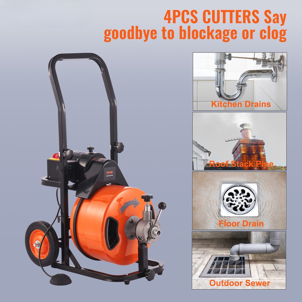 A re you tired of clogged drainage pipes, expensive plumbing services, and incomplete unclogging? Say bye to unpleasant smells and trouble maintenance! Let the electric drain cleaning machine with 50 FT x 1/2 In solid core cable solve all your blockage problems in one go without any worries! Features & Details Apply Anywhere: Versatile drain cleaner machine comes with 4 interchangeable cutters: arrow cutter, spade cutter, c-cutter, and boring bulb cutter. It can effectively tackle clogs in pipes, floor drains, sinks, toilets, and more. This sewer machine eliminates unpleasant odors, making it perfect for use in homes, properties, restaurants, factories, and schools. Attack Stubborn Clogs: Our 50FT x 1/2" sewer snake machine steel core cable is resistant to breakage, twisting, and corrosion, making it easy to navigate through complex curved pipes, leaving them free of blockages. This cable is perfectly suited for 1 inch to 4 inch pipes and prevents any frustrating entanglements or knotting during use, ensuring a smooth and efficient cleaning process. Effortless to Use: Features an automatic feed control system to power the cable in and out of drainage pipes. The CW/OFF/CCW knob and air-activated foot switch make it easy to control the cable. With this system, even one person can efficiently clear blockages with less effort. Compact & Portable: The electric drain auger is small in size and lightweight, making it easy to move around. Its 8-inch shock-absorbing wheels enable effortless use on stairs and other uneven surfaces. Additionally, the retractable handle reduces fatigue and provides a comfortable grip, while making it convenient to store when not in use. Boast Durability and Security: Our powerful drain auger cleaner, which boasts a high-quality motor with a speed of 1800RPM, is ready for anything. It features a semi-enclosed drum that allows for easy observation of the remaining cable length, as well as an upgraded steel frame with a special coating that prevents rust and extends its lifespan. Additionally, it comes with an integrated GFCI to protect operators from electric shock.