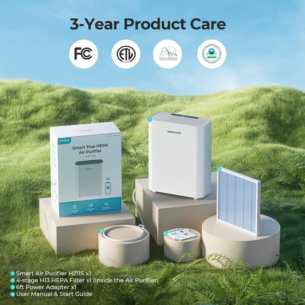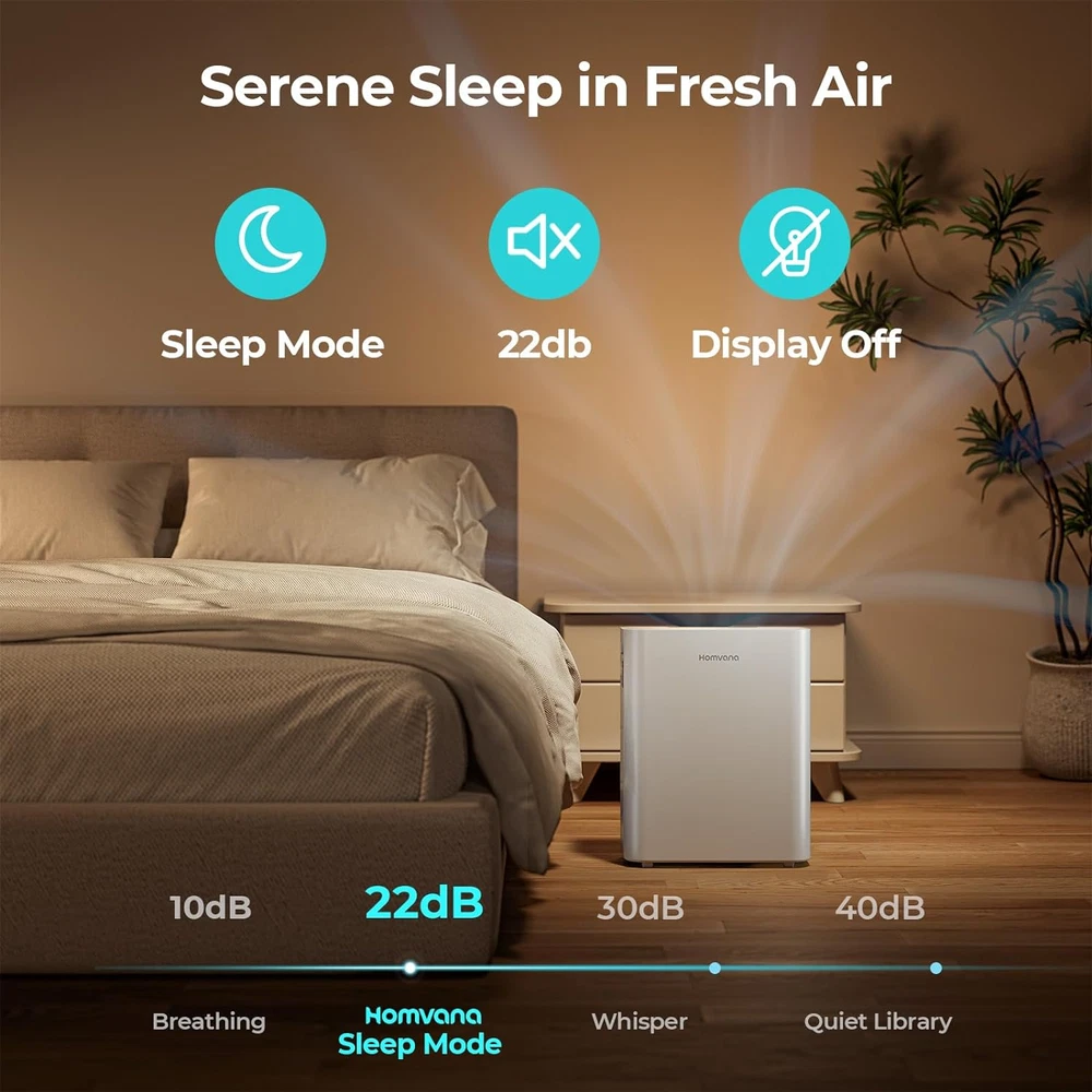 【Powerful for Rooms up to 1250ft²】With a peak-performing CADR of 142 CFM / 240 m³/h, Homvana Smart Air Purifier H211 clears air in 270 ft² in 12mins, 645ft² in 30mins, and 1250ft² in 60mins. For your larger room such as a living room, open kitchen, loft apartment or basement, one choice to solve them all! 【4-Stage Defense with H13 True HEPA Filter】 High-efficiency 4-stage filtration helps people with asthma and allergies. It includes the H13 True HEPA Filter, which captures 99.97% of airborne contaminants of 0.1 microns, like dust, pollen, smoke, pet dander, etc. Search for "B09R1GHVKF" on Amazon to purchase official filters. 【Real-time Air Quality Indicator】Know the real-time air quality and see the changes in air quality at a glance of the distinct indicators like Green(Very Good), Blue(Good), Orange(Moderate), Red(Bad), with the help of the advanced infrared sensor. 【Smart Auto Mode】Tap the Auto Mode, and the purifier will auto-optimize the fan speed based on the surrounding air quality, providing clean, fresh air to your home without any worries about manually adjusting, especially when with a baby or hands full of stuff. 【22dB SilentAir, Undisturbed Sleep】Thanks to the exclusive SilentAir tech, you can enjoy undisturbed sleep with Homvana's sleep mode on both the device panel and the Homvana App, which operates at a level as low as 22dB, even quieter than a whisper. Also, you can turn off all lights with the Display Off button. You deserve this pure and silent air and sweet night. Product Description 2/4/8H Timer Set a timer for 2, 4 or 8 hours to perfectly fit for your schedule. Maintain powerful purification when necessary, and save energy when sleeping or going out. Filter Change Reminder The Display/Filter button, with its red button light, reminds you the time to change filter after 3-5 months of use, depending on your usage. Search for "B09R1GHVKF". 3 Fan Speeds Comes with 3 adjustable fan speed settings from Low, Medium to High, to find your optimal fan speed to tackle different purification needs.