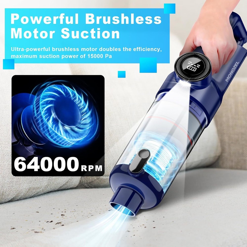 Handheld Vacuum Cordless - Car Cleaner with Brushless Motor, Purple Product Details Brand: MONOZEL Special Feature: Lightweight, Cordless Filter Type: HEPA Filter Included Components: Adaptor Is Cordless?: Yes Capacity: 1.4 Liters Runtime: 26 minutes Charging Time: 4 Hours Recommended Uses For Product: Carpet, Home, Car Color: Purple Model Name: VC028 Product Dimensions: 13.8"L x 3.9"W x 3.15"H Manufacturer: MONOZEL Number of Items: 1 Controller Type: Push Button Control Method: Touch Portable: Yes Number of Handles: 1 Number of Power Levels: 2 Indoor/Outdoor Usage: Indoor Item Weight: 2.09 pounds Item model number: VC028 Batteries required: No Surface RecommendationPower Source: All floorsBattery Powered VoltageForm Factor: 5Handheld 15000Pa SUCTION AND BRUSHLESS MOTOR: Built with the upgraded brushless motor, our hand held vacuum cleaner has a suction up to 15000Pa(Max mode), very powerful!!! It also has an Eco mode of 10000Pa for simple cleaning tasks. It can help you to do all-around cleaning with a powerful motor and long battery life. The portable vacuum cleaner cleans dust, crumbs, and pet hair from carpets, living rooms, kitchens, and offices with outstanding performance. LONG BATTERY LIFE AND FAST CHARGING: With multiple 2000mAh*3 batteries and quick charge tech, the battery life is extended by about 26 minutes when fully charged for 4 hours. The LED light on your cordless car vacuum works well to illuminate those dark, hard-to-see places. Only need to press the switch and it will start working, don't have to hold it down with your hands, which is very convenient. FULL PROFESSIONAL ACCESSORIES: The brush tool can clean hair and dust that is on the surface, and the crevice nozzle tool can be used to clean sofas, crevices, and corners. An extension tube can dust baseboards, blinds, and those pesky cobwebs in the ceiling corners. Any inch of your house/car can be covered with the full accessories. Perfect for those who have pets also. It comes with 2 reusable durable HEPA filters to meet your usage needs. The included adapter can better protect charging. EASY TO CLEAN: With just one click dismantling, you can easily dump garbage and clean the Vacuum Cleaner. Only weighs 1.4lb, portable and easy to hold. The enhanced HEPA filter can be washed and reused, ensuring efficient suction power while keeping dust and dirt outside to prevent blockage. Please dry it before putting it back into the vacuum.
