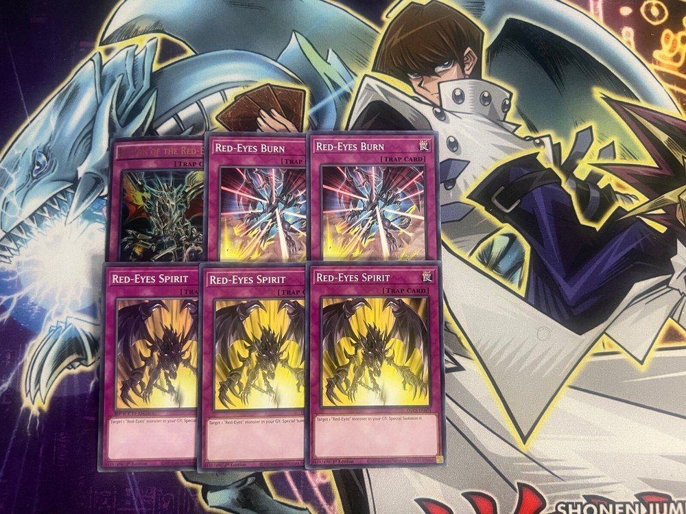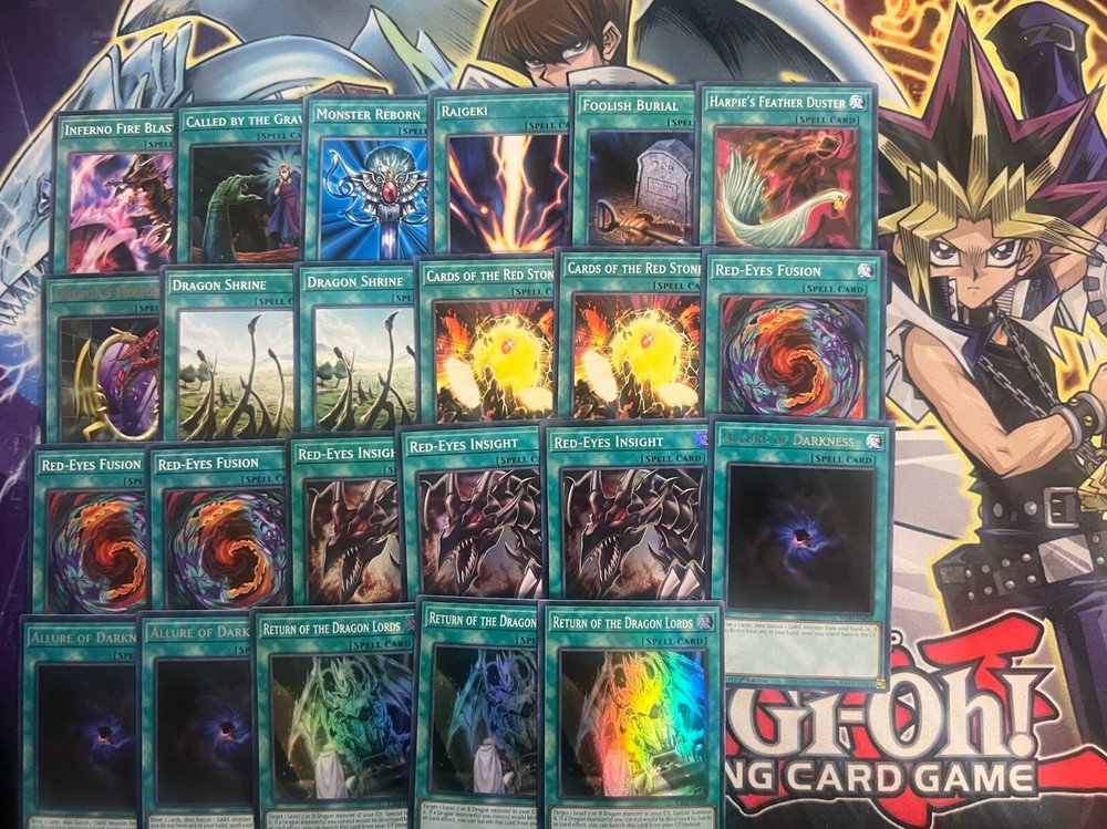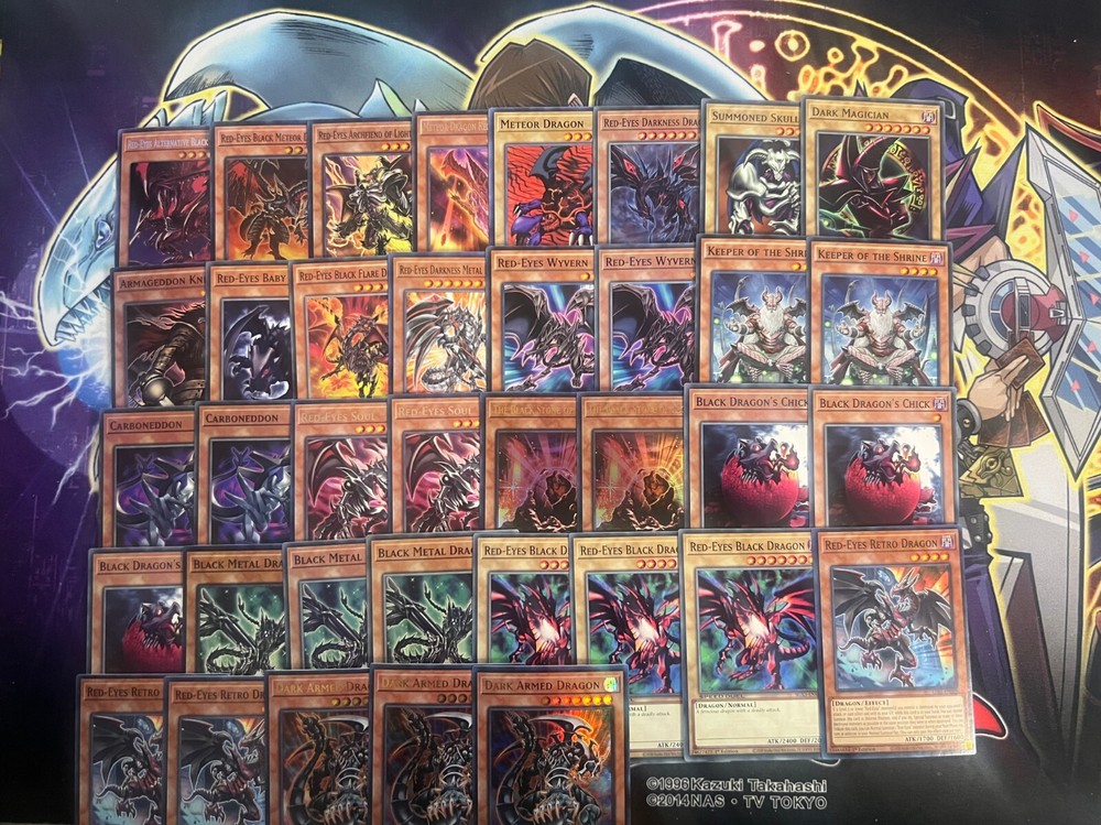 Hello! You are purchasing the deck list below, the cards will be English, real, and near mint to light play condition at worst. All decks are built with the lowest rarities for cards in mind to keep the price of the deck low and affordable for all duelists! Some cards may be in speed duel printing if this is the cheapest available copy of the card, but do not worry these are real cards and legal for tournament use! Purchase with confidence and safety! As an added bonus one pack of card sleeves will be included with your deck! Thanks again and good luck dueling! Now here's the decklist; Monsters: 1| Red-Eyes Alternative Black Dragon 1| Dark Magician 1| Summoned Skull 1| Red-Eyes Darkness Dragon 1| Meteor Dragon 1| Meteor Dragon Red-Eyes Impact 1| Red-Eyes Archfiend of Lightning 1| Red-Eyes Black Meteor Dragon 1| Red-Eyes Darkness Metal Dragon 1| Red-Eyes Black Flare Dragon 1| Red-Eyes Baby Dragon 1| Armageddon Knight 2| The Black Stone of Legend 2| Red-Eyes Soul 2| Carboneddon 2| Keeper of the Shrine 2| Red-Eyes Wyvern 3| Dark Armed Dragon 3| Red-Eyes Retro Dragon 3| Red-Eyes B. Dragon 3| Black Metal Dragon 3| Red-Eyes B. Chick (Black Dragon's Chick) Spells; 1| Dragon's Mirror 1| Harpie's Feather Duster 1| Foolish Burial 1| Raigeki 1| Monster Reborn 1| Called By The Grave 1| Inferno Fire Blast 2| Cards of the Red Stone 2| Dragon Shrine 3| Return of the Dragon Lords 3| Allure of Darkness 3| Red-Eyes Insight 3| Red-Eyes Fusion Traps: 1| Return of the Red-Eyes 2| Red-Eyes Burn 3| Red-Eyes Spirit Extra Deck: 1| Meteor Black Dragon 1| B. Skull Dragon 2| Red-Eyes Dark Dragoon 2| Red-Eyes Flare Metal Dragon 2| Archfiend Black Skull Dragon