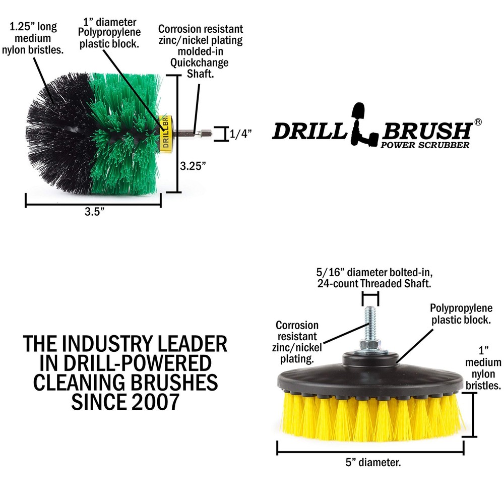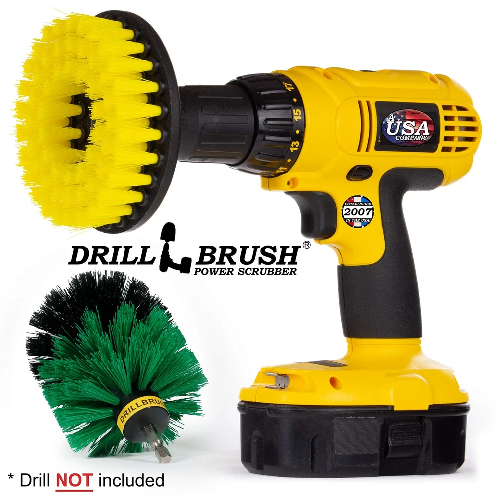 Our power scrubber drill brush kit can be used as a power scrubber for shower walls and floors effectively becoming your best shower cleaner. Need a grout cleaner brush that our spin brush for cleaning bathroom has got you covered. Using the power of your cordless drill you have the cleaning power of a floor scrubber machine with brushes that will not scratch or damage your bathroom. The yellow drill brush flat spinning brush works great as a floor brush to clean large areas like bathroom floor tile and grout lines. Use the rounded original style green medium stiffness cleaning brush is perfect for rounded corners in bathtubs, sinks, and shower stalls. Together they can outperform any other floor scrub brush, grout brush for tile floors, shower cleaner brush, or bathtub brush. All Products have a 90 day no questions asked return window. If you are not completely satisfied with our product we will issue a refund or ship out a replacement at the buyer's request. Cordless Drill NOT included Get ready to save time and effort with these drill brush attachment bathroom cleaning supplies. These drill brushes will become some of your most used bathroom gadgets as you start cleaning faster and easier than ever before. Replace your existing toilet cleaner, bathroom cleaner, and tile floor scrubber forever with the power and speed of these cleaning brushes. These drill scrub brushes work great as a grout cleaner for tile floors Each drill scrub brush attachment will attach to almost any cordless drill and turn your household drill into the ultimate cleaning machine. Save time and effort cleaning your shower floor, bathtub, or toilet These medium stiffness cleaning brushes are the perfect gadgets for home cleaning. Use your cordless power scrubber attachments as a tile and grout cleaner All Products have a 90 day no questions asked return window. If you are not completely satisfied with our product we will issue a refund or ship out a replacement at the buyer's request. Cordless Drill NOT included