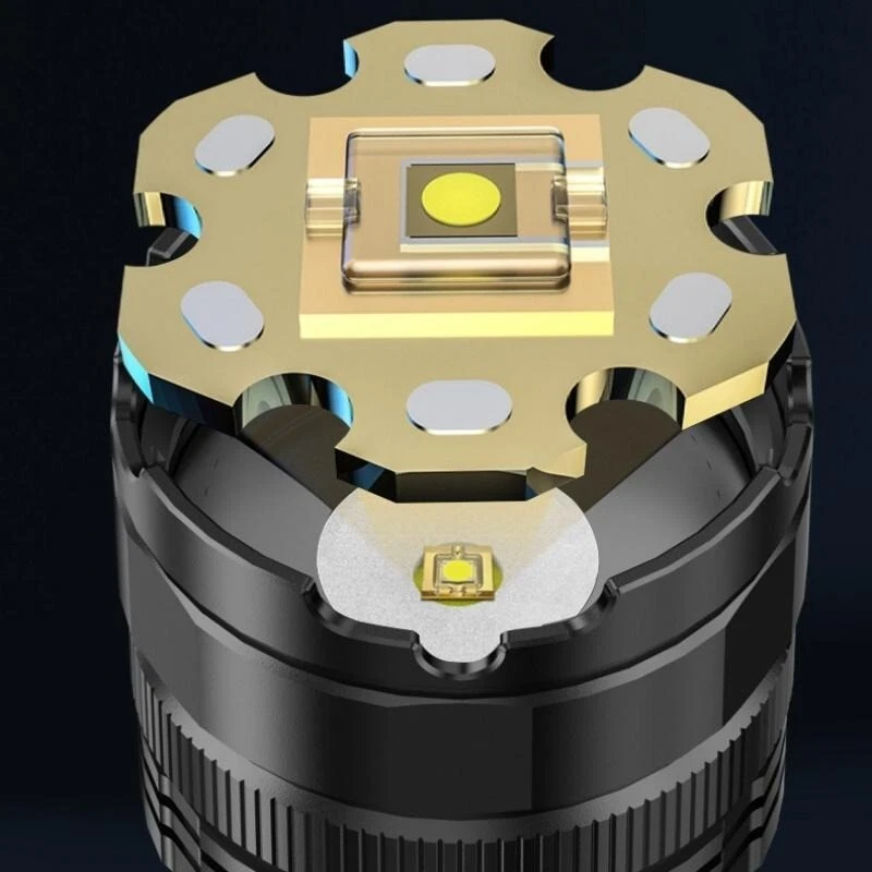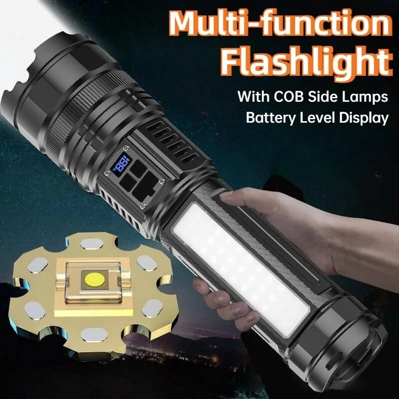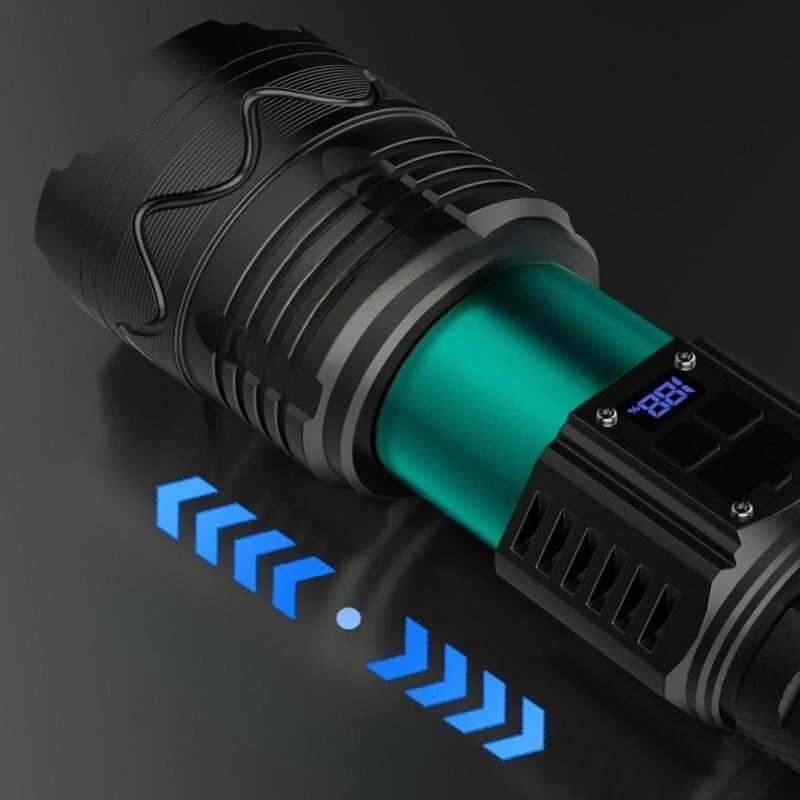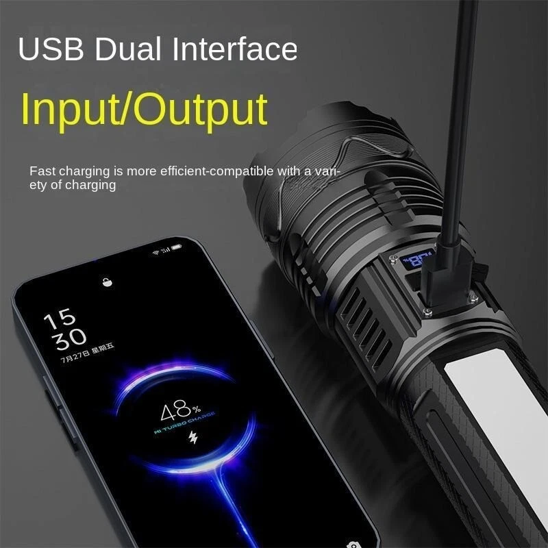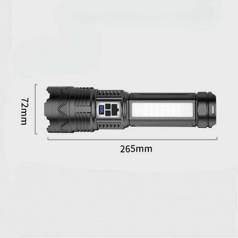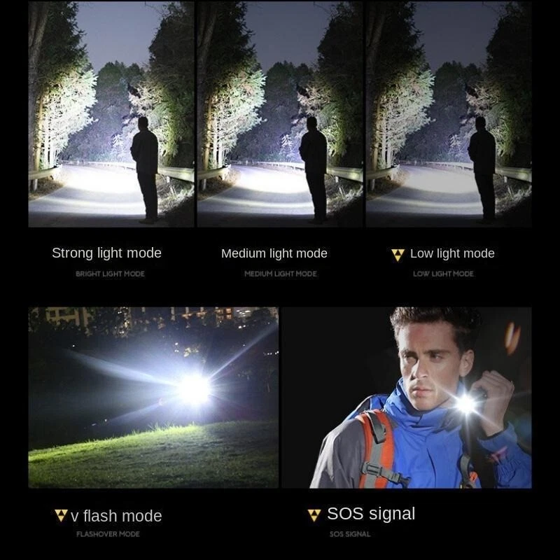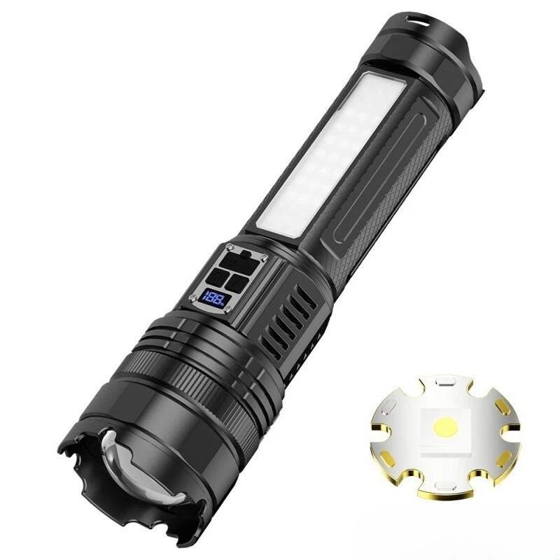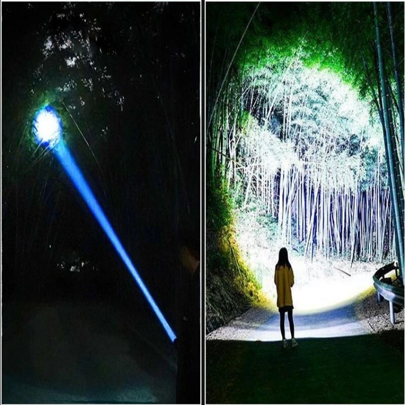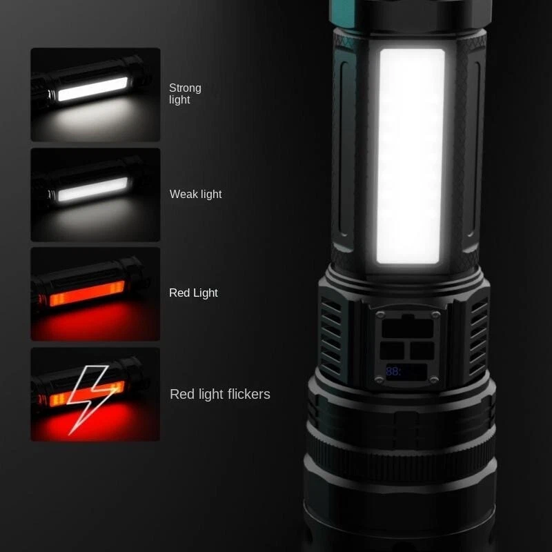 Product Features: 1, Super bright white laser wick, built-in high-capacity lithium battery, large floodlight, poly far shot. 2, Multi-functional work side light, strong light - low light - red light - red light flashing 3, Power reminder, digital display 4, USB dual interface, fast charging more efficient. 5, 5 lighting modes: strong light - medium light - low light - burst flash - SOS 6, Far and near zoom light head, telescopic adjustment. Adjust different lighting modes 7, IPX6 grade life waterproof, adapt to any harsh environment. Friendly note: Keep the white laser out of your eyes.