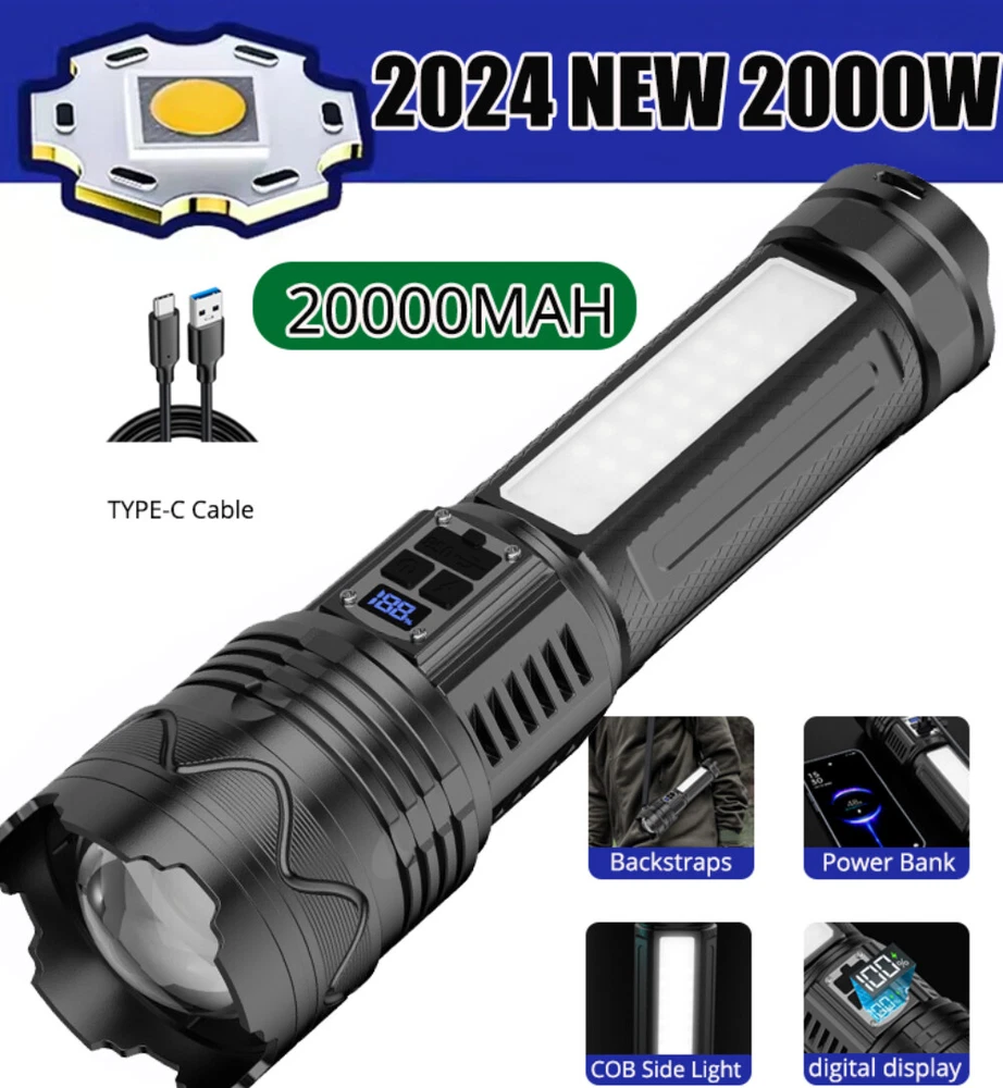 UPC: Does not apply IP Rating: IP65 Features: Batteries Included, Rechargeable, Waterproof Lighting Technology: LED Brand: Unbranded Lumens: 300000LM Material: Plastic Country/Region of Manufacture: China Color: Black Battery Technology: 18650 Number of Batteries: 3 MPN: Does not apply Type: Flashlight Power Source: Battery Personalize: No gtin13: Does not apply