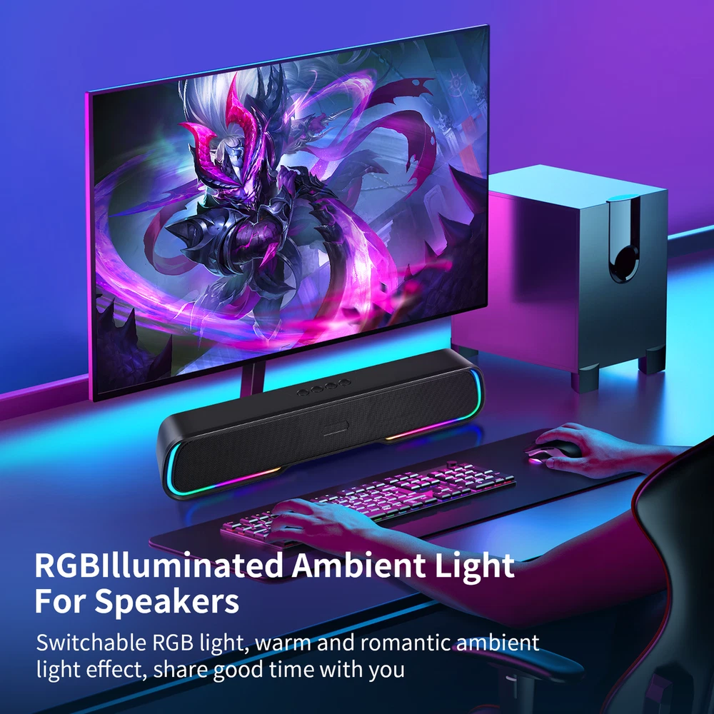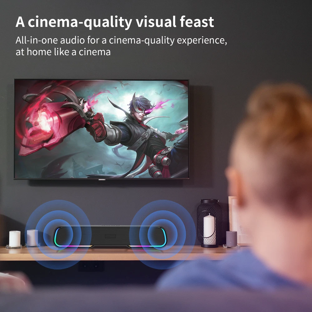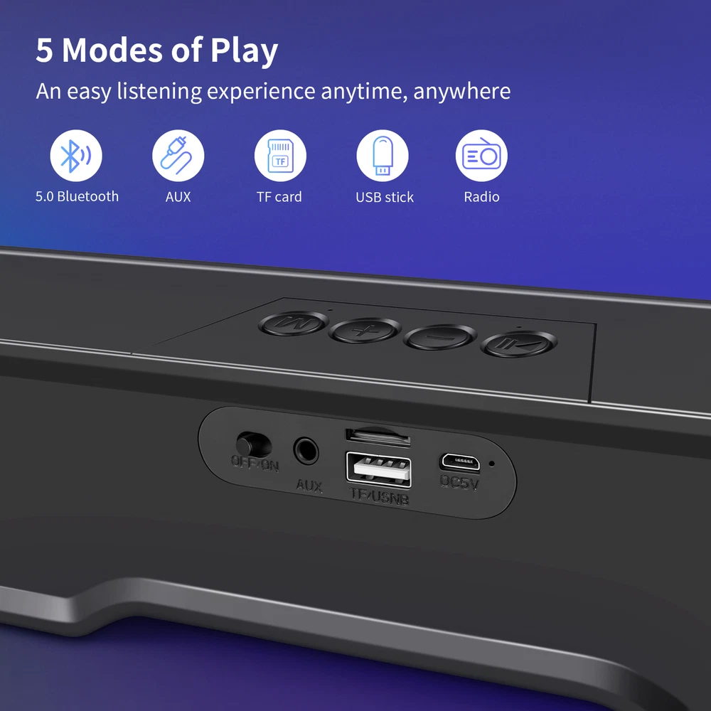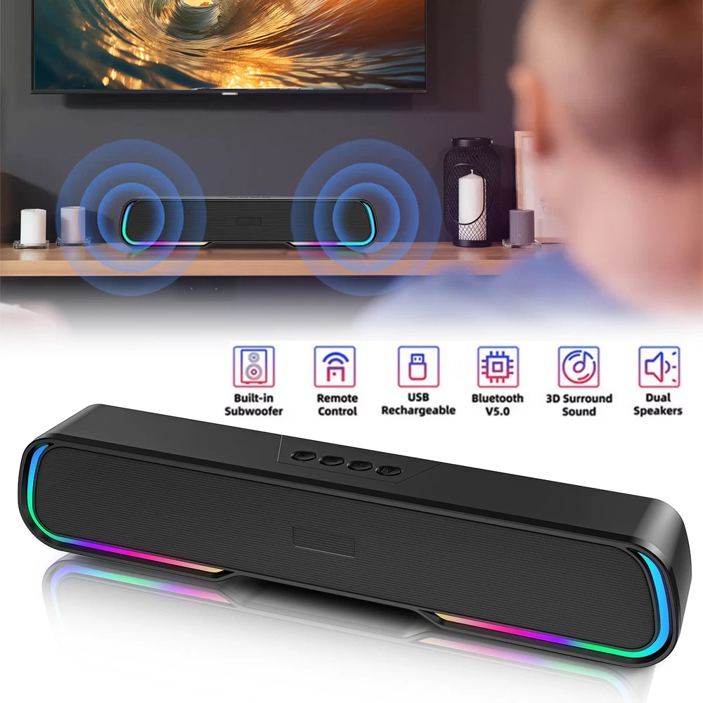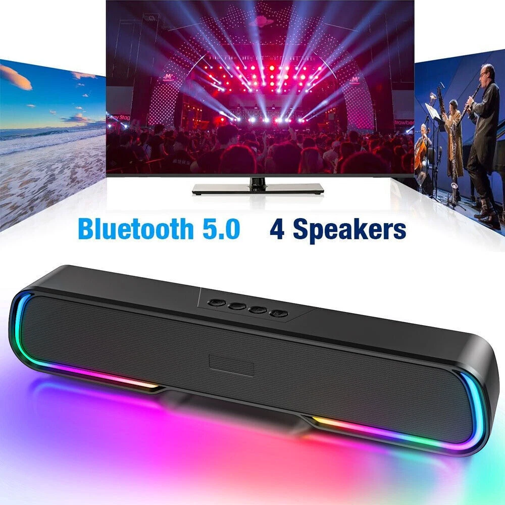 Features: 【HiFi & Stereo Sound】 【2 Connection Methods】 【Color-changing lighting effect】 【Multiple playback modes】 Specifications: Radio function: 87.5—108.0 MHz Input voltage: 5V (USB-B) Lithium battery: 3.7V 2000mAh Material: fiberboard + PC plastic Speaker power: 5W Number of speakers: 4 Frequency: 80-16000Hz Distortion: <3% Signal to noise ratio:> 75dB (A weight) Control mode: remote control / button Remote control distance: 6m Protection rating: IP20 Working temperature: -25°C-40°C Product size: about 37.2/7/5.5cm Product net weight: about 0.712Kg Packing List: 1*Sound Bar Powerful TV Sound Bar Home Theater Subwoofer Soundbar with Bluetooth Wireless Features: 【HiFi & Stereo Sound】Our sound bar is designed with four 52 mm/2.05 inch (approx.) external magnetic speakers to deliver powerful sound, provide you with enjoyable stereo experience when you enjoying indoor movies, videos, music and games. With Delivers immersive stereo sound for breathtaking audio you'll enjoy a crisper, more immersive audio journey. 【2 Connection Methods】Our pc speakers support 2 connection methods which are Bluetooth and AUX wired connection, connects effortlessly with your preferred device. 3.5mm audio cable for connecting to TV, suitable for various devices such as TV, PC, laptop and smart phone. Wireless pairing version 5.0 can ensure fast pairing, and compatibility with various devices. This sound bar has 10m wireless pairing support for seamless streaming. 【Color-changing lighting effect】The changing lights are linked with the music being played. There are 4 different dynamic lighting modes.3 automatic color-changing modes + 1 color changing mode affected by the rhythm of music. 【Multiple playback modes】1) Wireless pairing; (2) ; (3) TF card; (4)TV; (5)USB Flash Drive Specifications: Radio function: 87.5—108.0 MHz Input voltage: 5V (USB-B) Lithium battery: 3.7V 2000mAh Material: fiberboard + PC plastic Speaker power: 5W Number of speakers: 4 Frequency: 80-16000Hz Distortion: <3% Signal to noise ratio:> 75dB (A weight) Control mode: remote control / button Remote control distance: 6m Protection rating: IP20 Working temperature: -25°C-40°C Product size: about 37.2/7/5.5cm Product net weight: about 0.712Kg Packing List: 1*Sound Bar Payment Shipping Return Contact us About us Payment 1.Paypal, Credit Card, G Pay etc, many payment way is accepted. 2.Please be sure your shipping address is correct before make a payment. Shipping 1.We will ship out the item within 1-3 business days after comfirming the payment, appreciate your patience. 2.If the items are broken on the way( we will check the orders clearly before we sent them ),please contact us in 3 days you received it. We will send you a new one or refund your payment. Return 1.We stand behind every buyer.Items can be returned for exchange or refund within 30 days. 2.Please contact us when you have any confusion of our item, we will solve the trouble for you as soon as possible. Contact us 1.This is professional Seller.We will reply your message within 24 hours. 2.Please contact us whenever you have any question about the item. We will deal with it as soon as possible. 3. If you are unhappy with the item or our service,please Contact Us before leave feedback,just give me a chance,thank you! About us 1. Unless specified otherwise, all our products are IN STOCK and are shipped from Local warehouse - Not Overseas! 2. We provide a 30 day Satisfaction Guarantee or your money back (provided items are in the same new and resaleable condition.) 3. We have a PayPal Verified Business Account, please buy with Confidence! 4. Every item will be tesrted before send.We know our products well and if we don't have the answers we will do our best to find them for you! 5. Our friendly team look forward to serving you! Your satisfaction is our No.1 Priority We will do our best to satisfacy you.