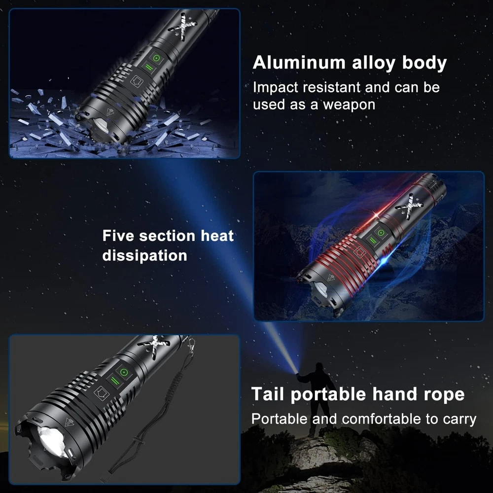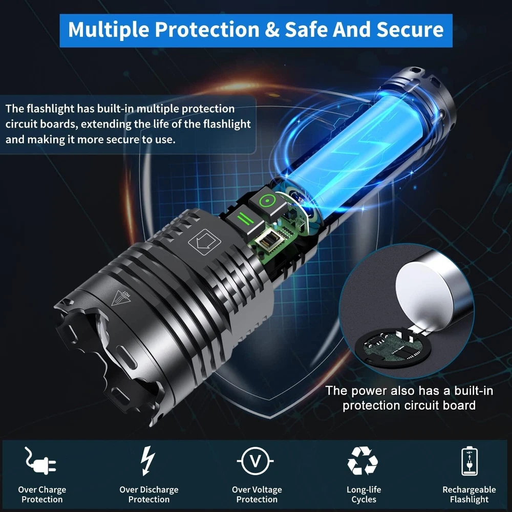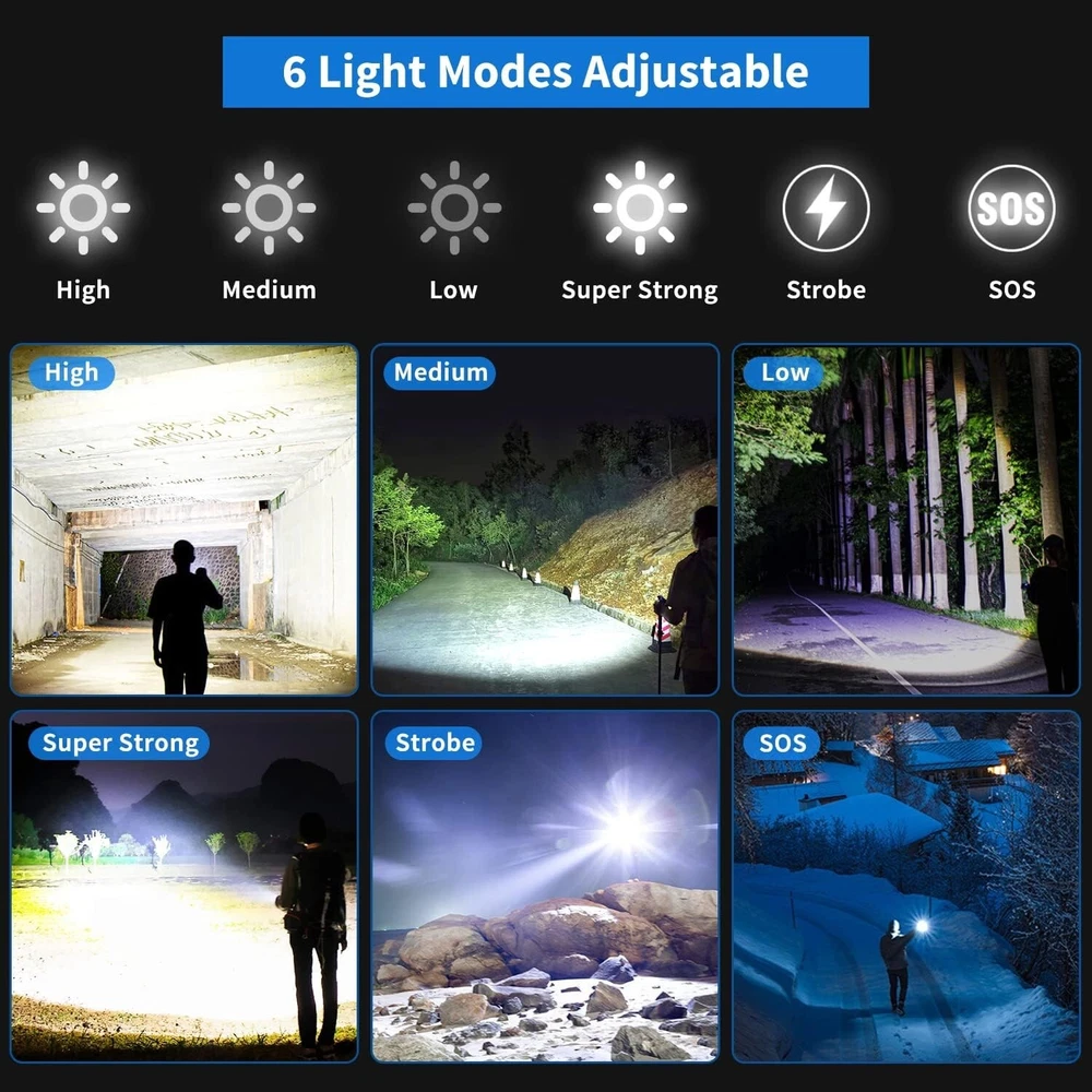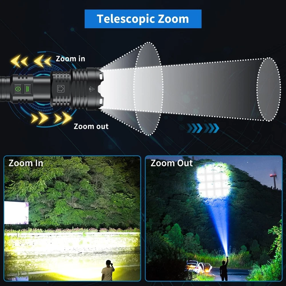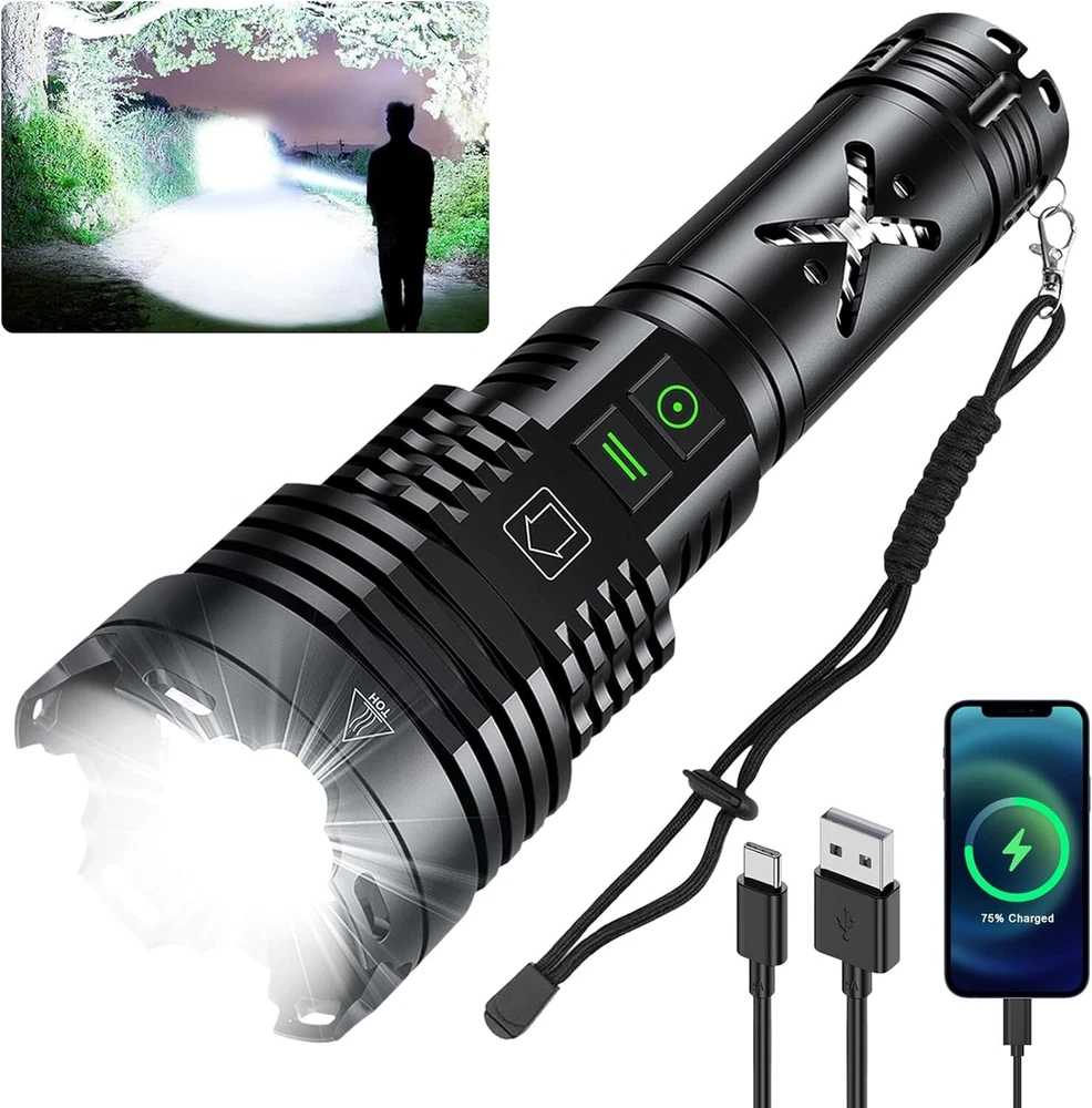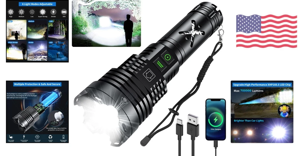 Powerful Tactical Flashlight - 700000 Lumens, Rechargeable, Waterproof, 6 Modes ‹ › ‹ › ‹ › ‹ › ‹ › ‹ › ‹ › ‹ › ‹ › ‹ › ‹ › Powerful Tactical Flashlight - 700000 Lumens, Rechargeable, Waterproof, 6 Modes 🔦Upgraded LED Chip, Brighter 🔦Add Mode, Select More 🔦Charge Faster 🔦Zoomable, Adapt To More Scenes 🔦IPX67 Level, More Waterproof 🔦Reassuring Warranty Service 🔦The Best Gift Features: Upgraded xhp160.5 chip produces an ultra-high output of 700000 lumens, 30 times brighter than an average flashlight. 6 modes (Super Strong, Strong, Medium, Low, Strobe, and SOS) for versatile use. USB charging capability for faster charging and increased durability. Power output function allows you to use it as a mobile power supply. Telescopic zoom function for switching between spotlight and floodlight modes. IPX67 waterproof rating for use in adverse weather conditions. Constructed from explosion-proof aluminum alloy for safety and durability. 2-year free replacement service and 24/7 customer support. Packaged in a gift box, making it the perfect gift for any occasion. Benefits: 30 times brighter than an average flashlight, easily illuminates large areas. 6 lighting modes suitable for various situations. Faster charging and increased durability with USB charging capability. Can be used as a mobile power supply to charge devices. Switch between spotlight and floodlight modes for different lighting needs. Waterproof and durable for use in adverse weather conditions. Safe and reliable for working environments. Reassuring warranty service and customer support. Perfect gift for any occasion. Why choose our Powerful Tactical Flashlight? Don't settle for average flashlights when you can have the Powerful Tactical Flashlight. With its upgraded LED chip, this flashlight is 30 times brighter than the rest, easily illuminating large areas and objects up to 3500 feet away. It offers 6 modes for versatile use and features a telescopic zoom function for switching between spotlight and floodlight modes. Plus, with its USB charging capability and power output function, you can charge your devices on the go. Not only is this flashlight waterproof and durable, but it also comes with a 2-year free replacement service and 24/7 customer support. And with its sleek gift box packaging, it makes the perfect gift for anyone on any occasion. Choose the Powerful Tactical Flashlight and experience the difference today! Shipping Free & Fast Shipping - We offer free shipping to most of the USA with a normal delivery time of 3-7 days. However, due to the current situation, additional delivery time (up to 3 weeks) may be required for some items. Alternative Carriers - We may use alternative carriers (e.g. USPS, FedEx, UPS, etc.) to ensure your package arrives safely and on time. Due to the use of multiple carriers, we are unable to provide a tracking number automatically. Handling Time - Orders are processed and shipped within 1-2 business days of receiving cleared payment. Shipping Restrictions - Shipping to Alaska, Hawaii, Puerto Rico, Guam, and other US territories may incur shipping charges or delivery restrictions. Please contact us before ordering, or your order can be refunded/cancelled. State Restrictions - There may be restrictions based on your state of purchase. For example, certain items may not be shipped to California due to state regulations. Contact for Tracking Updates - If you require tracking updates or have any concerns about the delivery of your order, please feel free to contact us, and we will be happy to assist you. Return 30-Day Hassle-Free Returns - We want you to be completely satisfied with your purchase. If you are not, you can return the item within 30 days of receiving it for a full refund or exchange. Easy Return Process - To start a return, simply contact us and we will provide you with a prepaid return shipping label and detailed instructions. Restocking Fee - There are no restocking fees for returns. However, the buyer is responsible for return shipping costs if the return is not due to a seller's error. Refund Processing Time - Refunds will be processed within 5 business days of receiving the returned item in its original condition. Payment We accept all major credit cards, PayPal, and Apple Pay for your convenience. Your payment information is secure and encrypted to ensure a safe and seamless transaction. Please complete your payment within 3 days of purchase to avoid any delays in shipping. Feedback Your feedback is extremely important to us. We strive to provide the best products and customer service possible. If you are satisfied with your purchase, please take a moment to leave us a positive review. If you have any concerns or issues with your order, please contact us before leaving negative feedback. We are committed to resolving any problems and ensuring your satisfaction. Contact Us If you have any questions or concerns, please feel free to reach out to our customer support team. You can contact us through the eBay messaging system. We are available Monday to Friday, 9:00 am to 5:00 pm EST, and we will do our best to respond to your inquiry within 24 hours. Thank you for supporting our small family business!