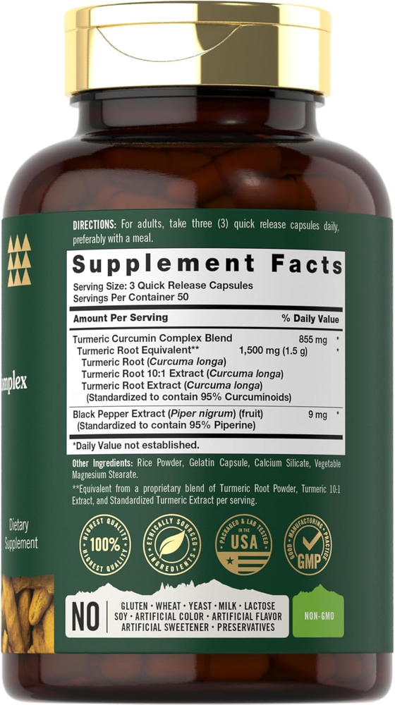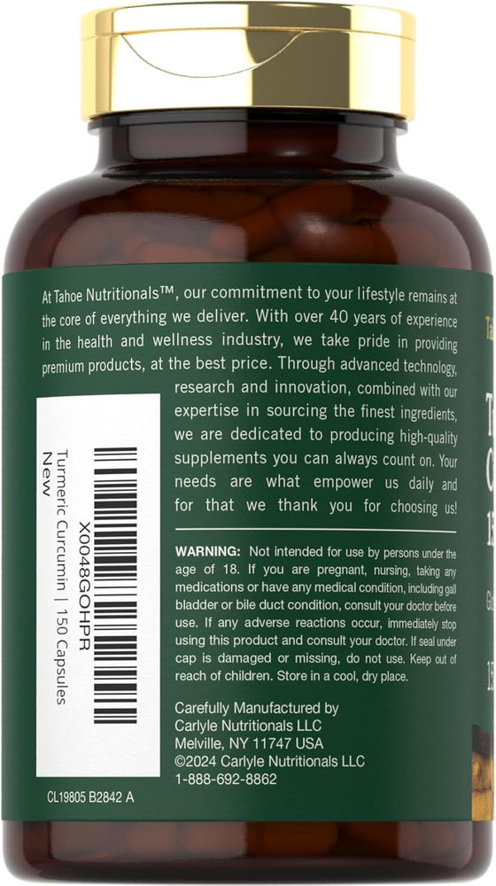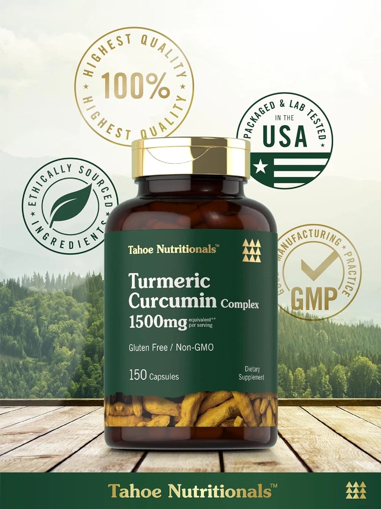 AYURVEDIC STAPLE: More than just a spice, Turmeric has been used traditionally for centuries! ADVANCED COMPLEX: Features a Turmeric Curcumin Complex Blend in convenient quick release capsules ROOTED IN WELLNESS: Tahoe Nutritionals provides premium, honest supplements in your pursuit to healthy living TAHOE NUTRITIONALS: Laboratory Tested, Trusted Ingredients, Superior Quality, 100% Guaranteed! NATURALLY FREE OF: Gluten, Wheat, Yeast, Milk, Lactose, Artificial Flavor, Preservatives & Non-GMO Product Description Nature’s Golden Spice: Commonly known as the "Golden Spice," Turmeric (Curcumin) is a classic culinary spice that has been used for centuries in herbal wellness traditions. It is especially popular in Ayurvedic practices, offering naturally occurring beneficial compounds, known as Curcuminoids, derived from its roots. The best way to get the benefits of this golden herb is through a supplement such as powder, liquid, pills, tablets, softgels, gummies, extracts, and capsules. Tahoe Nutritionals Turmeric Curcumin Complex: Tahoe Nutritionals Turmeric Curcumin Complex: At Tahoe Nutritionals, our highly innovative formula features a Turmeric Curcumin Complex Blend equivalent to 1,500 mg per serving.* Quick release capsules are gluten free and non-GMO, made with no artificial flavor or sweetener, making it a perfect choice for adult men and women committed to top-quality nutrition. Enjoy or 150-capsule supply! Rooted in Wellness: Our expertise in sourcing the purest ingredients combined with advanced technologies makes us proud to deliver premium, honest supplements at the best value. Our Turmeric Curcumin Complex is a testament to our commitment to excellence, made with powerful ingredients rooted in wellness. Thanks for choosing us in your pursuit of living healthy! *Equivalent from a proprietary blend of Turmeric Root Powder, Turmeric 10:1 Extract, and Standardized Turmeric Extract per serving.