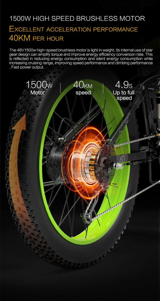 This e-bike is a beast! The 1500W motor gives incredible power, tackling hills and rough terrain effortlessly. The fat tires provide awesome stability, and the hydraulic brakes ensure safe stopping. Battery life is solid for long rides, and the speed hits 40km/h with ease. Perfect for adventure or daily commuting—durable, powerful, and super fun to ride!