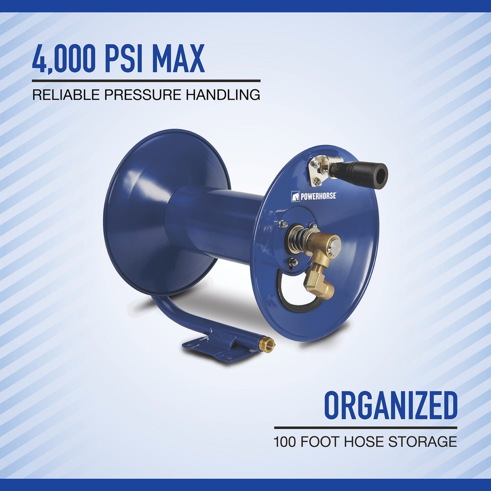 This Powerhorse Pressure Washer Hose Reel holds up to 100ft. of hose and mounts to your pressure washer with the included brackets. Features a brass swivel with internal stainless steel stem for added strength. The pinlock prevents excess hose unravel and the tension brake helps control hose release. Hose not included. Powerhorse Pressure Washer Hose Reel, 4000 PSI, 100ft. Capacity Northern Tool Item# 55785 Item Weight: 12.4000 lb(s) Manufacturer: Powerhorse MPN: 2100482 Warranty: . Product Summary: This Powerhorse Pressure Washer Hose Reel holds up to 100ft. of hose and mounts to your pressure washer with the included brackets. Features a brass swivel with internal stainless steel stem for added strength. The pinlock prevents excess hose unravel and the tension brake helps control hose release. Hose not included. Payment Instructions You can pay us securely through eBay. All orders will contain an invoice/receipt. IMPORTANT: We will not honor requests to remove invoices or receipts from packages. No exceptions ON U.S. PURCHASES, Northern currently collects sales tax on purchases shipped to all states except: Alaska, Delaware, Montana, New Hampshire, Oregon Shipping Information This product will be shipped by Parcel. Parcel Shipping: Ground Shipped items must be sent to a physical address and cannot be sent to PO boxes. If a PO box address is submitted without a physical address it may delay your order. We cannot ship to APO/FPO boxes. Please note that we do not ship items on weekends or holidays. More information on shipping and handling times can be found on our Store Policies Page . Customer Care We want you to be satisfied with your purchase; please notify us by email if you have any concerns. Before you send an email message, please check our Help Section . We may already have an answer to your question! We are available to answer your email questions Monday through Friday from 8am - 3pm CST, excluding holidays. If your email is sent on a weekend, holiday or after business hours, we will respond to you on the following business day. Returns may be accepted on most items within 30 days of receipt of the item. All returns require authorization from us. Some returns are charged a 15% restocking fee. Please click the Shipping and Payments tab on this item for specific return information and full details. About Our Products Product Warranty: Warranty information and contact details can be found on our Store Policies Page. We are working hard to ensure that the information provided on the eBay product advertisements is accurate and up-to-date. We reserve the right to correct ad errors and/or omissions. Pricing and availability is subject to change without notice. Yes