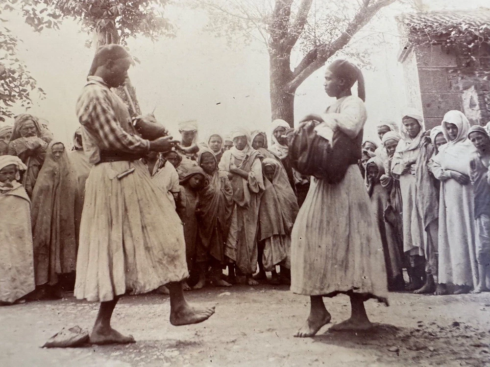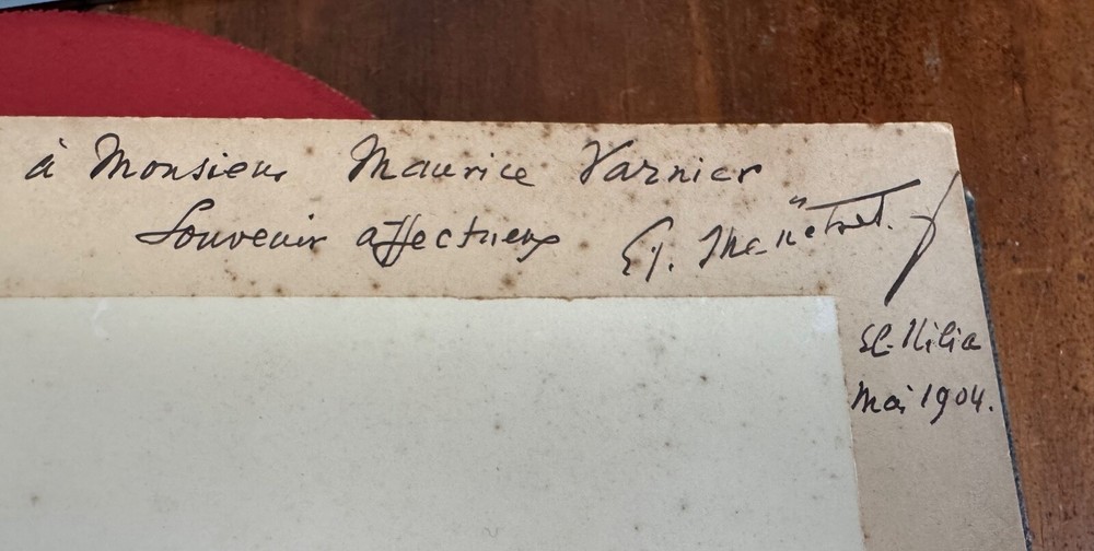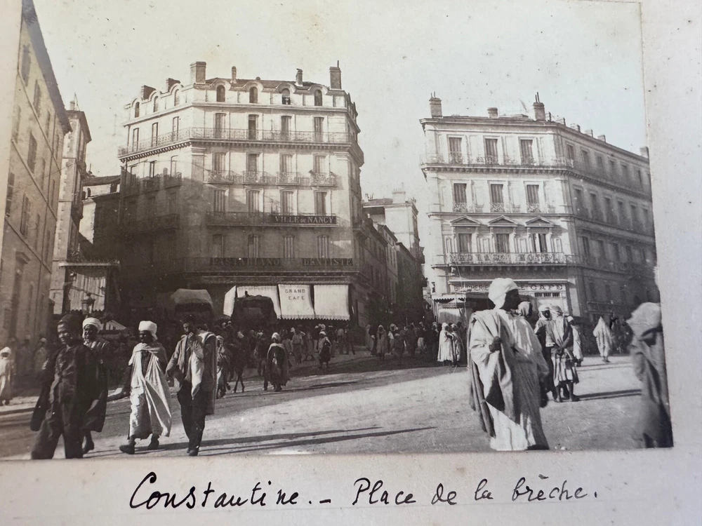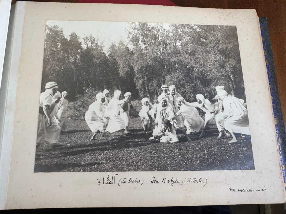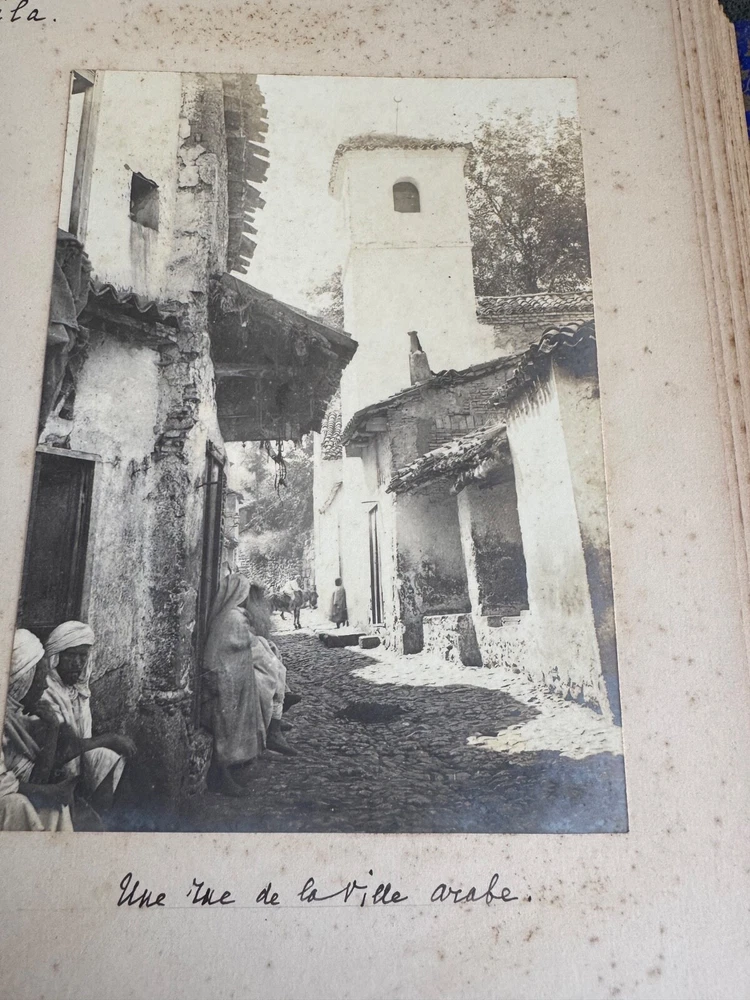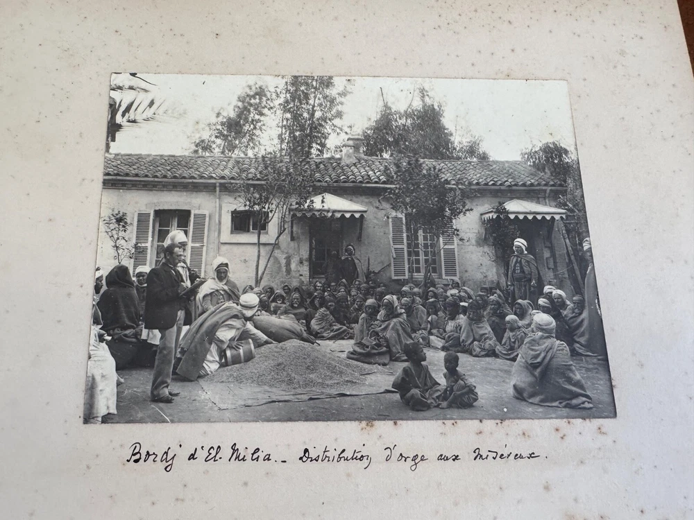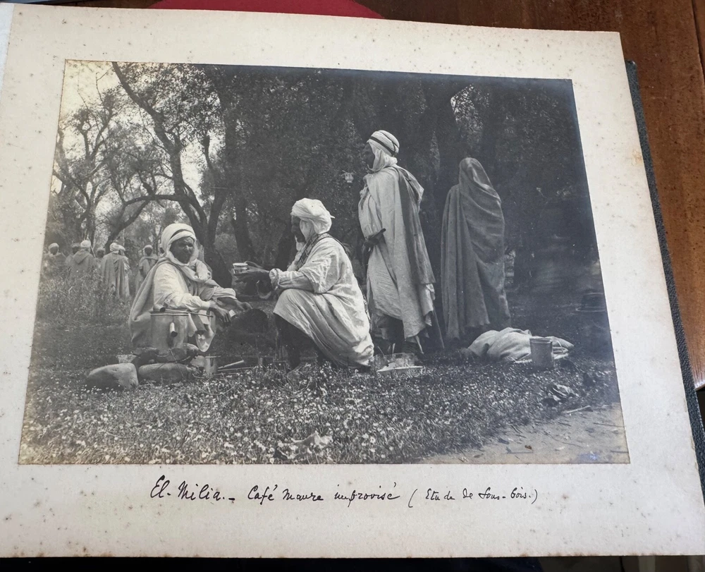 Précieux Album photographique sur l’Algérie coloniale constitué pour Maurice Varnier, alors Gouverneur général intérimaire de l’Algérie El Milia Mai 1904 Vue générale, Industries (Liège, tissage), Square, Distribution d’orge aux miséreux, Café maure improvisé, Une mechta, Lutte contre les Criquets, Jeu Kabyle (La brebis) avec explication au dos, Douar Oued Boufaa, Mila ( Statue romaine, Rue de la ville arabe), Porte romaine, Voyage de Jules Ferry en Algérie (1892) Station à El Djenah, Cuisson d’un mouton, Départ pour le marché, Une Source (Catinat), Récipient en poterie pour céréales (Douar El-Akbia), Ain Messaouda, Constantine, Stora, Plage d’El Milia, Tombeau des Lollius, Bois d’oliviers, Laboureur kabyle, Une source (Douar M’Chatt), Musiciens négres, Femmes indigènes, Jeune fille des Ouled-Kassam, le Mathusalem des Beni Moslem (115 ans), Souvenirs de l’Oranie, Sidi Bel Abbés (Hôtel de Ville), souvenirs du vieil >Oran, Méli-melo ( Zemmora, Marabout de Sidi-Bachir au Village négre (Oran), Un ancien M’amber du Bureau Civil (Binettoscopie Bougnol, 1879) Album in 4° oblong percaline Comprenant 17 photographies 15 x 21,5 cm et 19. 11 x 8 cm + 4 autres formats. ensemble 40 photographies sur l'Algérie coloniale toutes légendées. Maurice Varnier , né le 15 janvier 1851 à Valence ( Drôme ) et mort le 2 décembre 1919 à Oujda ( Maroc ), est un haut fonctionnaire français. Né le 15 janvier 1851 à Valence, dans la Drôme, Maurice Pierre Henri Varnier est le fils aîné de Marie-Joseph Adolphe Varnier (1824-1897) et de Louise-Sophie Millhot de Vernoux (1833-1900)Son père, occupait un emploi à la sous-préfecture de Miliana, puis sous-chef de bureau à la préfecture d’Alger et termine sa carrière en tant que secrétaire général de la préfecture d’Oran. Sa mère était la fille d’un colon de la première heure, M. Milhot de Vernoux, qui a été candidat à l’ Assemblée nationale en 1848 . Le 19 mars 1862, à Oran , il épouse Louise Ernestine Boué (1853-1900) qui lui donnera deux enfants, Jeanne Marie et Pierre Henri Varnier(administrateur Principal des Communes mixtes en Algérie). Maurice Varnier, engagé volontaire dans le 2e régiment de zouaves en 1870 à la déclaration de la guerre franco-prussienne , fait campagne avec l’ armée de l'Est . En 1871, il est grièvement blessé par un éclat d'obus à Sainte Suzanne près de Montbéliard , lors de la bataille de Villersexel . Il part en convalescence à Oran où il se marie D’abord rattaché au Cabinet du Préfet d’Oran de 1872 à 1874 il va occuper ensuite le poste de chef du bureau civil de la Division (1874-1878) En 1879, il est nommé administrateur des communes mixtes de Sidi Bel Abbès , du Haut-Sebaou, de Mascara , Zemoura et de l’Hillil puis sous-préfet de Sidi-Bel-Abbès. Lorsque la substitution du régime civil au gouvernement militaire est décidée et que la création des communes mixtes réalise cette substitution, Maurice Varnier est nommé administrateur de la commune de la Mekerra. Mais il ne resta pas longtemps dans ce poste, nous le retrouvons dans la commune mixte du Haut-Sébaou, où il fonde Azazga en 1882, puis, successivement il occupe les postes de Mascara, de Zemoura, de l’Hillil. 1878-1893). Ses rapports, mettant en lumière quelques défauts d'organisation, sont lus en haut lieu. Lorsque, M.Burdeau chargé par la commission du budget, de l’examen du budget du service de l’Algérie, vient pour procéder à l’enquête. Le rapport sur le budget de 1892 a été le point de départ de toutes les réformes réalisées depuis, en Algérie. Maurice Varnier a été estimé la personne pouvant le mieux le renseigner sur les vices et les défectuosités de la machine administrative algérienne. M. Burdeau n’oublia jamais son collaborateur occasionnel et il disait à Charles Jonnart « si je vais un jour en Algérie comme Gouverneur, mon secrétaire général est tout choisi, ce sera l'administrateur nommé Varnier. » Maurice Varnier était sous-préfet de Sidi-Bel–Abbès au moment où Charles Jonnart fut nommé Gouverneur. Ce dernier lui confie le 4 novembre 1900 le poste de Secrétaire général du Gouvernement général de l’Algérie. Maurice Varnier pend une part active à la réorganisation des services publics qui suit l’établissement du budget spécial algérien. En 1903, quand Paul Révoil est relevé de ses fonctions, Maurice Varnier est nommé Gouverneur intérimaire . Il reçoit le Président Loubet lors de son voyage en Algérie. C'est en 1911 que M. Varnier devait prendre sa retraite, mais à ce moment les délégations financières allaient se réunir en présence d’un gouvernement nouveau et le scandale Toutée-Destailleurs se produisit. Le Gouverneur général Lutaud expose alors au président du conseil les raisons qui lui faisaient souhaiter le maintien de Maurice Varnier à la tête de l'Administration algérienne, au moins jusqu'à la fin de la session des délégations. Il fallait trouver un fonctionnaire au courant des affaires nord-africaines n'ayant aucune attache avec le ministère des Affaires étrangères ou de la guerre intéressés directement dans la querelle du Général Toutée et du consul Destailleurs, M. Joseph Caillaux jugea que M. Varnier était l’homme tout indiqué, il est donc demandé par le Général Lyautey, par télégramme à Paris et nommé séance tenante, après une courte entrevue avec le Président du Conseil. Les attributions respectives du Haut Commissaire du Gouvernement et du Général Commandant les troupes d'occupation des Confins Marocains ont été définies dans le décret du 9 décembre 1911, dans l'accord du 5 décembre 1911 entre le ministre des Affaires étrangères et de la Guerre et par le décret du 31 mai 1912 déterminant les pouvoirs du Haut Commissaire de France dans les Confins Algéro-marocains. Le Maroc Oriental comprend le territoire situé entre la Médite
