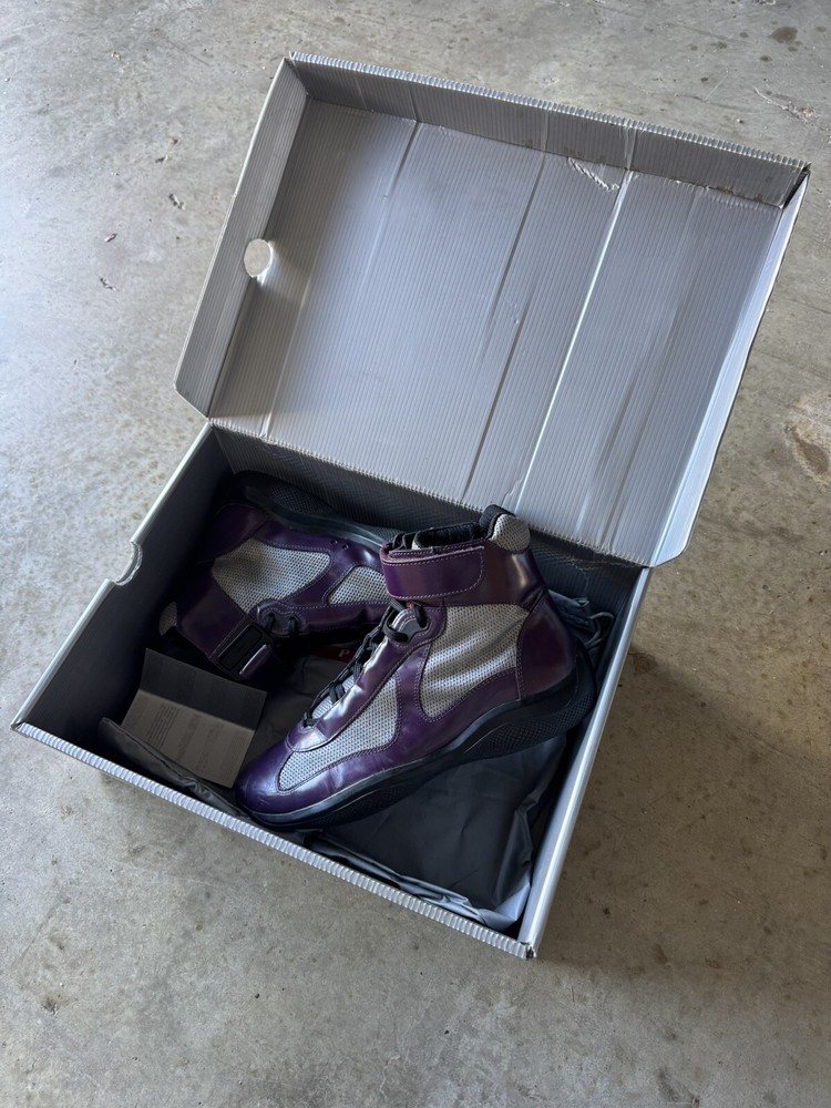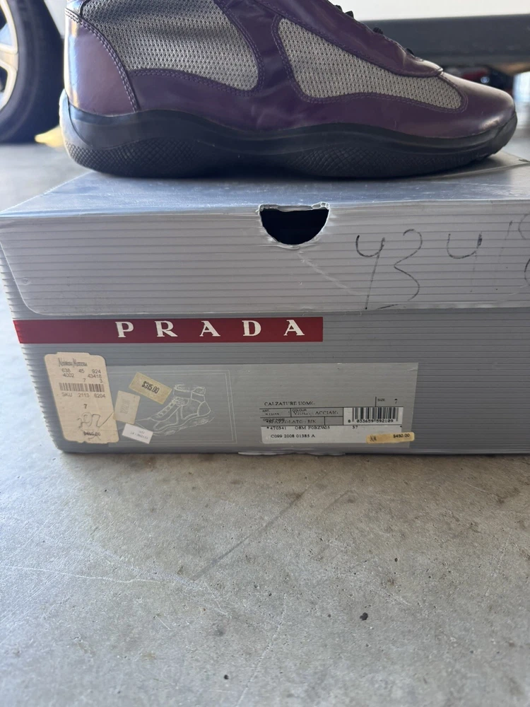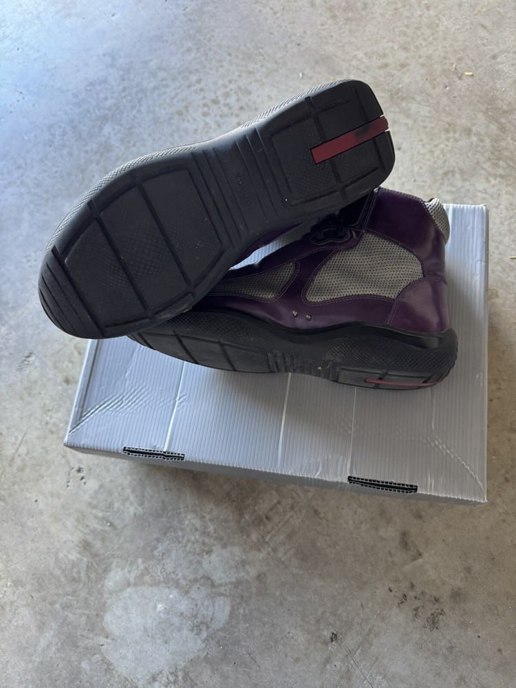US Shoe Size:7Upper Material:Patent LeatherStyle:SneakerType:CasualColor:PurpleBrand:PRADADepartment:MenProduct Line:Americas CupModel:Prada Americas Cup