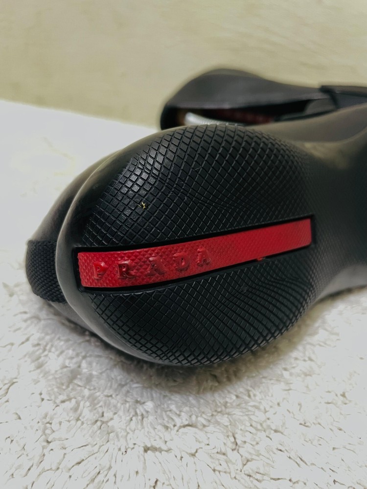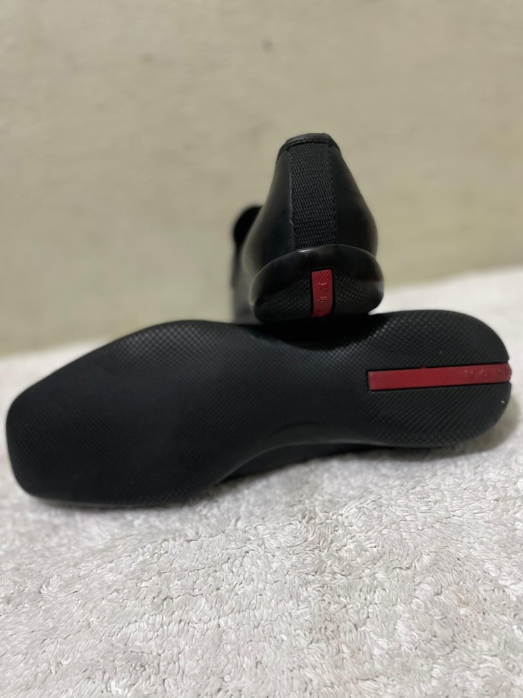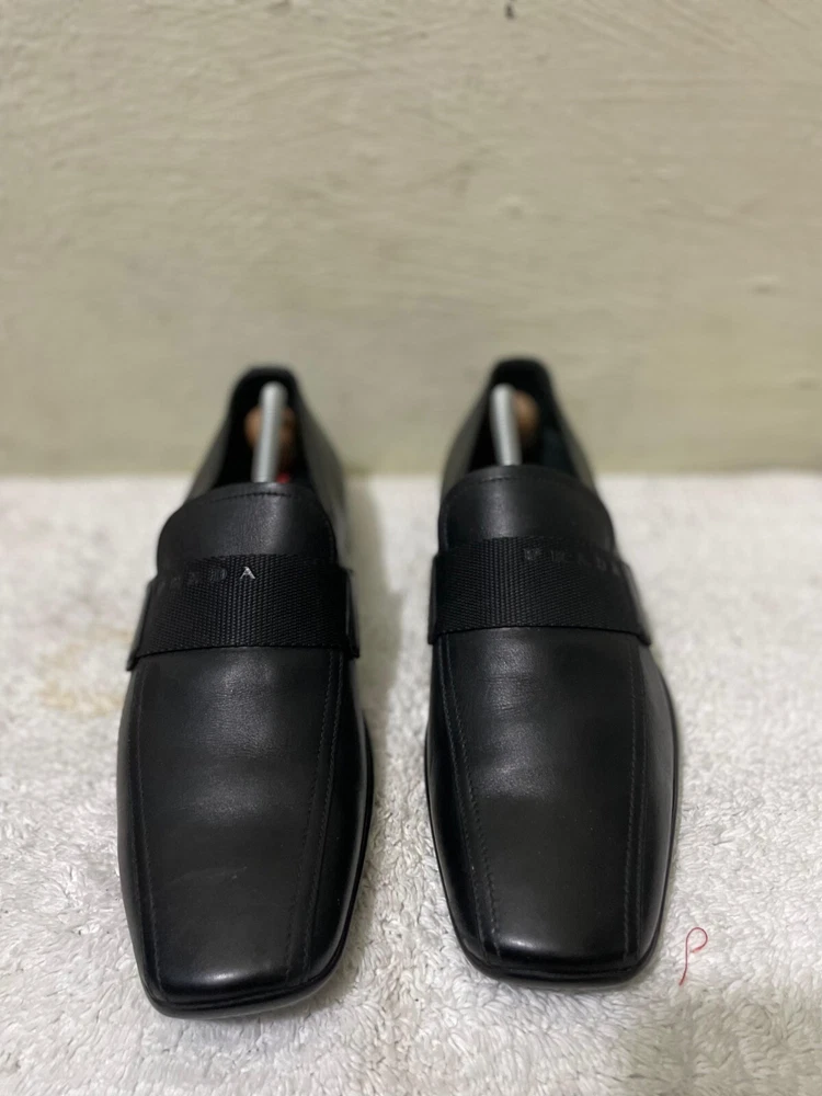 The Prada loafer shoes are a stylish and comfortable pair of men's dress shoes in size 8 UK/9 US. Featuring a solid black color and made from leather, these Oxford-style shoes are perfect for formal occasions or everyday wear. The Prada brand ensures high quality and a fashion-forward design, making them a versatile and sophisticated addition to any wardrobe.
