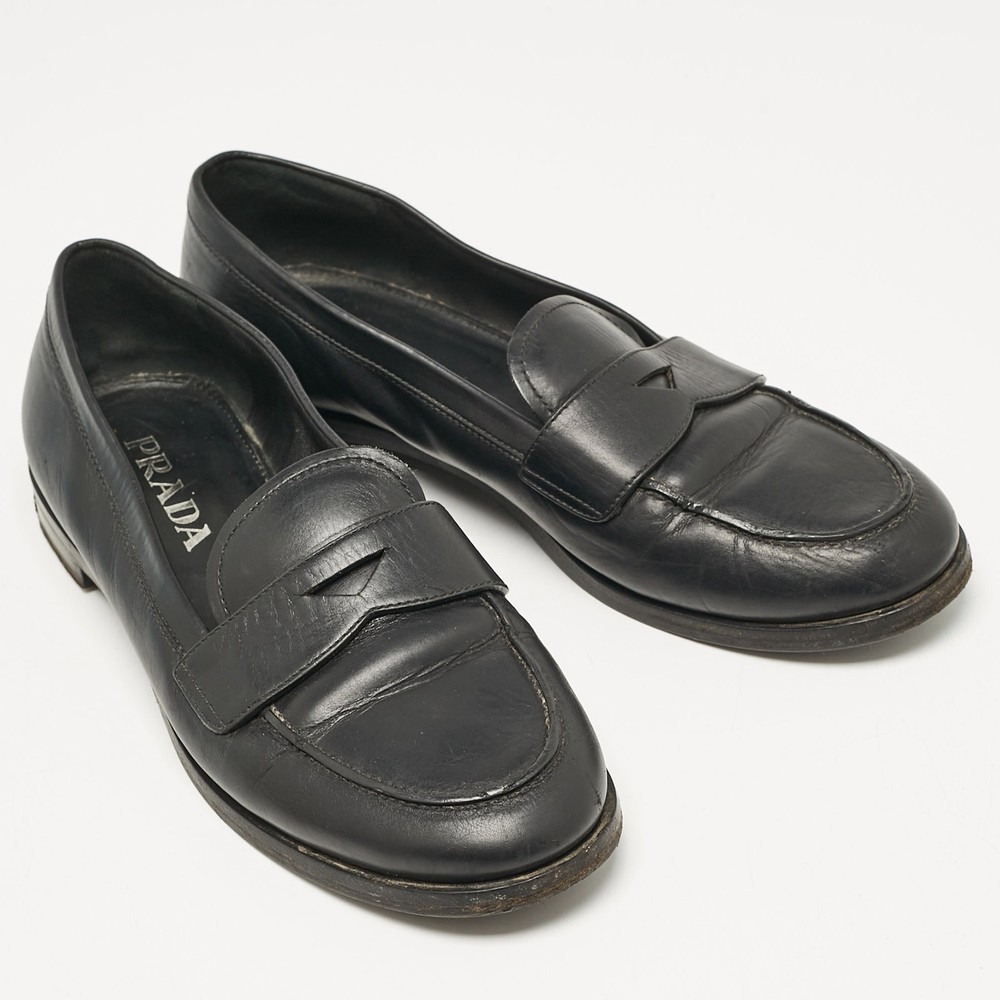 Indulge in timeless elegance with these womens loafers from Prada. Crafted in Italy, their sleek black leather exterior exudes sophistication, while the luxurious leather lining and insole ensure unmatched comfort. Designed for the fashion forward woman, these slip ons feature a durable leather and rubber sole, offering both style and practicality. Perfect for day to night transitions, these exclusive shoes elevate any ensemble with their effortless charm and refined aesthetic. Step into a world of luxury with this exquisite footwear.Certified by The Luxury Closet - This item has gone through a detailed authentication process overseen by our experts. We offer a lifetime guarantee of authenticity on all our items. Import duties, taxes and charges are not included in the item price. These charges are the buyers responsibility. Please check with your country’s customs office to determine what these additional cost will be prior to buying. Our eBay Store About Us Contact Us Add to Favorite Sellers Prada Black Leather Slip On Loafers Size 38.5 $151.8 Indulge in timeless elegance with these womens loafers from Prada. Crafted in Italy, their sleek black leather exterior exudes sophistication, while the luxurious leather lining and insole ensure unmatched comfort. Designed for the fashion forward woman, these slip ons feature a durable leather and rubber sole, offering both style and practicality. Perfect for day to night transitions, these exclusive shoes elevate any ensemble with their effortless charm and refined aesthetic. Step into a world of luxury with this exquisite footwear. Product Details Brand Color Black Dimensions Material Leather Size 38.5 Outsole Width 8.5 cm Outsole Length 27 cm Heel Height Includes The Luxury Closet Packaging Certified by The Luxury Closet This item has gone through a detailed authentication process overseen by our experts. We offer a lifetime guarantee of authenticity on all our items. How We Check The in-house team of experts at The Luxury Closet is highly trained to verify the authenticity and the condition of the luxury products. They ensure that only 100% authentic items are put on sale.The evaluation process is unique with its own mix of assessment criteria and differs according to the category. Each item is evaluated based on the following combination of hallmarks, hardware, stitching, symmetry, material, craftsmanship, stamping, codes, hologram stickers, and packaging. Our authenticators also check if the items have been modified or amended (e.g., aftermarket diamonds, replaced batteries, repaired bags, etc.) International Buyers Import duties, taxes and charges are not included in the item price. These charges are the buyers responsibility. Please check with your country’s customs office to determine what these additional cost will be prior to buying.