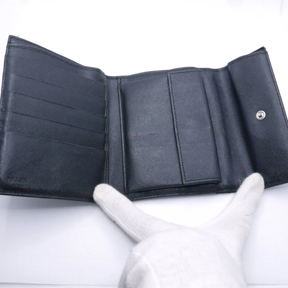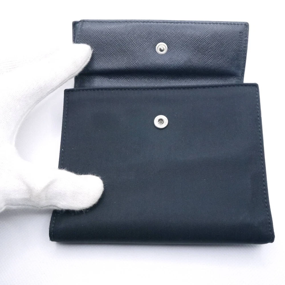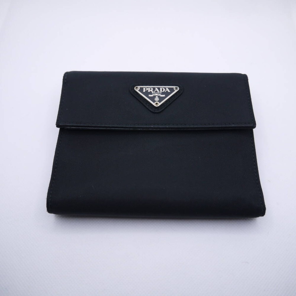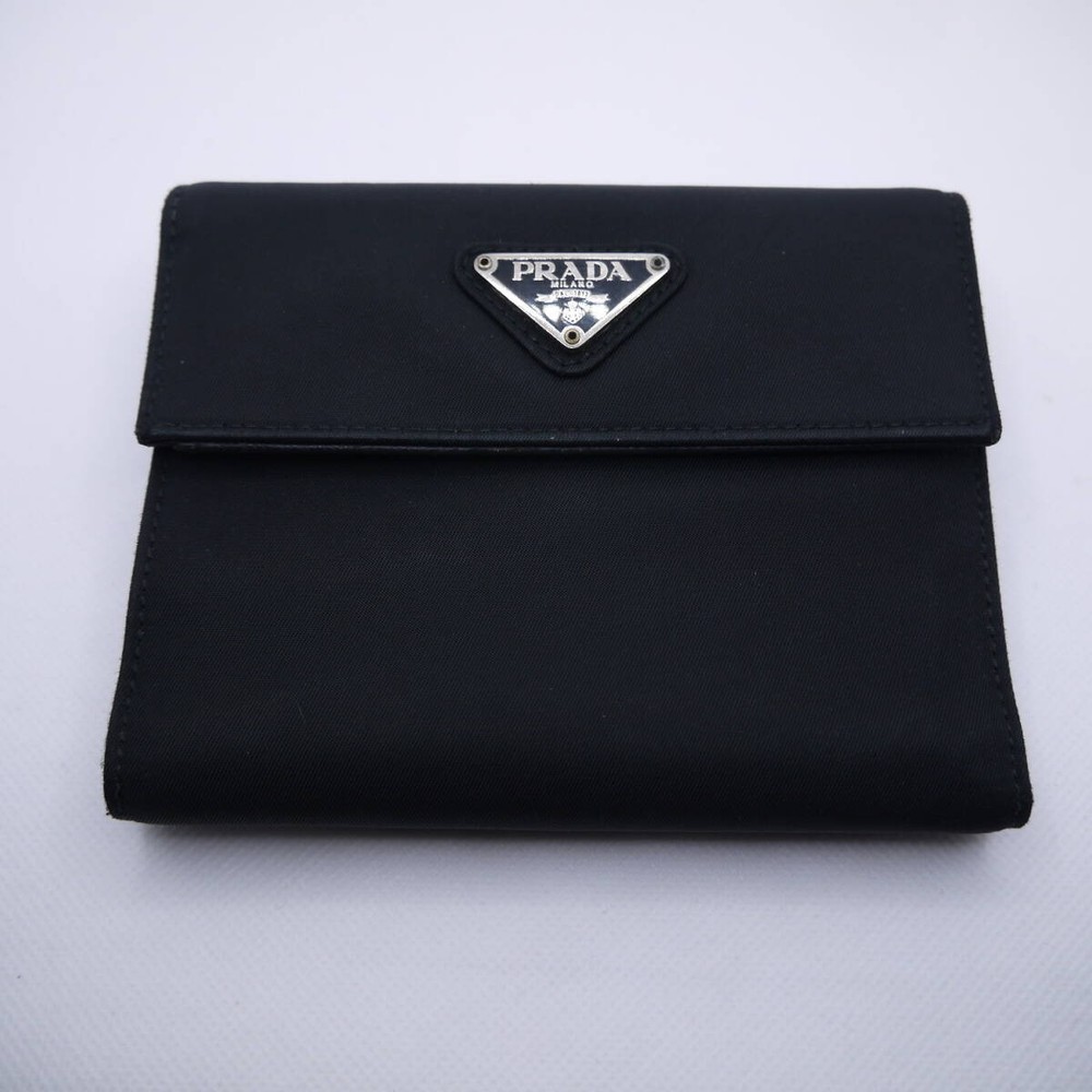 PRADA Nylon Tri-fold Wallet Triangle Logo Plate Black Retro Vintage Japan Used About This Items ■Please see photos for product details. ■The main closure is a snap button closure. The wallet is made of stamped leather and has 5 card slots, 1 bill compartment (on the side) and 1 pocket. The inside has a snap-button coin purse. The outside also has a zipper coin purse. The inside has a PRADA stamped mark in the lower left corner. ■Size approx Height: 4.1in/10.5cm Width: 5.1in/13cm Gap: 0.8in/2cm ■Accessories: 2 Prada authentic cards Condition ■Used Lightly used. The coin purse and snap button are in good condition. The inside, the outside, the whole black nylon material is elegant, and the product is in a beautiful condition. PAYMENTS We accept PayPal and all major Debit / Credit Cards. We can only ship your item after your payment clears. We ship within 10 days of payment. CHECKOUT Please check your address before paying because we can ONLY ship to addresses that are entered before placing the order. We cannot change an address after the order has already been placed. Shipping Packages:Box and BubblerupPackages usually leave our warehouse within 10 days of payment. Weekend orders will ship on Monday or Tuesday. We provide valid Tracking Numbers for all orders. We always send the item with a tracking number. So please place an order without any concern on delivery. You can always track the delivery status. Shipping is only available to the address registered in eBay. If you want us to send another address, please change your address on eBay and then place an order. Shipping is available from Monday to Friday. Weekends are not available because freight (shipping) companies are closed. We do not mark merchandise values below value or mark items as gifts Japan, US and International government regulations prohibit such behavior. If your address is in the remote areas defined by the freight (shipping) company, please pay the additional shipping fees with PayPal. International Packages We ship to all US Territories, Europe and Asia and Middle East and Australia and Canada including Guam and Hawaii.All our international packages ship under the Fedex and Japan Post and UPS and DHL. CUSTOMER SERVICE If you have any questions or issues, we are at your service. You can email us anytime through eBay messages. RETURN INFORMATION We offer a standard FREE 30 days refund or exchange policy. Item must be returned in original condition in order to receive a full refund. CUSTOMS DUTY Import duties, taxes, and charges are not included in the item price or shipping cost.These charges are the buyer's responsibility.Please check with your country's customs office to determine what these additional costs will be prior to bidding or buying.We will reply to your question or invoice within 3 days.We can't not reply gifts or unreasonable requests such as declared amount.