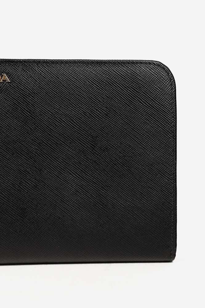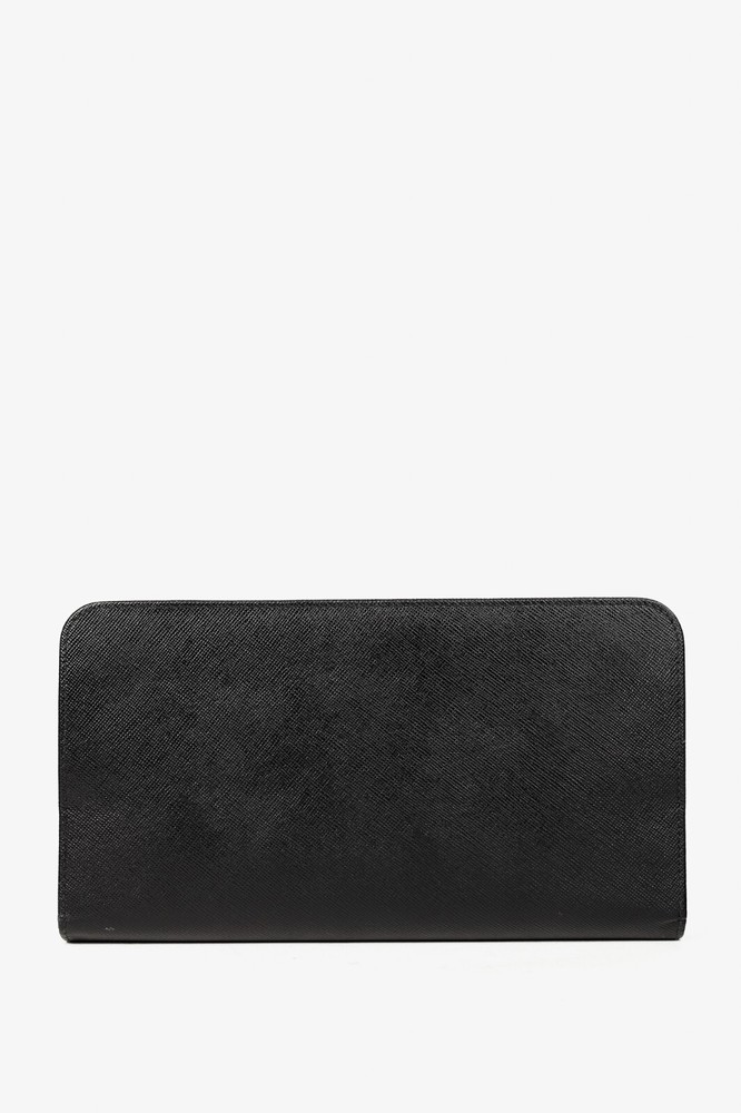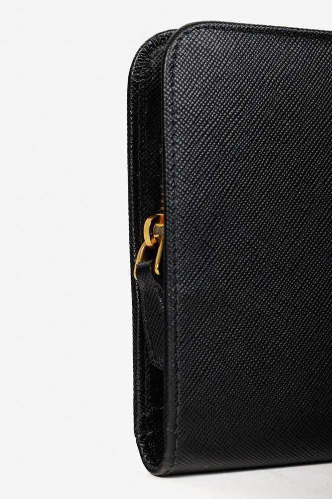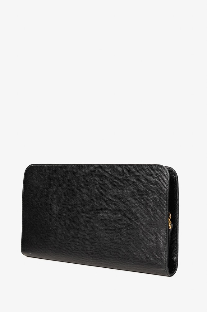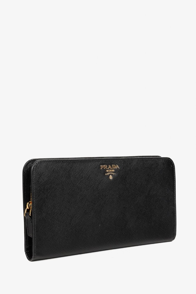 Crafted from luxurious black Saffiano leather with gold-tone hardware, this Prada wallet is both stylish and functional. The snap closure opens to reveal multiple zippered compartments, card slots, and a slip compartment, providing organization for all your essentials. The iconic gold logo at the front adds a touch of sophistication. Condition: Excellent; some marking minor mark on outside; light rubbing at edges and minor discolouration of gold hardware; includes certificate of authenticity, dustbag, and box Approximate measurements: Height: 4.7" (12 cm) Width: 8.7" (22 cm) Depth: 0.9" (2.3 cm) Composition: leather, metal