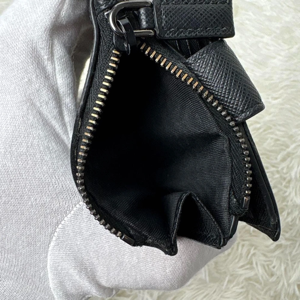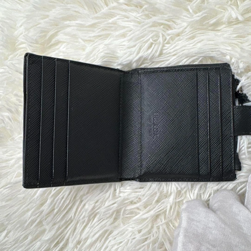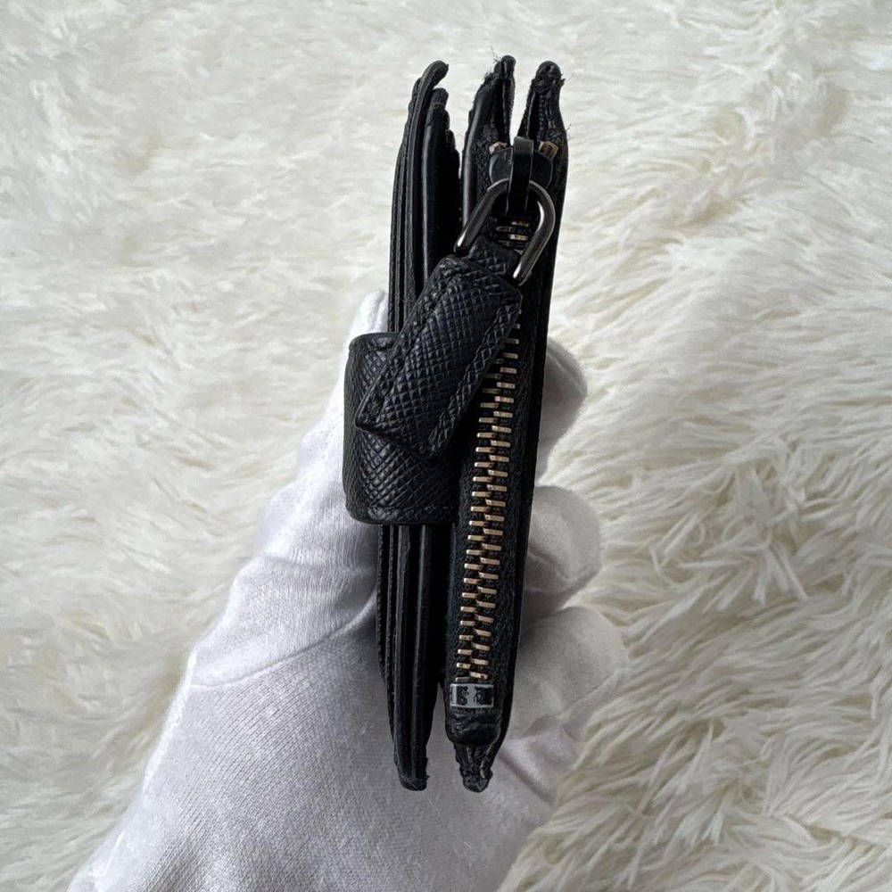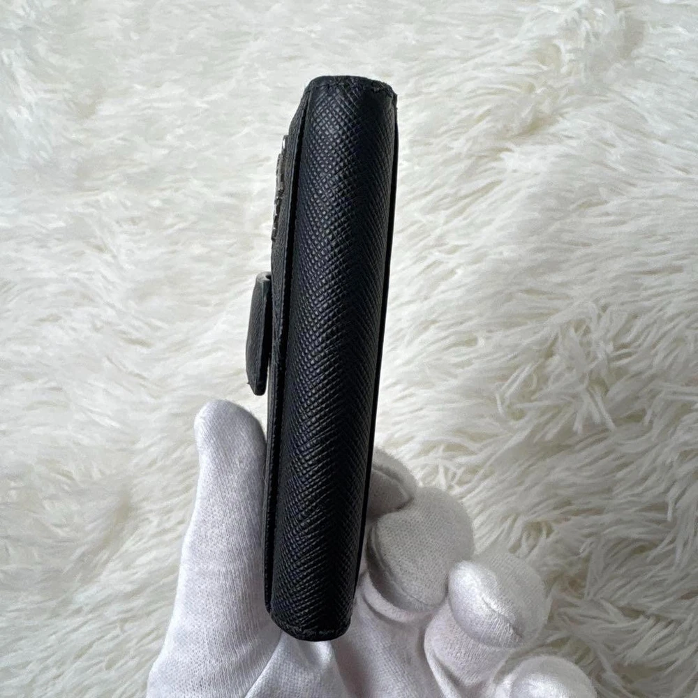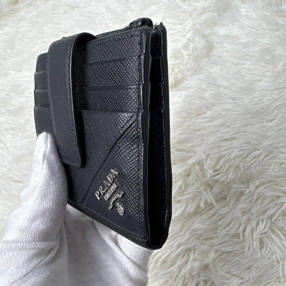 1. This Prada Saffiano wallet is a sleek and practical choice! The black leather looks classy and holds up well, with plenty of slots for cards and a handy coin pocket. The RFID protection is a great bonus, and even though it's pre-owned, the condition is nearly flawless. Perfect size for everyday use—fits easily in pockets without feeling bulky. A solid luxury pick for anyone who wants style and function!