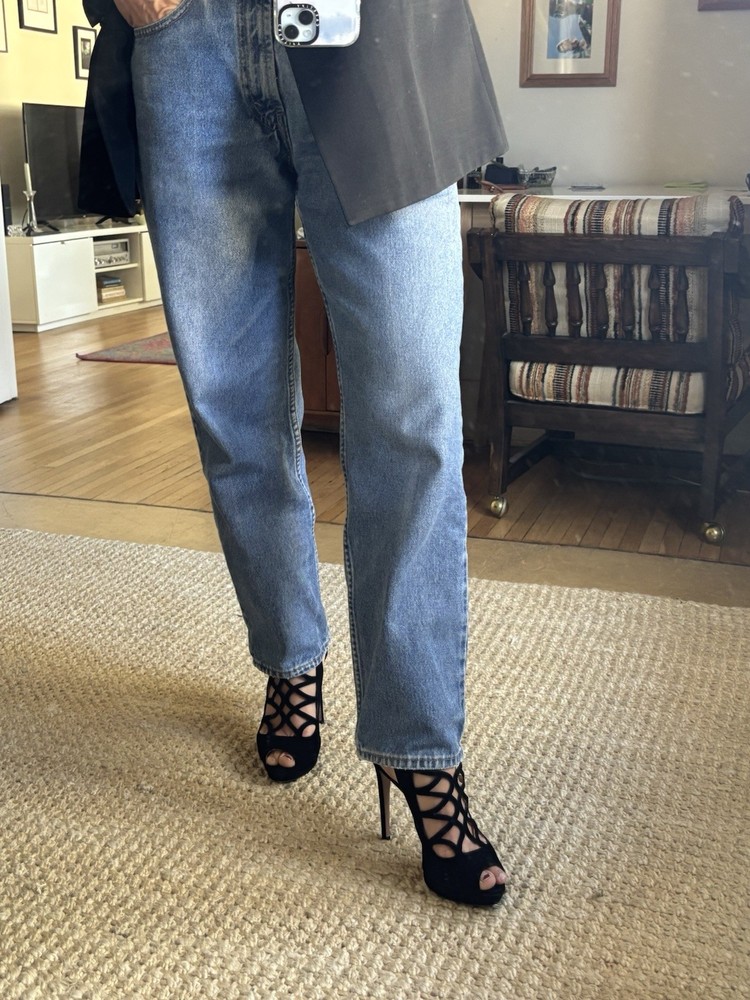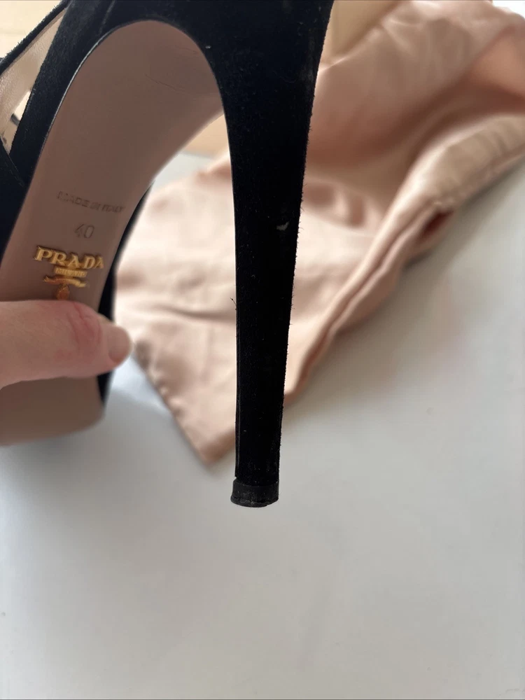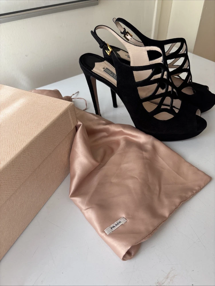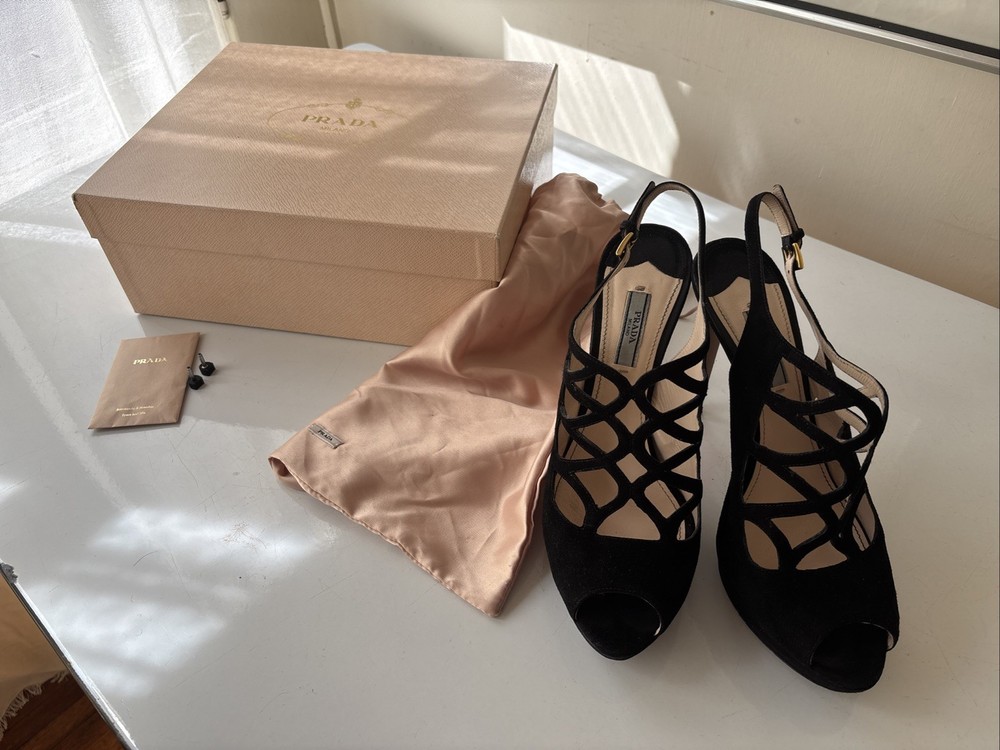 Elevate your fashion game with these stunning Prada black strappy stilettos. Crafted with premium quality leather and suede, these shoes are a perfect blend of style and comfort. The peep toe design and stiletto heel style make them perfect for any occasion, be it a party or a formal event. The vintage look of these shoes adds a touch of sophistication to your wardrobe. Available in US shoe size 40, these Prada stilettos are a must-have for every fashion-forward woman. So, add them to your collection now and walk in style! Comes with original box, original dust bag and original spare heel lifts. These are previously worn and do have minor defects.