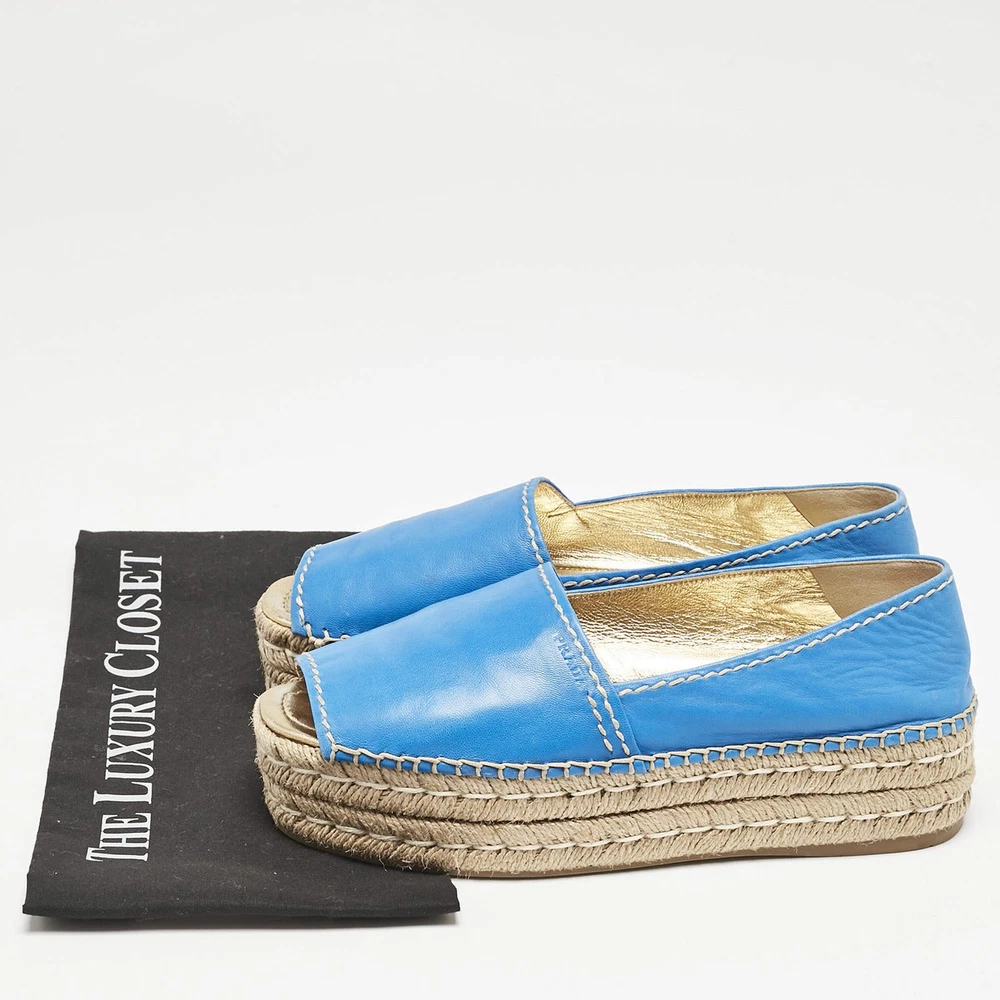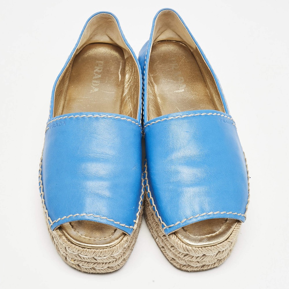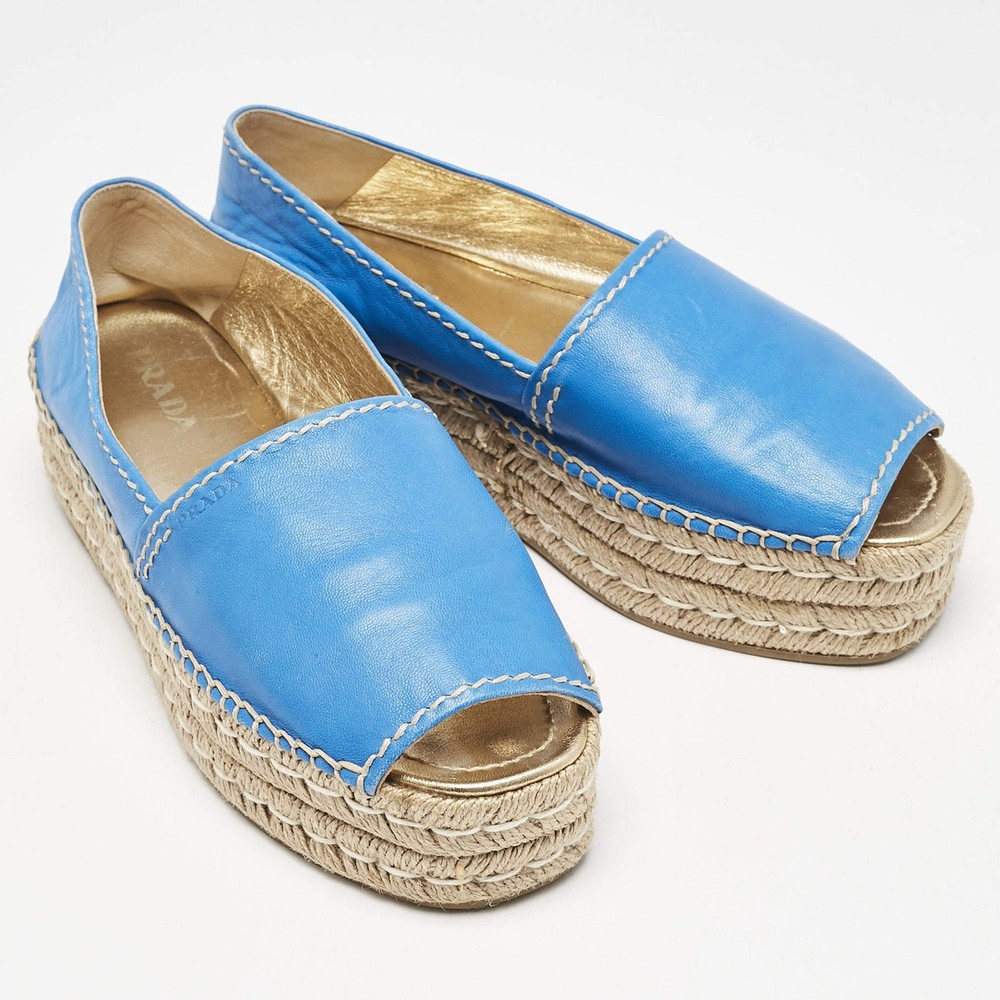 Our eBay Store About Us Contact Us Add to Favorite Sellers Prada Blue Leather Open Toe Platform Espadrilles Size 39 Designed purposely for fashion queens like you, these Prada espadrilles are leather made and soul-crushingly gorgeous! They come flaunting open toes, comfy insoles and braided platforms. To look your best, wear the pair with culottes and a metallic cropped top. Product Details Brand Prada Color Blue Includes The Luxury Closet Packaging Outsole Length 27 cm Outsole Width 8 cm Size 39 Certified by The Luxury Closet This item has gone through a detailed authentication process overseen by our experts. We offer a lifetime guarantee of authenticity on all our items. How We Check The in-house team of experts at The Luxury Closet is highly trained to verify the authenticity and the condition of the luxury products. They ensure that only 100% authentic items are put on sale.The evaluation process is unique with its own mix of assessment criteria and differs according to the category. Each item is evaluated based on the following combination of hallmarks, hardware, stitching, symmetry, material, craftsmanship, stamping, codes, hologram stickers, and packaging. Our authenticators also check if the items have been modified or amended (e.g., aftermarket diamonds, replaced batteries, repaired bags, etc.) International Buyers Import duties, taxes and charges are not included in the item price. These charges are the buyers responsibility. Please check with your country’s customs office to determine what these additional cost will be prior to buying.