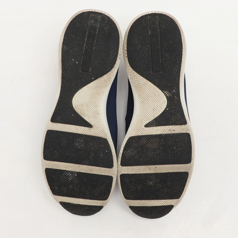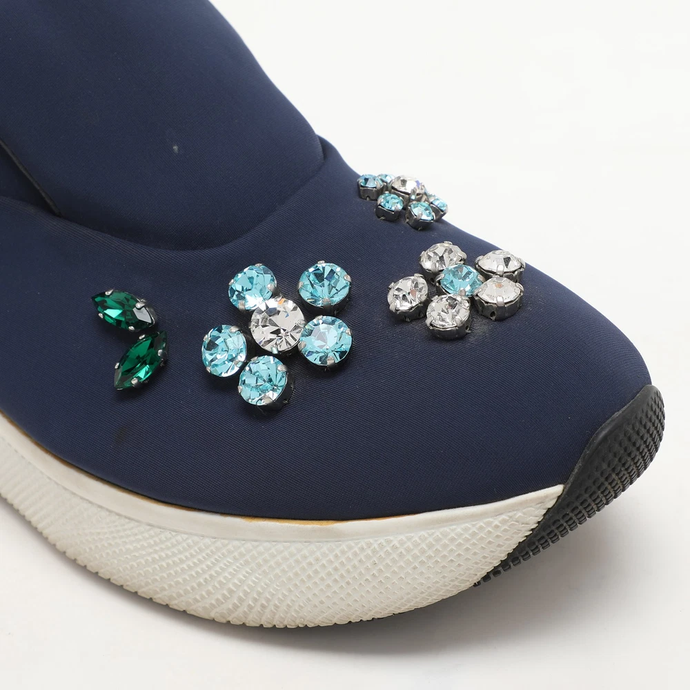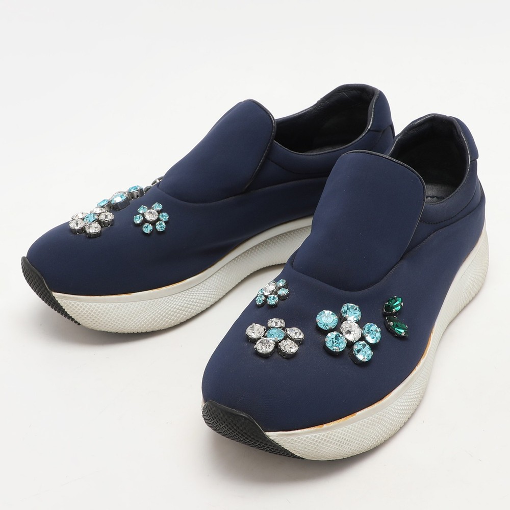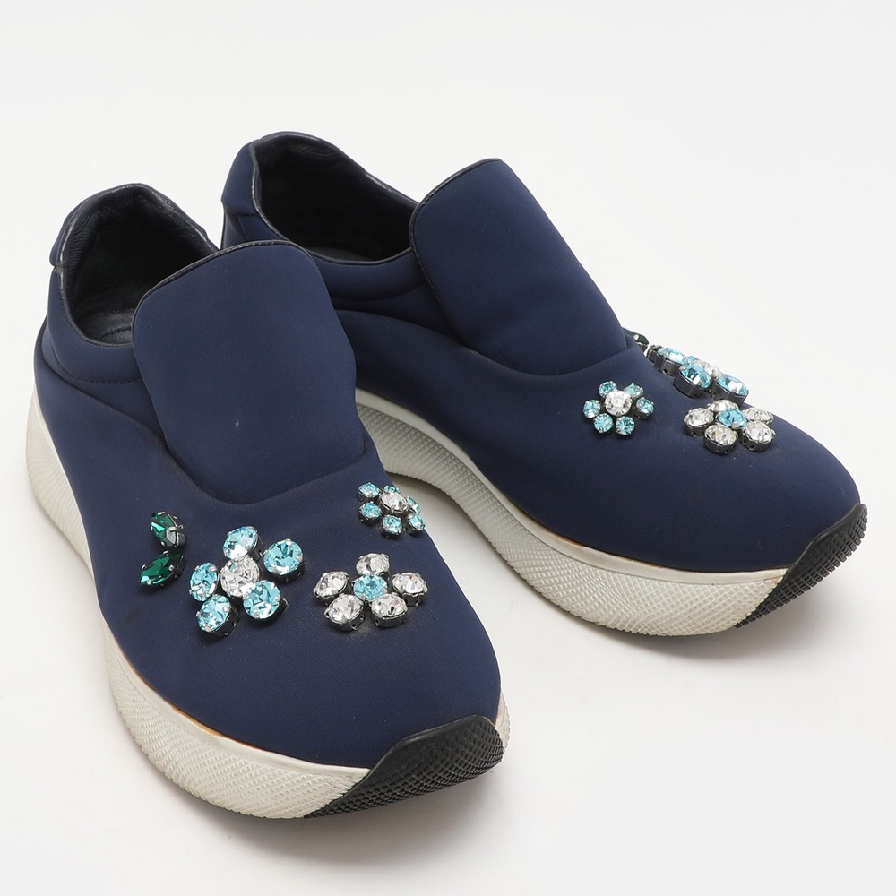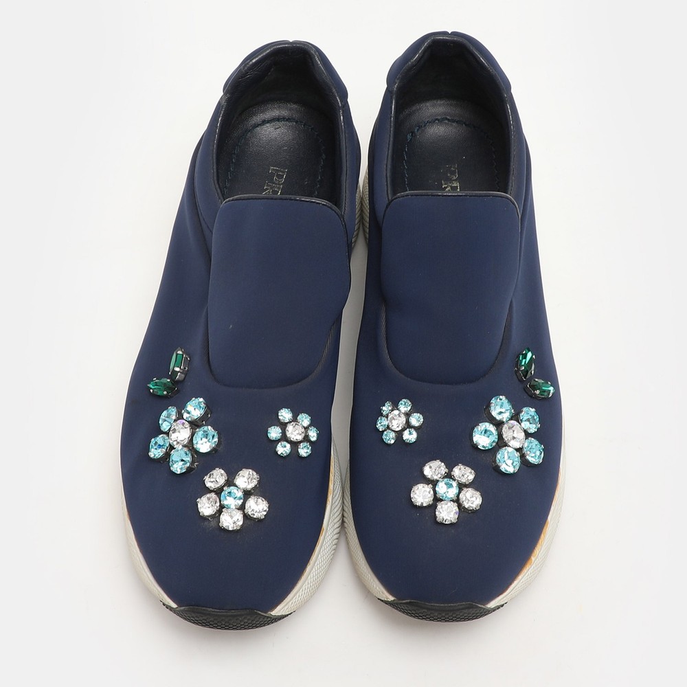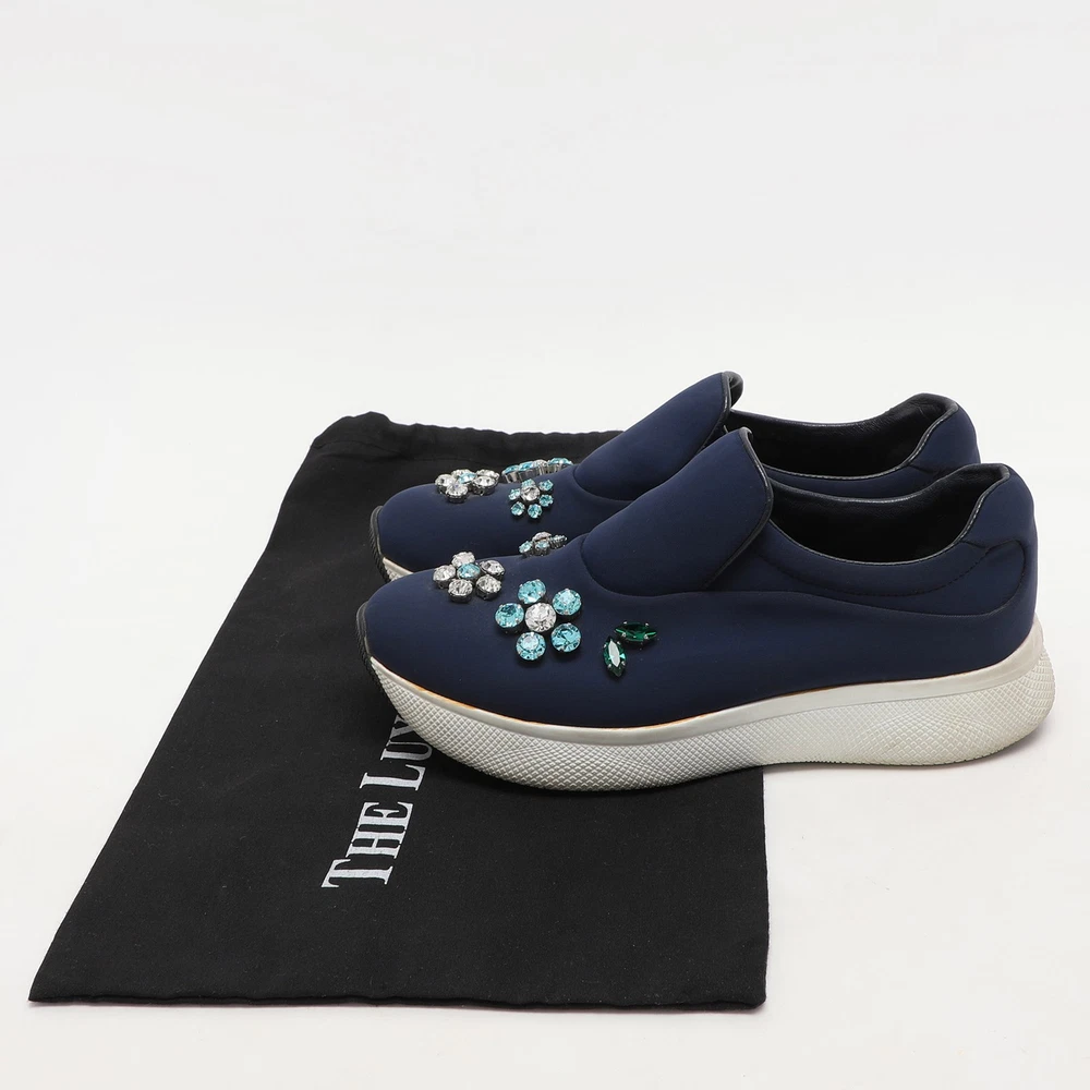 Step into elegance with these captivating slip on sneakers by Prada, beautifully crafted from premium blue nylon. Adorned with shimmering crystals, they add a touch of sparkle to your stride. The leather lining and insole ensure a plush feel, while a durable rubber sole provides the perfect blend of comfort and style. Perfect for the modern woman who cherishes luxury and bold design, these sneakers are a statement in sophisticated casual wear.Certified by The Luxury Closet - This item has gone through a detailed authentication process overseen by our experts. We offer a lifetime guarantee of authenticity on all our items. Import duties, taxes and charges are not included in the item price. These charges are the buyers responsibility. Please check with your country’s customs office to determine what these additional cost will be prior to buying. Our eBay Store About Us Contact Us Add to Favorite Sellers Prada Blue Nylon Catch Me If You Can Crystal Embellished Slip On Sneakers Size 35.5 $199.1 Step into elegance with these captivating slip on sneakers by Prada, beautifully crafted from premium blue nylon. Adorned with shimmering crystals, they add a touch of sparkle to your stride. The leather lining and insole ensure a plush feel, while a durable rubber sole provides the perfect blend of comfort and style. Perfect for the modern woman who cherishes luxury and bold design, these sneakers are a statement in sophisticated casual wear. Product Details Brand Color Blue Dimensions Material Nylon Size 35.5 Outsole Width 9 cm Outsole Length 26.5 cm Heel Height Includes The Luxury Closet Packaging Certified by The Luxury Closet This item has gone through a detailed authentication process overseen by our experts. We offer a lifetime guarantee of authenticity on all our items. How We Check The in-house team of experts at The Luxury Closet is highly trained to verify the authenticity and the condition of the luxury products. They ensure that only 100% authentic items are put on sale.The evaluation process is unique with its own mix of assessment criteria and differs according to the category. Each item is evaluated based on the following combination of hallmarks, hardware, stitching, symmetry, material, craftsmanship, stamping, codes, hologram stickers, and packaging. Our authenticators also check if the items have been modified or amended (e.g., aftermarket diamonds, replaced batteries, repaired bags, etc.) International Buyers Import duties, taxes and charges are not included in the item price. These charges are the buyers responsibility. Please check with your country’s customs office to determine what these additional cost will be prior to buying.