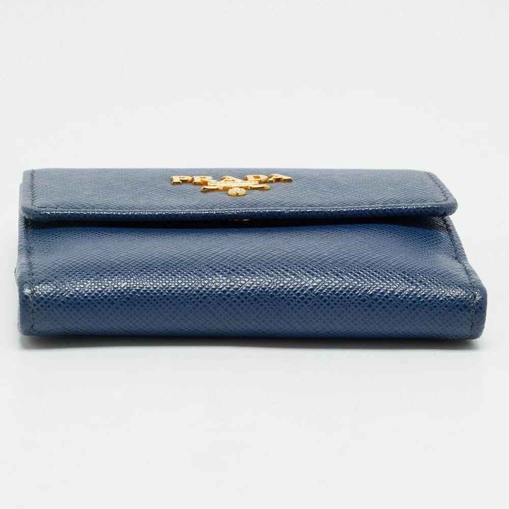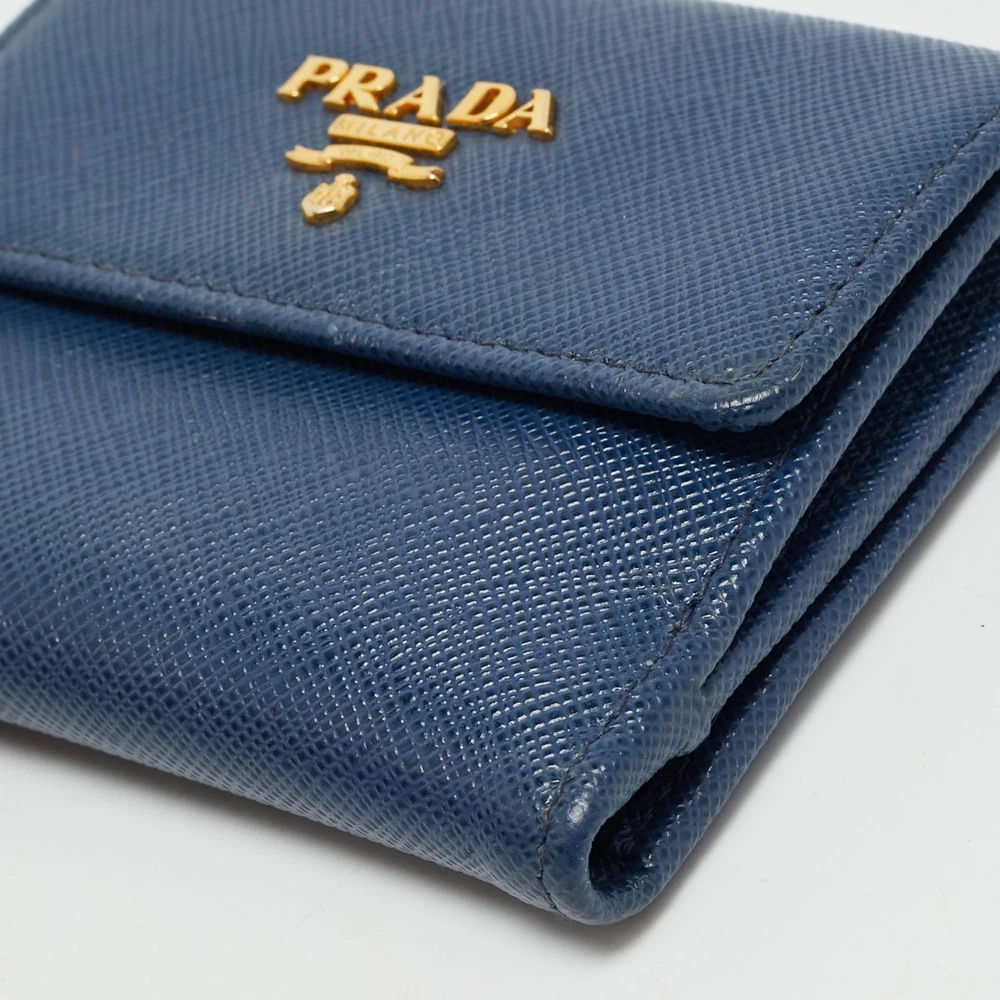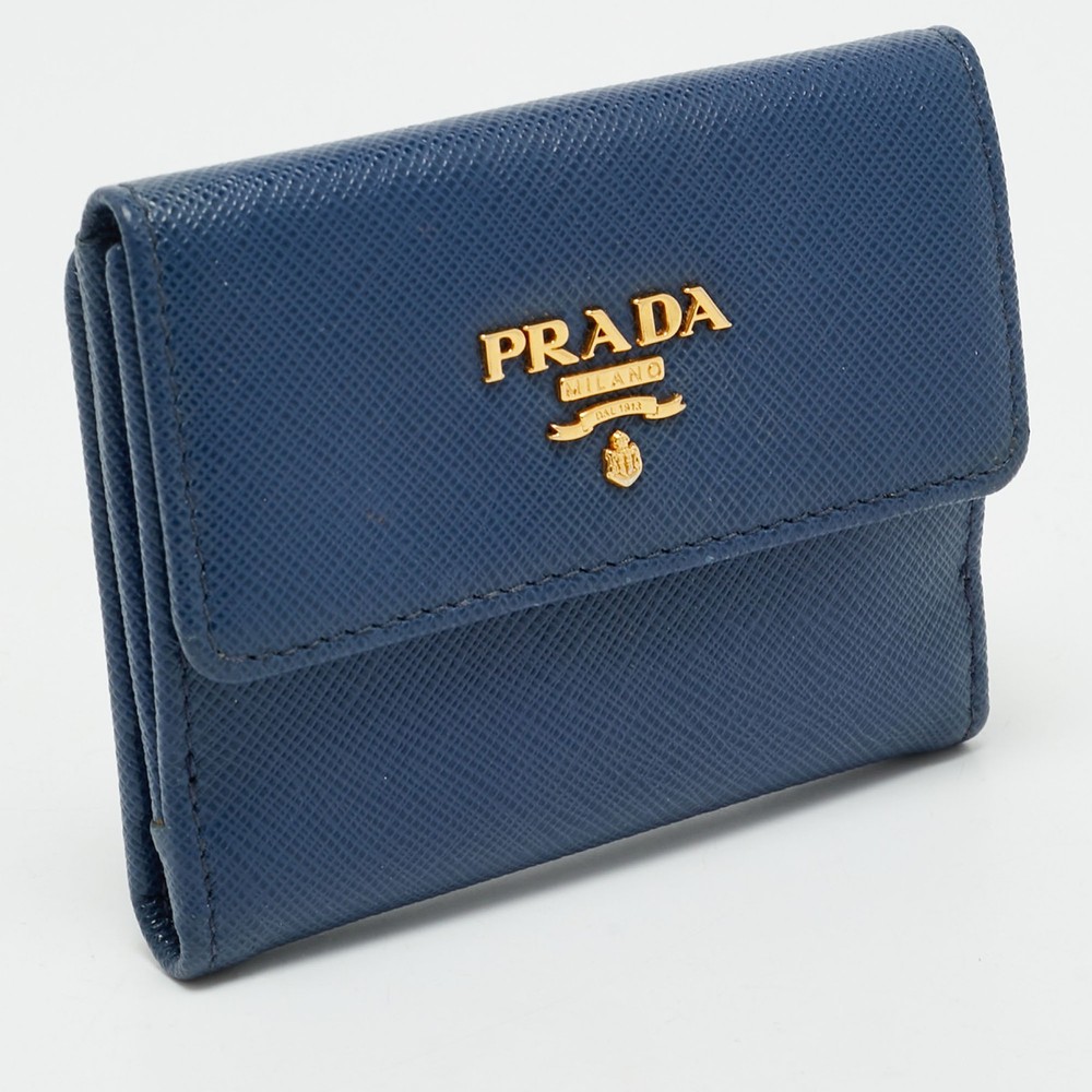 Crafted in durable blue Saffiano leather with a subtle metallic sheen, this Prada French wallet offers a compact design with gleaming logo detail—ideal for small bags and streamlined organization.Certified by The Luxury Closet - This item has gone through a detailed authentication process overseen by our experts. We offer a lifetime guarantee of authenticity on all our items. Import duties, taxes and charges are not included in the item price. These charges are the buyers responsibility. Please check with your country’s customs office to determine what these additional cost will be prior to buying. Our eBay Store About Us Contact Us Add to Favorite Sellers Prada Blue Saffiano Metal Leather French Compact Wallet $322.3 Crafted in durable blue Saffiano leather with a subtle metallic sheen, this Prada French wallet offers a compact design with gleaming logo detail—ideal for small bags and streamlined organization. Product Details Brand Color Blue Dimensions Material Leather Size Outsole Width Outsole Length Heel Height Includes Certified by The Luxury Closet This item has gone through a detailed authentication process overseen by our experts. We offer a lifetime guarantee of authenticity on all our items. How We Check The in-house team of experts at The Luxury Closet is highly trained to verify the authenticity and the condition of the luxury products. They ensure that only 100% authentic items are put on sale.The evaluation process is unique with its own mix of assessment criteria and differs according to the category. Each item is evaluated based on the following combination of hallmarks, hardware, stitching, symmetry, material, craftsmanship, stamping, codes, hologram stickers, and packaging. Our authenticators also check if the items have been modified or amended (e.g., aftermarket diamonds, replaced batteries, repaired bags, etc.) International Buyers Import duties, taxes and charges are not included in the item price. These charges are the buyers responsibility. Please check with your country’s customs office to determine what these additional cost will be prior to buying.