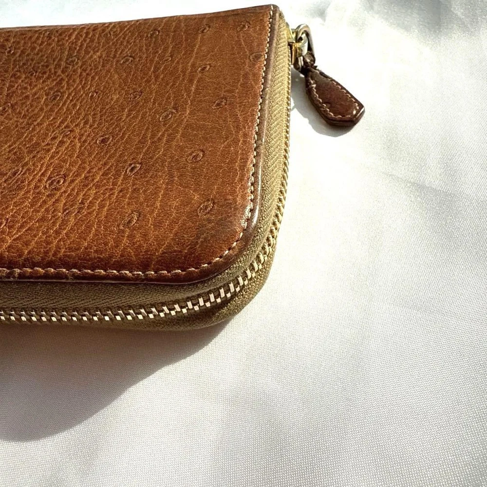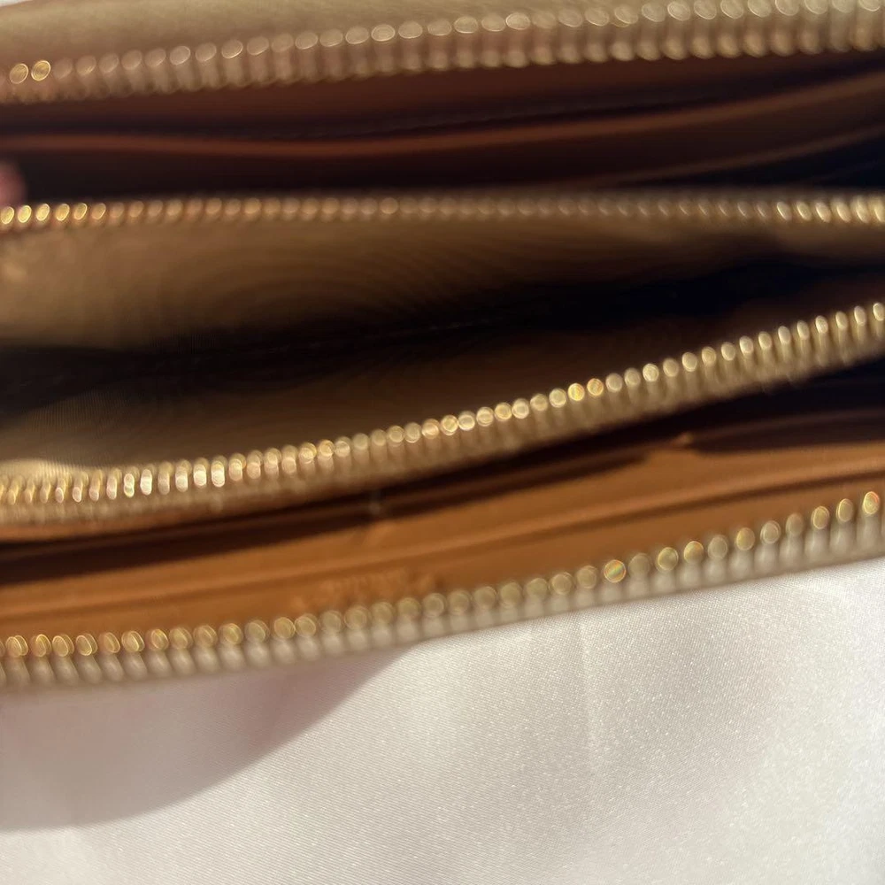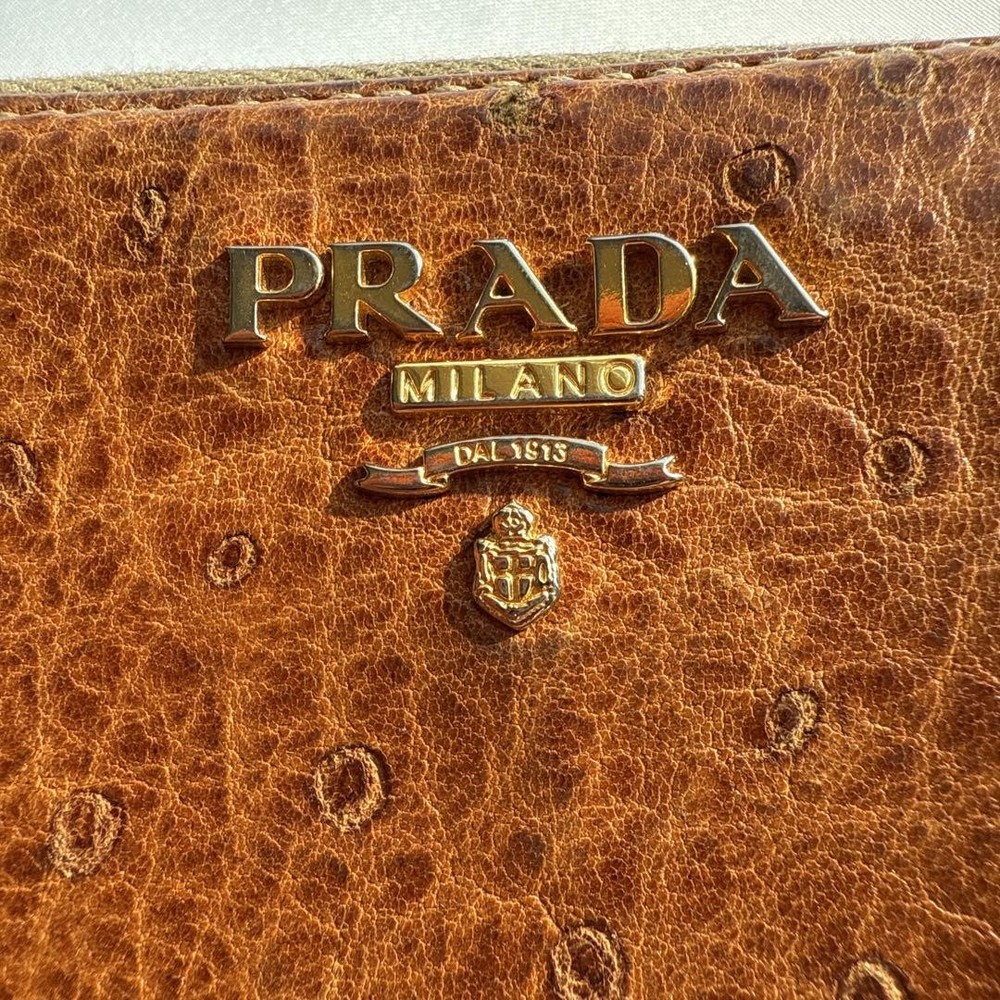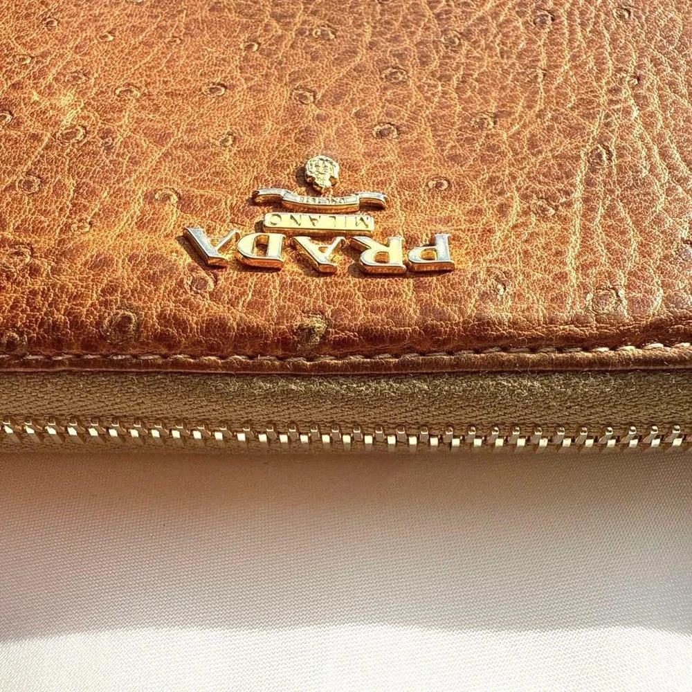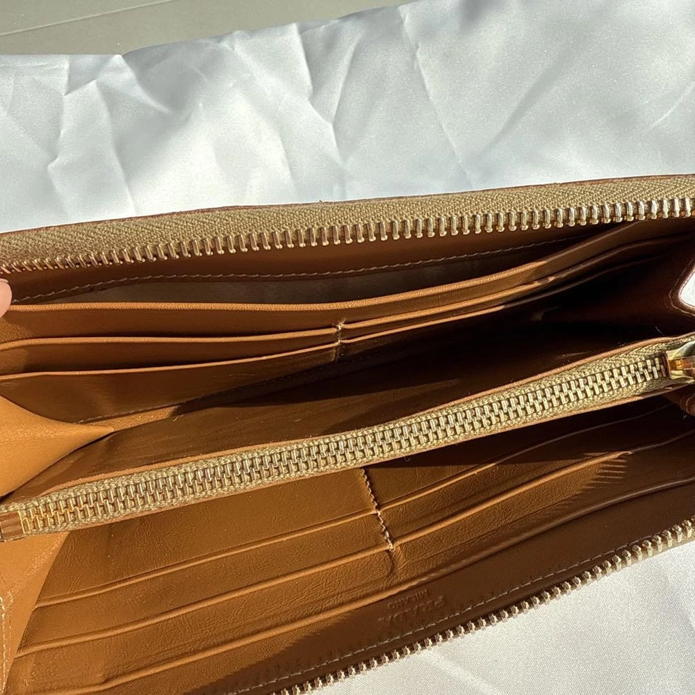 Absolutely love this Prada wallet! The brown leather feels luxurious and the gold logo adds such a classy touch. The round zipper design is both unique and practical, keeping everything secure. It's the perfect size and looks amazing. Highly recommend!