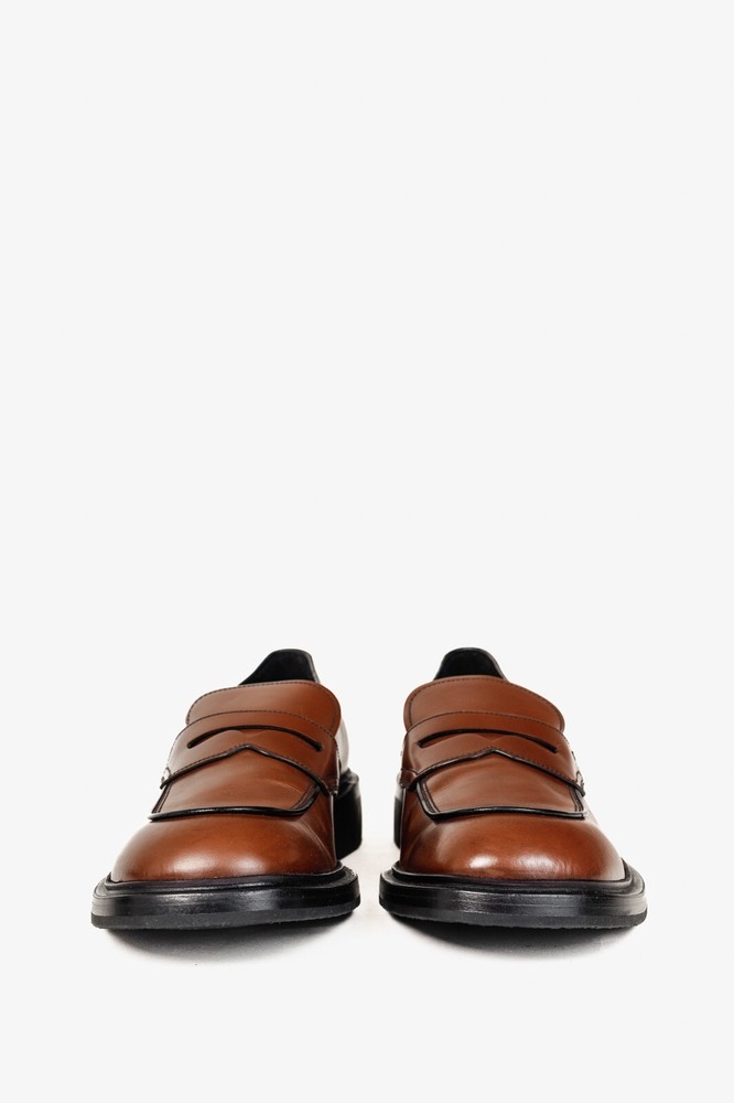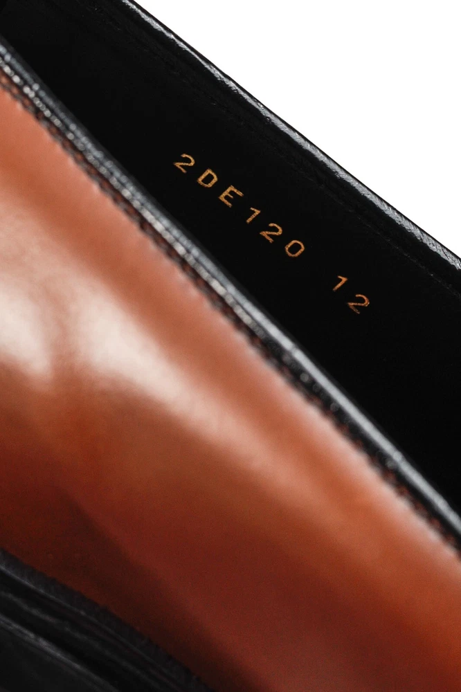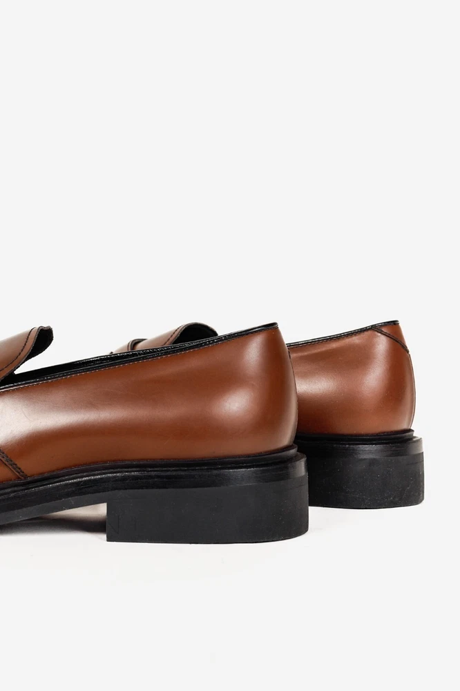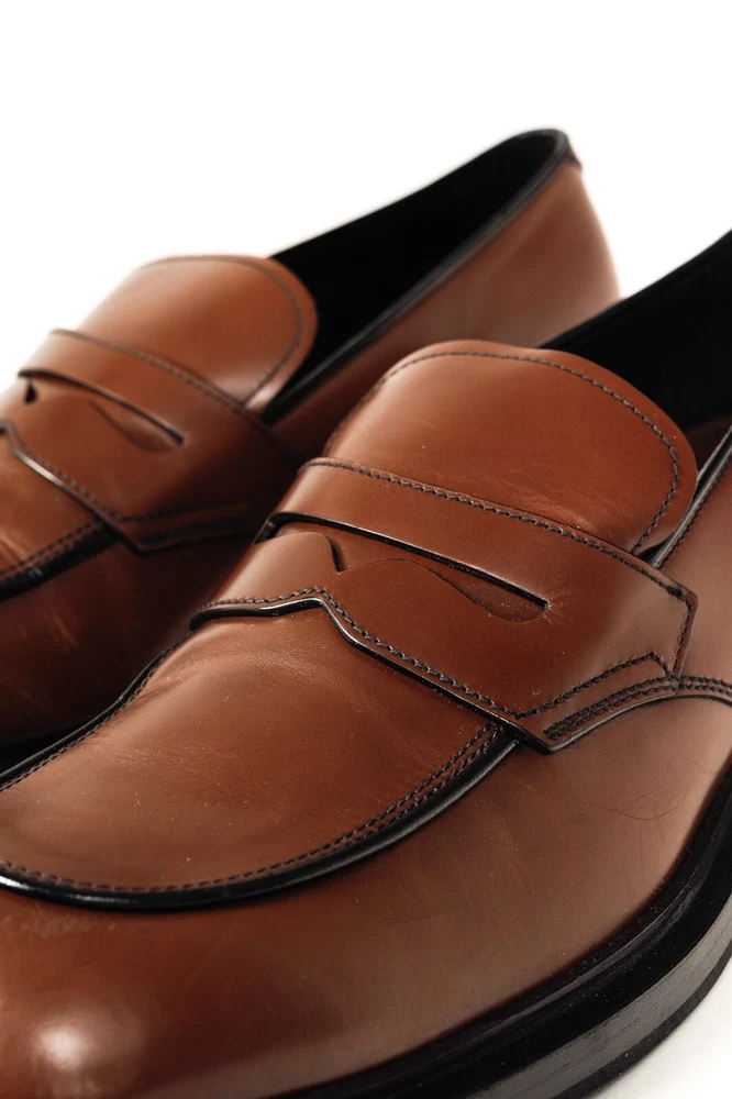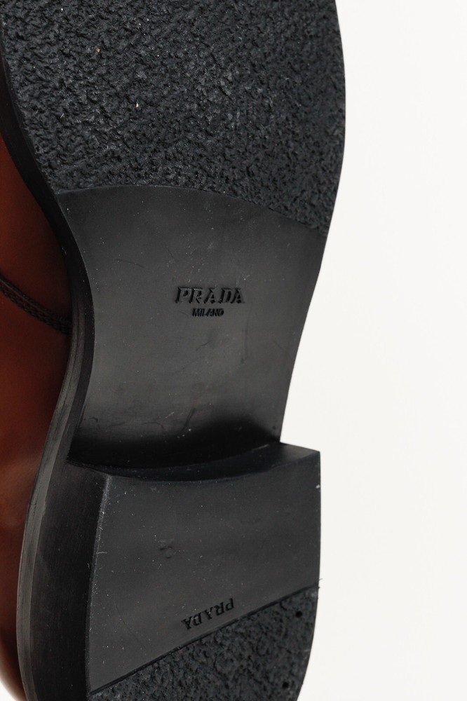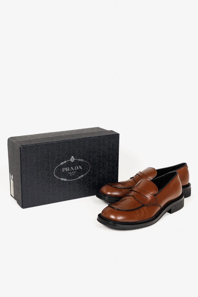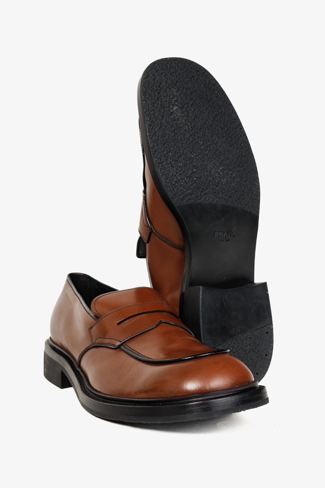 Circa 2019, these Italian-made loafers from Prada are crafted with a Bright Calf leather in a Bruciato brown, and feature flat block heels, closed rounded toes, penny straps, piped detailing, small platforms, and leather lining and soles. Size: 12 Condition: Excellent; light scuffing on upper, light wear on outsoles. Comes with care card, dustbags, and box. Approximate Measurements: Insole Length: 12” (30.5 cm) Heel Height: 1.5” (4 cm) Platform Height: 0.75" (2 cm) Composition: Leather upper and lining, leather and manmade outsoles.