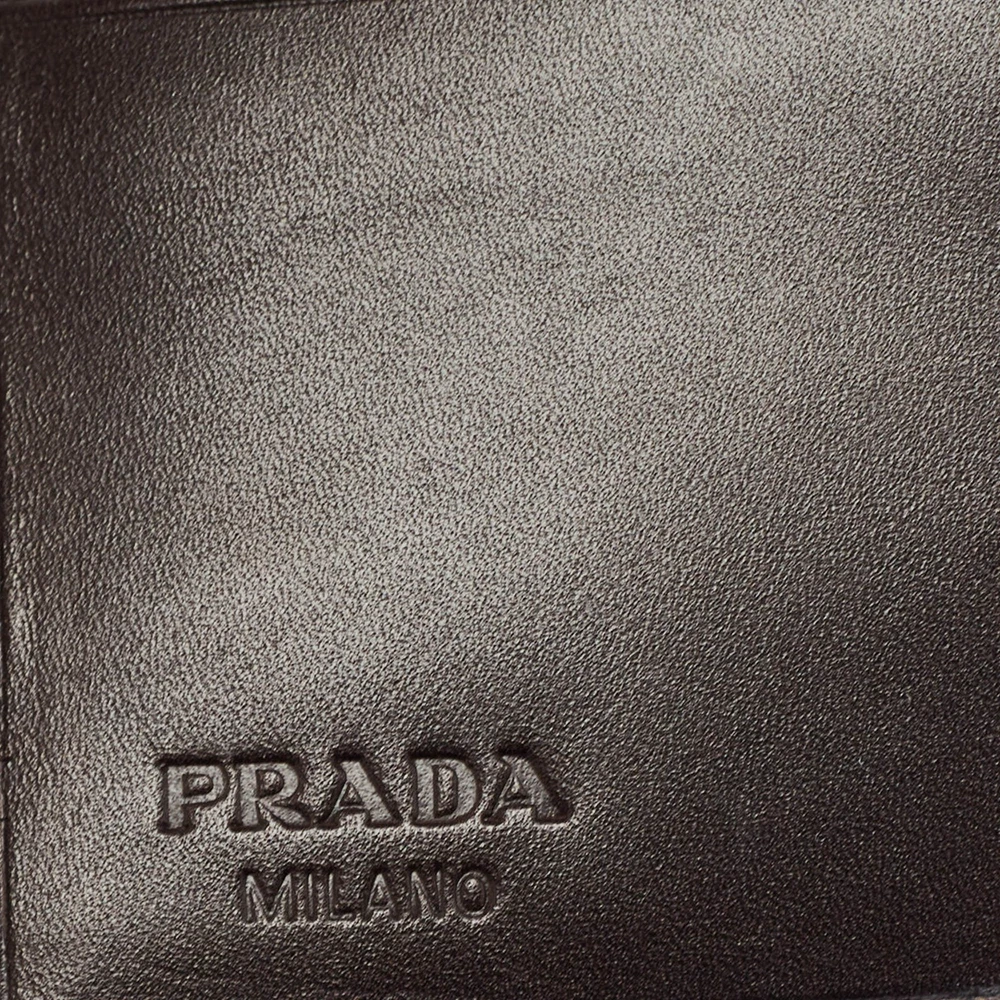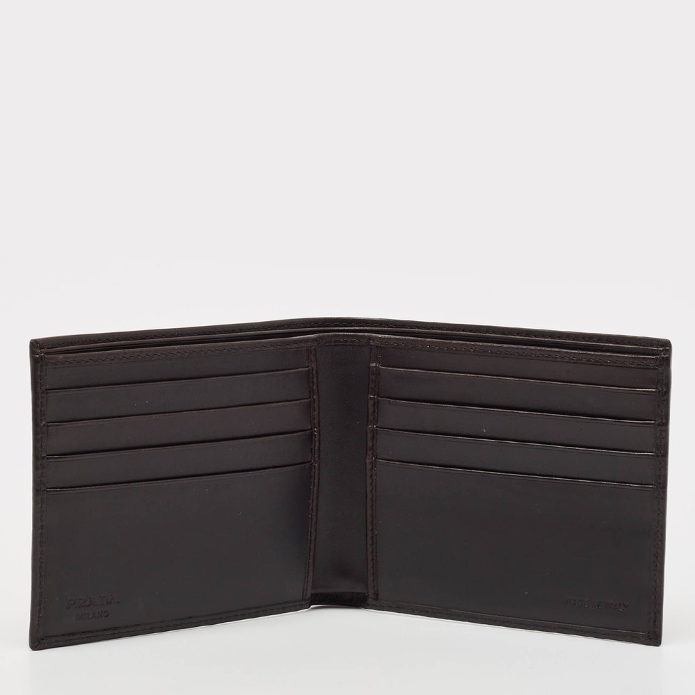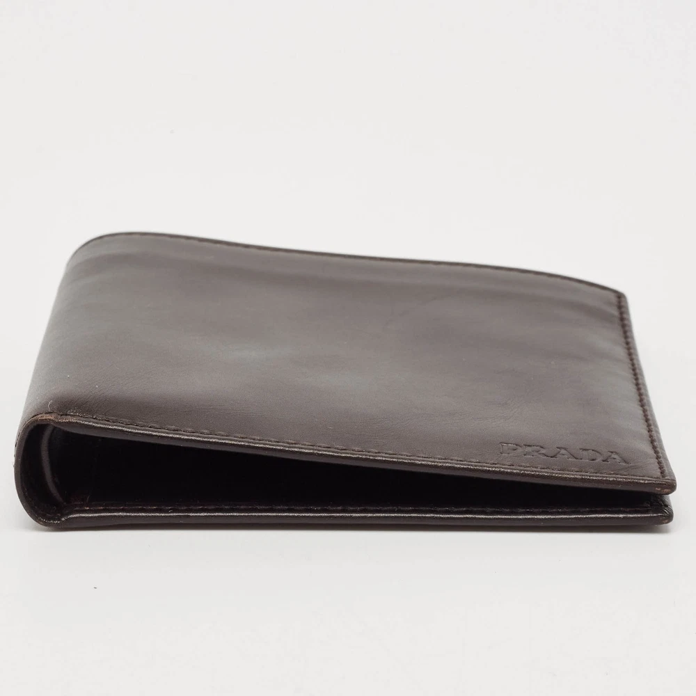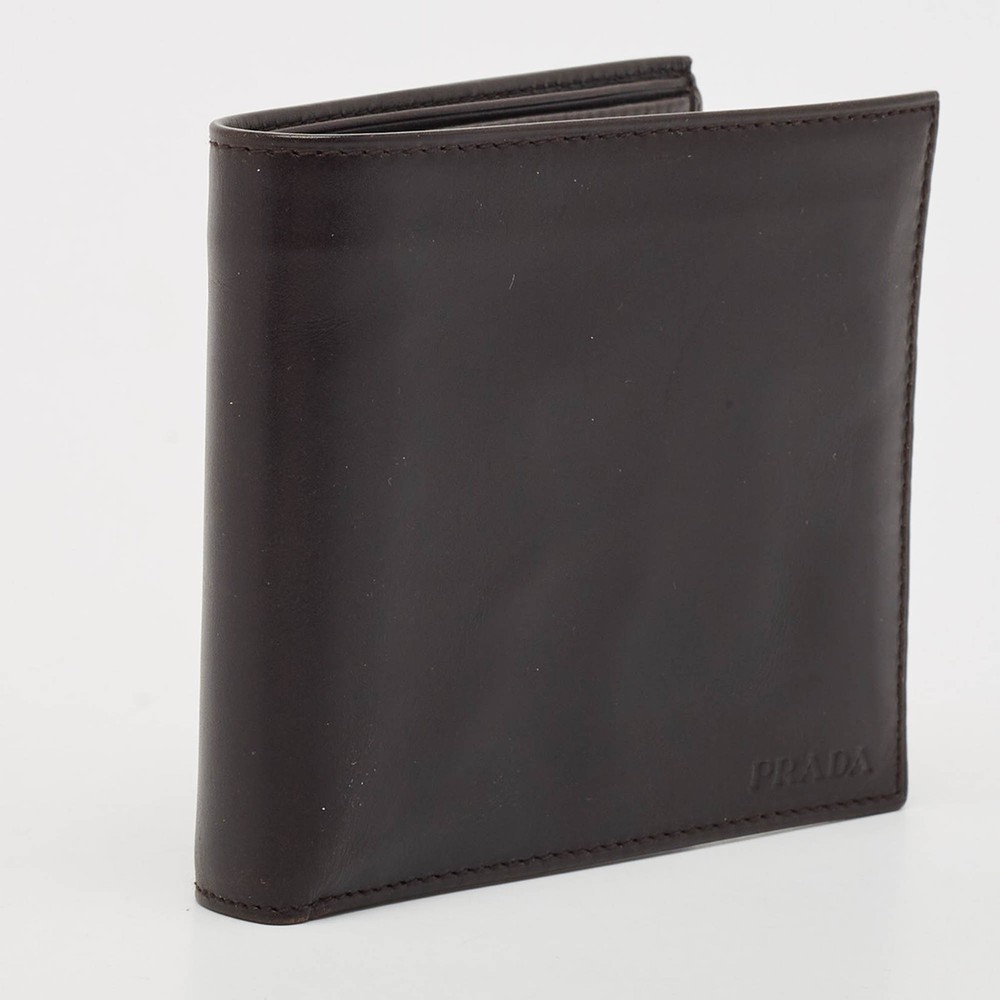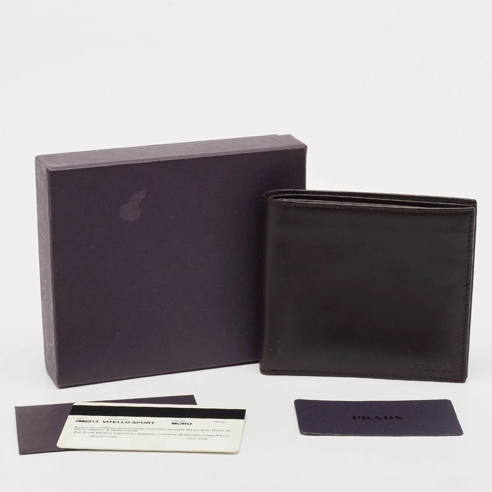 Crafted with Vitello leather, this Prada bifold wallet for men reflects unparalleled Italian craftsmanship. Its sleek design effortlessly merges elegance with functionality. Finished with the brand detail, it is perfect for the discerning gentleman.Certified by The Luxury Closet - This item has gone through a detailed authentication process overseen by our experts. We offer a lifetime guarantee of authenticity on all our items. Import duties, taxes and charges are not included in the item price. These charges are the buyers responsibility. Please check with your country’s customs office to determine what these additional cost will be prior to buying. Our eBay Store About Us Contact Us Add to Favorite Sellers Prada Dark Brown Vitello Sport Leather Bifold Wallet $200.2 Crafted with Vitello leather, this Prada bifold wallet for men reflects unparalleled Italian craftsmanship. Its sleek design effortlessly merges elegance with functionality. Finished with the brand detail, it is perfect for the discerning gentleman. Product Details Brand Color Brown Dimensions Height: 9.5 cm, Width: 1.5 cm, Length: 11 cm Material Leather Size Outsole Width Outsole Length Heel Height Includes Original Box, Authenticity Card, Info Card Certified by The Luxury Closet This item has gone through a detailed authentication process overseen by our experts. We offer a lifetime guarantee of authenticity on all our items. How We Check The in-house team of experts at The Luxury Closet is highly trained to verify the authenticity and the condition of the luxury products. They ensure that only 100% authentic items are put on sale.The evaluation process is unique with its own mix of assessment criteria and differs according to the category. Each item is evaluated based on the following combination of hallmarks, hardware, stitching, symmetry, material, craftsmanship, stamping, codes, hologram stickers, and packaging. Our authenticators also check if the items have been modified or amended (e.g., aftermarket diamonds, replaced batteries, repaired bags, etc.) International Buyers Import duties, taxes and charges are not included in the item price. These charges are the buyers responsibility. Please check with your country’s customs office to determine what these additional cost will be prior to buying.