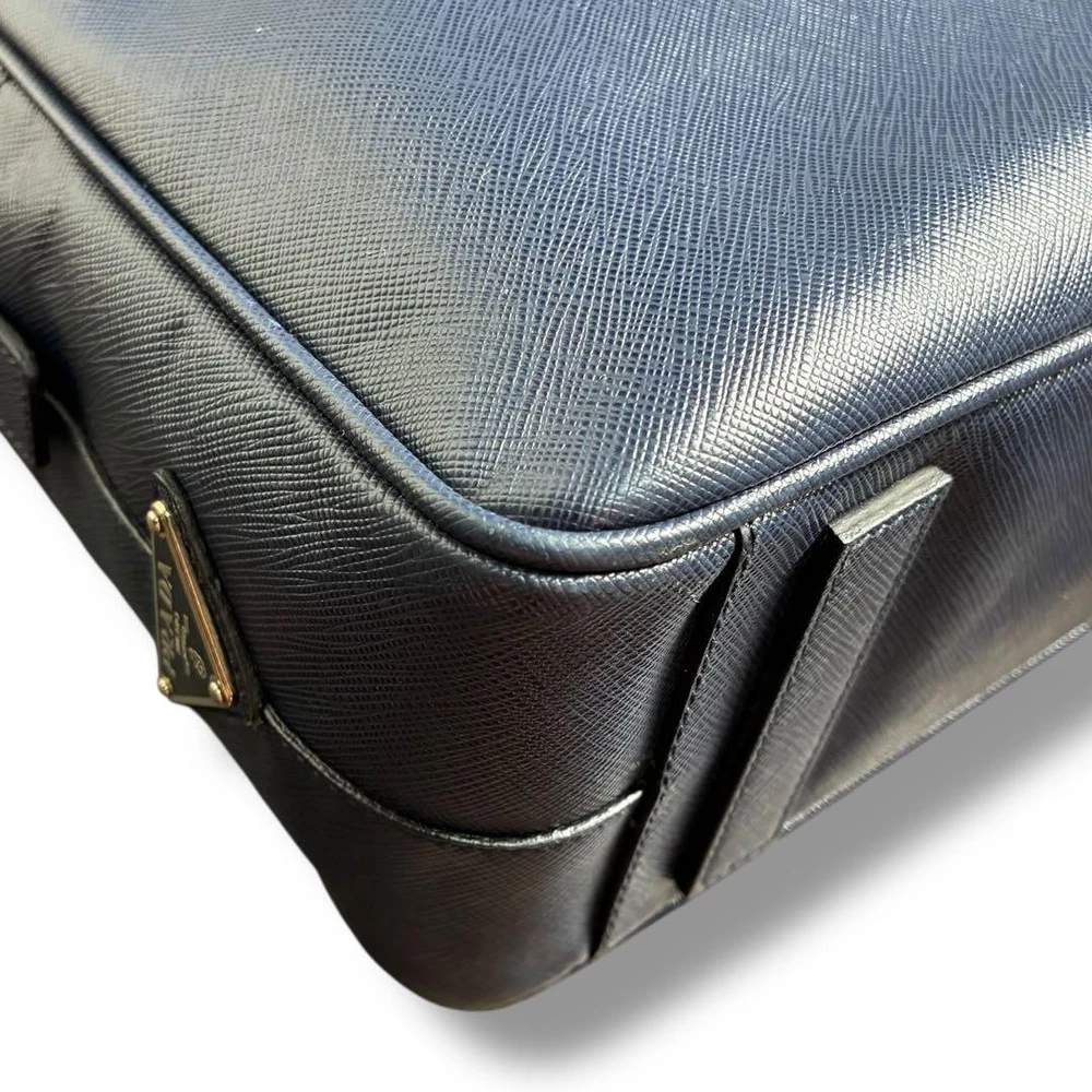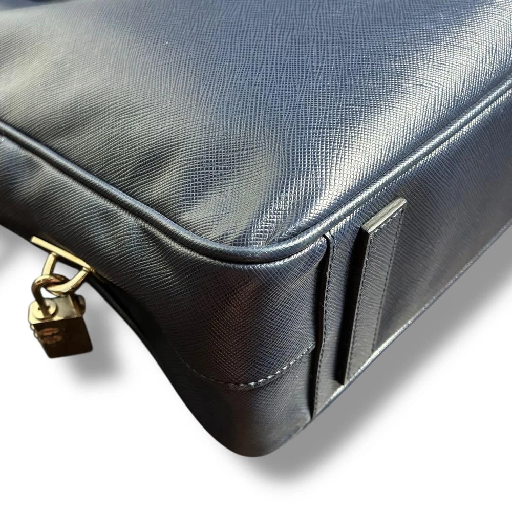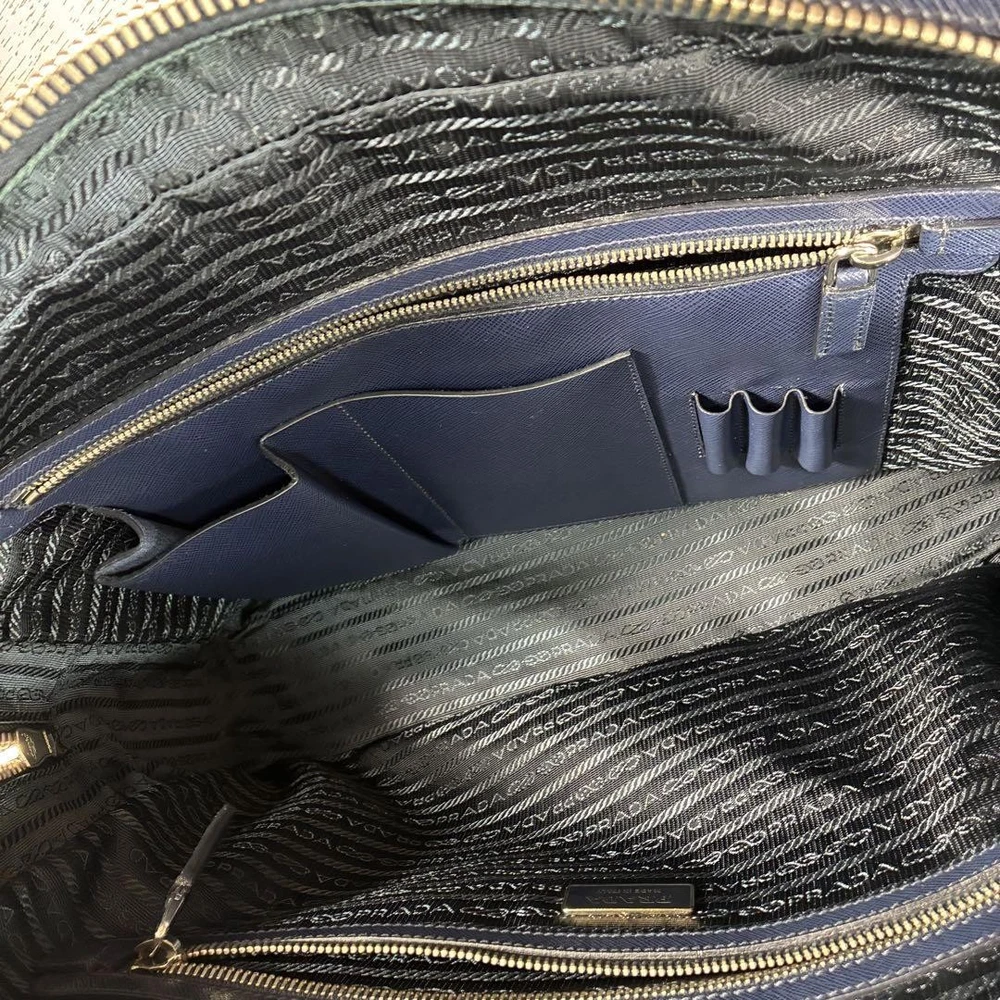 This Prada business bag is absolutely stunning! The navy saffiano leather is sleek and durable, while the iconic triangle logo adds a touch of luxury. The padlock and key give it extra security, and the included storage pouch is a nice bonus. The size is perfect for work or travel, and it’s in flawless condition—no scratches or stains. A must-have for anyone who loves high-end designer bags!