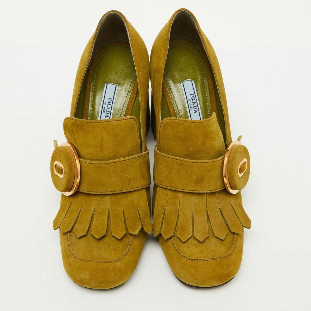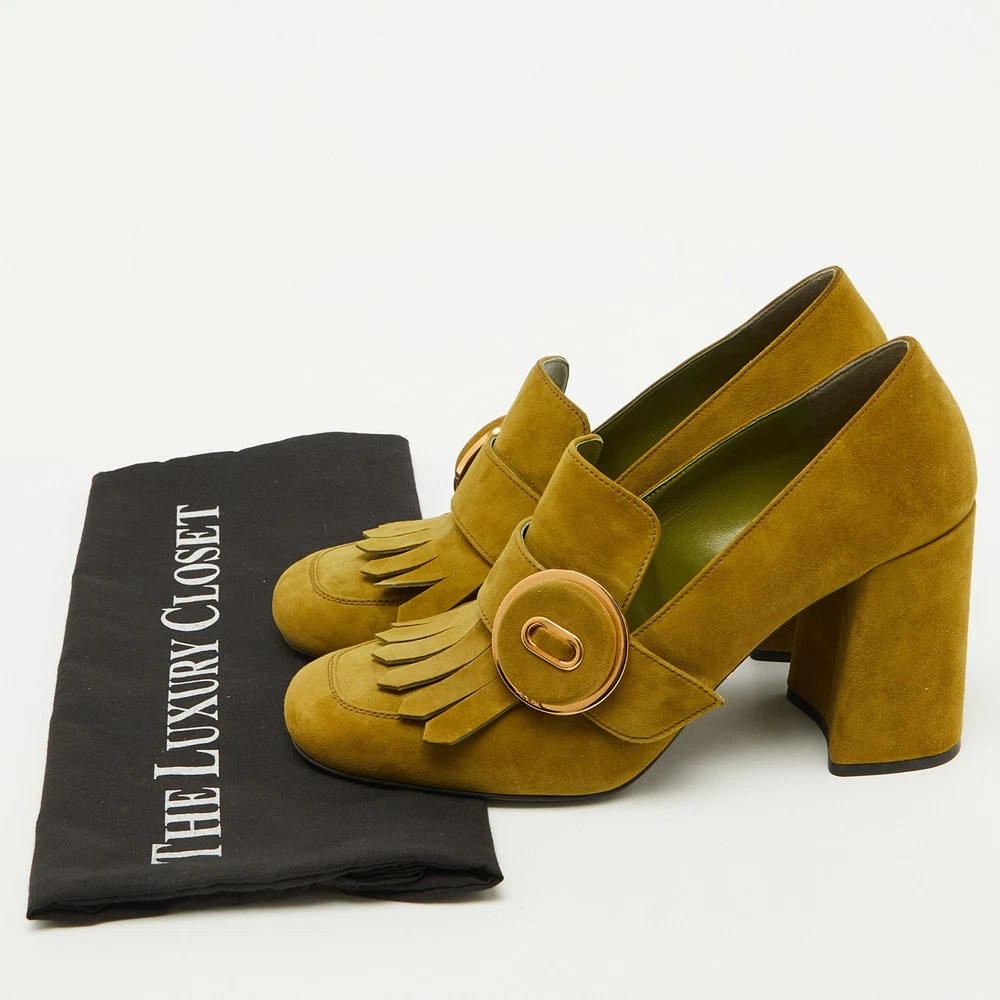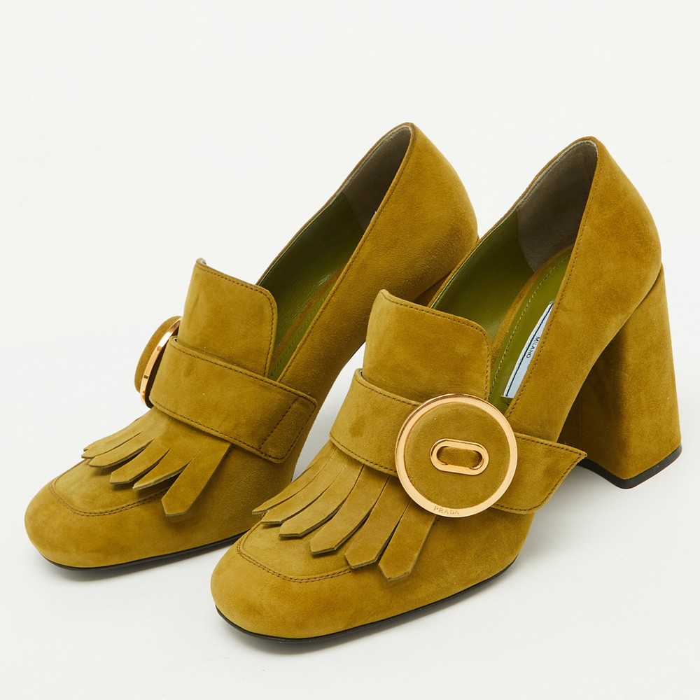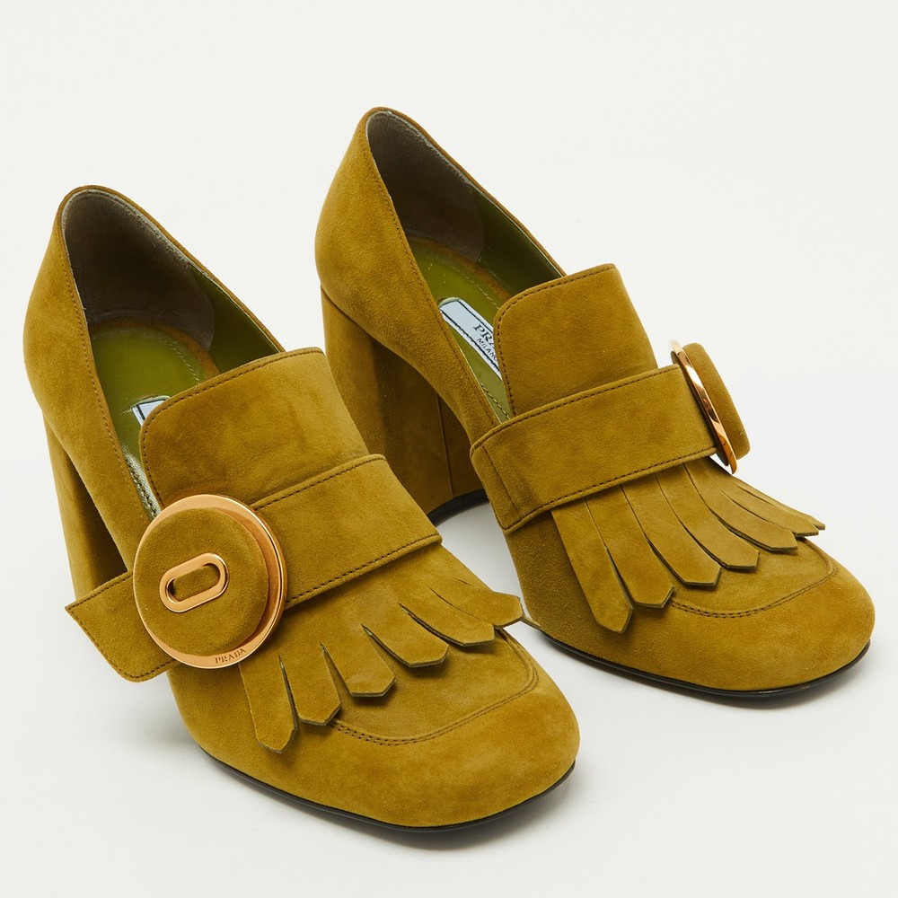 Exhibit an elegant style with this pair of pumps. These elegant shoes are crafted from quality materials. They are set on durable soles and sleek heels.Certified by The Luxury Closet - This item has gone through a detailed authentication process overseen by our experts. We offer a lifetime guarantee of authenticity on all our items. Import duties, taxes and charges are not included in the item price. These charges are the buyers responsibility. Please check with your country’s customs office to determine what these additional cost will be prior to buying. Our eBay Store About Us Contact Us Add to Favorite Sellers Prada Green Suede Fringe Block Heel Pumps Size 37 $187 Exhibit an elegant style with this pair of pumps. These elegant shoes are crafted from quality materials. They are set on durable soles and sleek heels. Product Details Brand Color Green Dimensions Material Suede Size 37 Outsole Width 8 cm Outsole Length 23 cm Heel Height 9 cm Includes The Luxury Closet Packaging Certified by The Luxury Closet This item has gone through a detailed authentication process overseen by our experts. We offer a lifetime guarantee of authenticity on all our items. How We Check The in-house team of experts at The Luxury Closet is highly trained to verify the authenticity and the condition of the luxury products. They ensure that only 100% authentic items are put on sale.The evaluation process is unique with its own mix of assessment criteria and differs according to the category. Each item is evaluated based on the following combination of hallmarks, hardware, stitching, symmetry, material, craftsmanship, stamping, codes, hologram stickers, and packaging. Our authenticators also check if the items have been modified or amended (e.g., aftermarket diamonds, replaced batteries, repaired bags, etc.) International Buyers Import duties, taxes and charges are not included in the item price. These charges are the buyers responsibility. Please check with your country’s customs office to determine what these additional cost will be prior to buying.