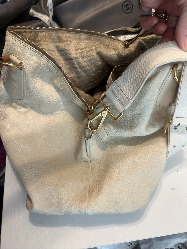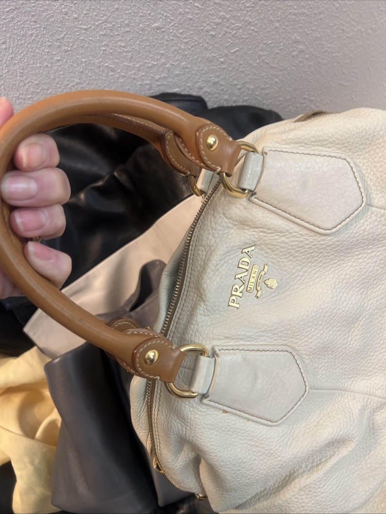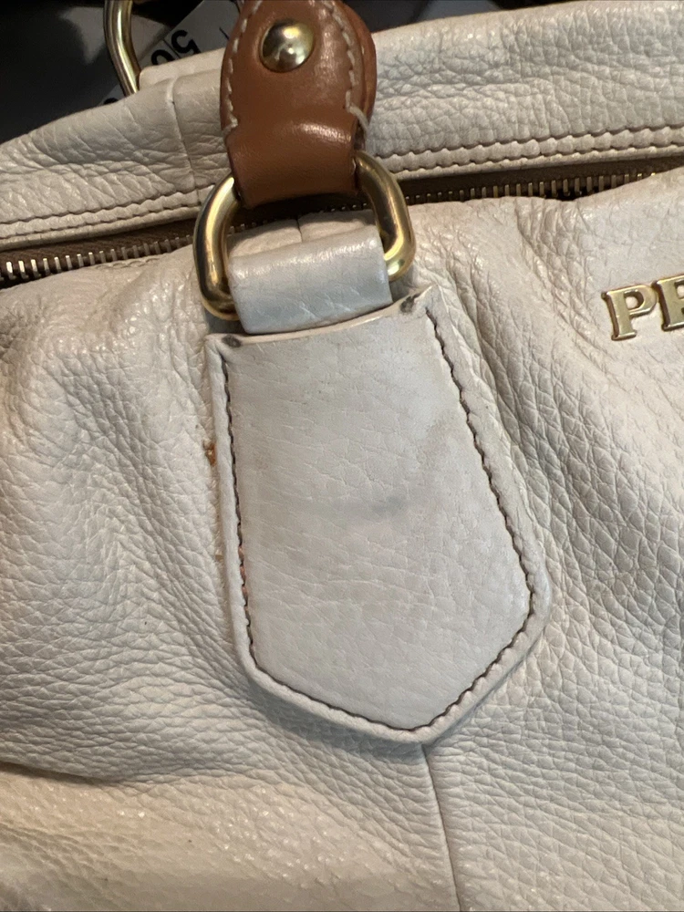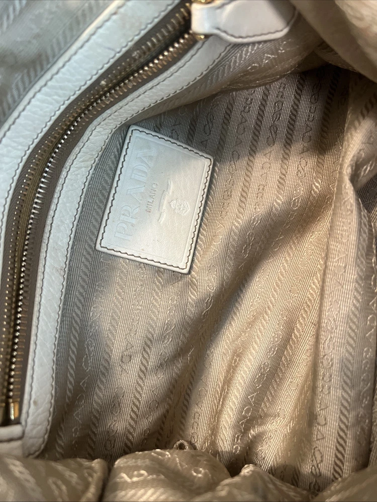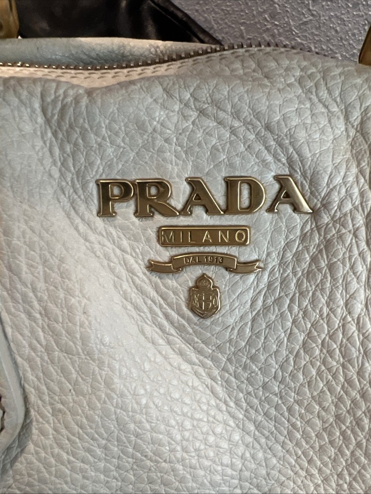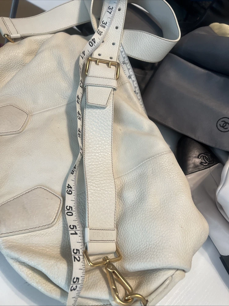 This is beautiful and it does have some wear and wrinkles and stains. It’s all very minor. It still looks very gorgeous and the lining is very clean except for a few pen marks. No odor s at all and smoke free. The Prada handbag is a luxurious accessory for women, featuring a large size with top handles and a long adjustable shoulder strap in ivory leather. The gold hardware accents, including the signature Prada Milano logo, add a touch of elegance to this stylish and sophisticated handbag. The zip closure and fabric lining ensure the secure storage of your belongings, making it a practical yet fashionable choice for everyday use or special occasions. The combination of high-quality materials and iconic brand design make this handbag a must-have for any fashion-forward individual.