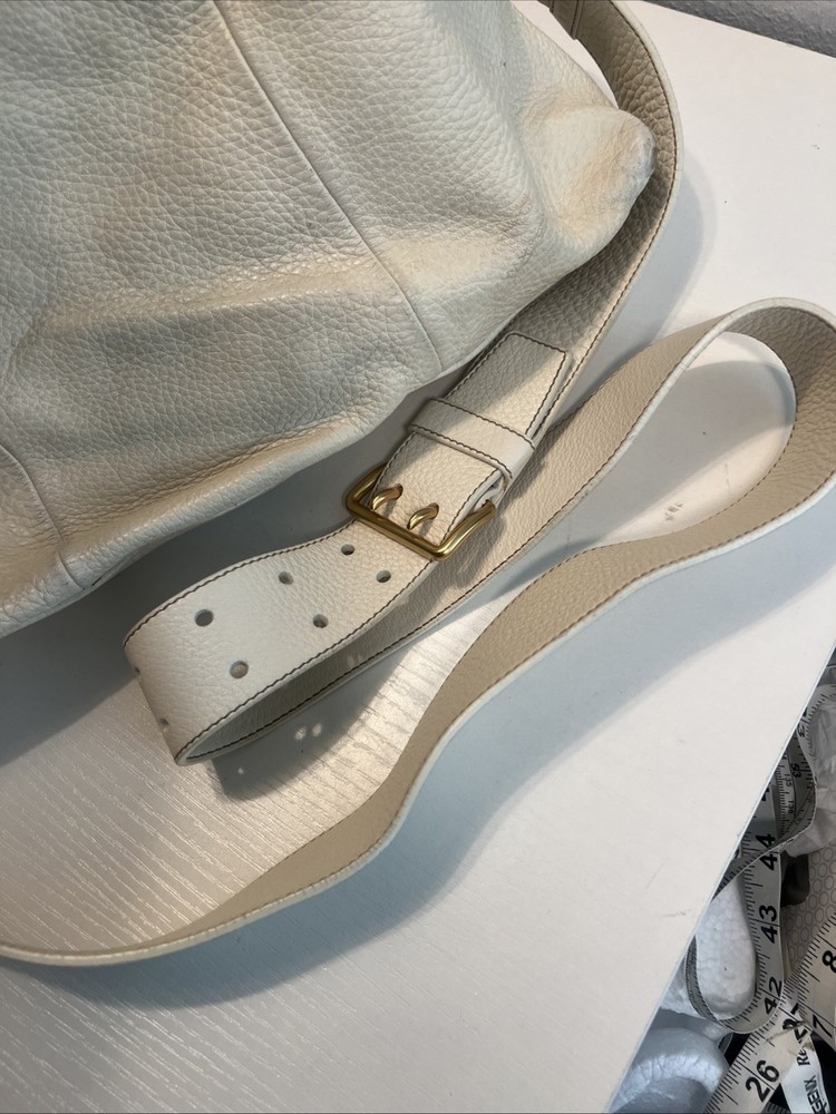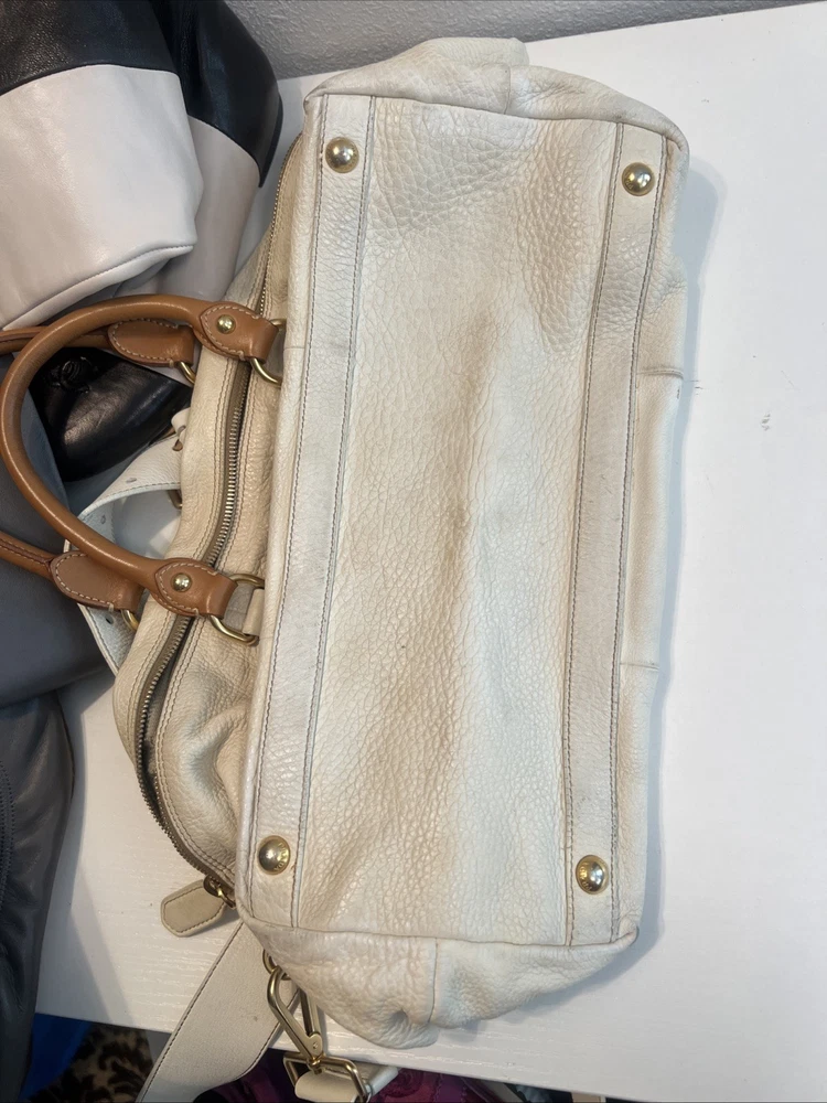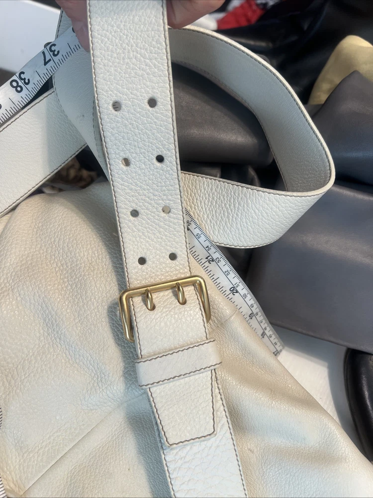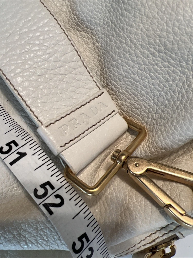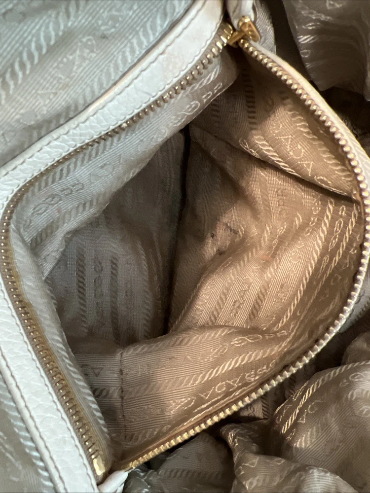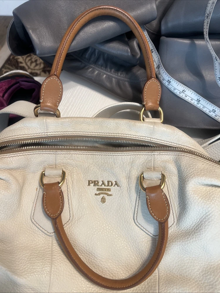 This is beautiful and it does have some wear and wrinkles and stains. It’s all very minor. It still looks very gorgeous and the lining is very clean except for a few pen marks. No odor s at all and smoke free. The Prada handbag is a luxurious accessory for women, featuring a large size with top handles and a long adjustable shoulder strap in ivory leather. The gold hardware accents, including the signature Prada Milano logo, add a touch of elegance to this stylish and sophisticated handbag. The zip closure and fabric lining ensure the secure storage of your belongings, making it a practical yet fashionable choice for everyday use or special occasions. The combination of high-quality materials and iconic brand design make this handbag a must-have for any fashion-forward individual.