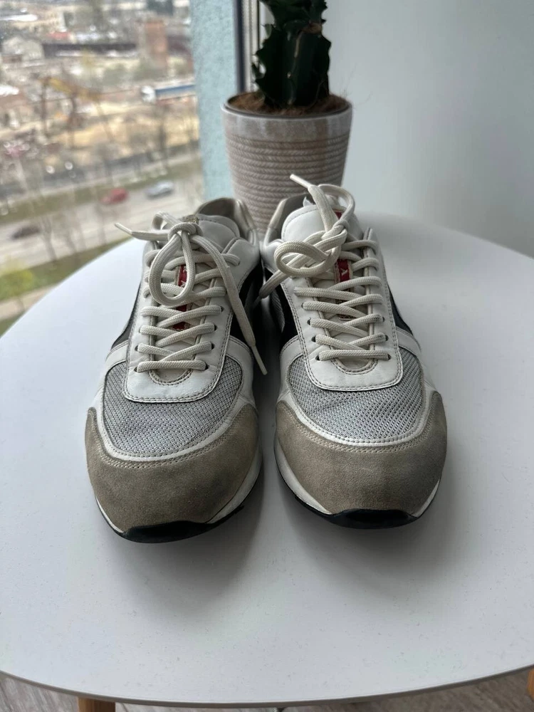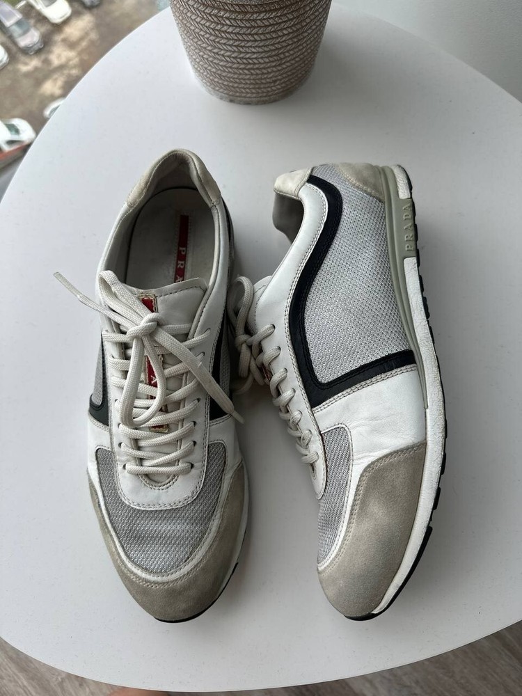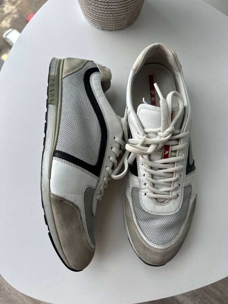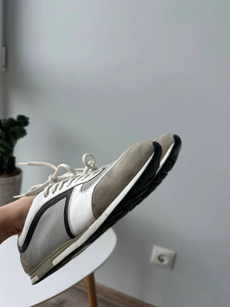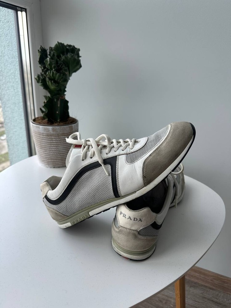 Elevate your style with these Prada leather suede sneakers, a blend of luxury and comfort that will complement any ensemble. These size US 9 / EU 42 shoes feature the iconic tab logo, embodying the quality and craftsmanship Prada is known for. With a versatile gray color, they are perfect for a variety of occasions, from casual outings to more formal events. Designed for the modern man, these sneakers are a vintage addition to your collection, made with an upper and lining material of premium leather. The durable leather outsole ensures longevity, while the canvas fabric type adds a touch of classic charm. Suitable for all seasons, these Prada sneakers are a testament to timeless fashion and functionality.
