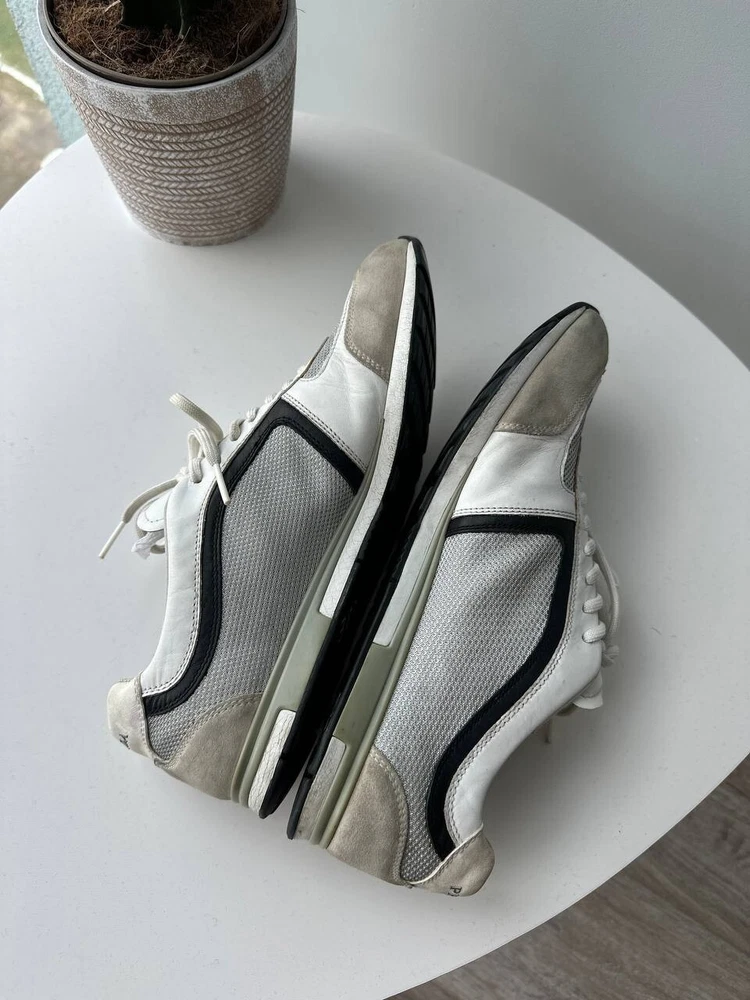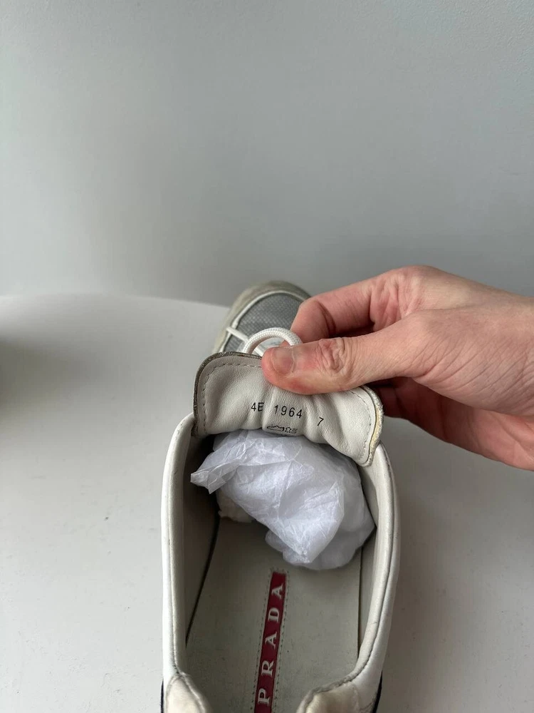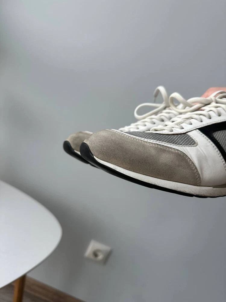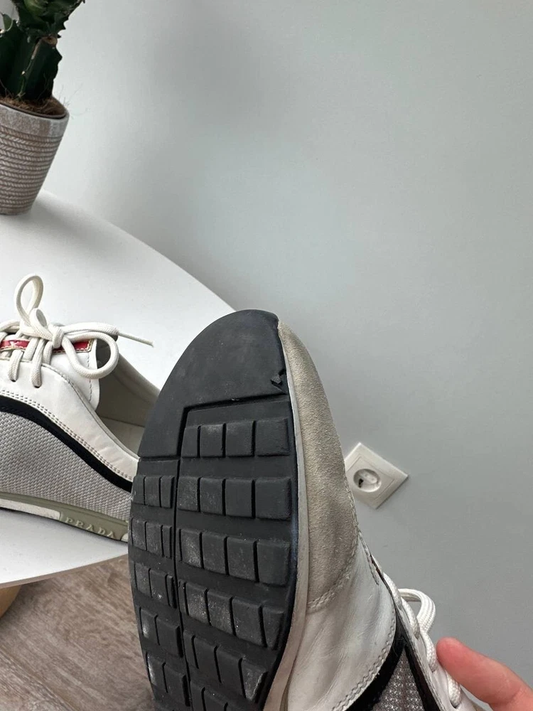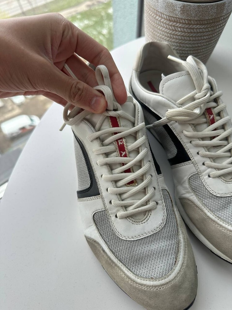 Elevate your style with these Prada leather suede sneakers, a blend of luxury and comfort that will complement any ensemble. These size US 9 / EU 42 shoes feature the iconic tab logo, embodying the quality and craftsmanship Prada is known for. With a versatile gray color, they are perfect for a variety of occasions, from casual outings to more formal events. Designed for the modern man, these sneakers are a vintage addition to your collection, made with an upper and lining material of premium leather. The durable leather outsole ensures longevity, while the canvas fabric type adds a touch of classic charm. Suitable for all seasons, these Prada sneakers are a testament to timeless fashion and functionality.