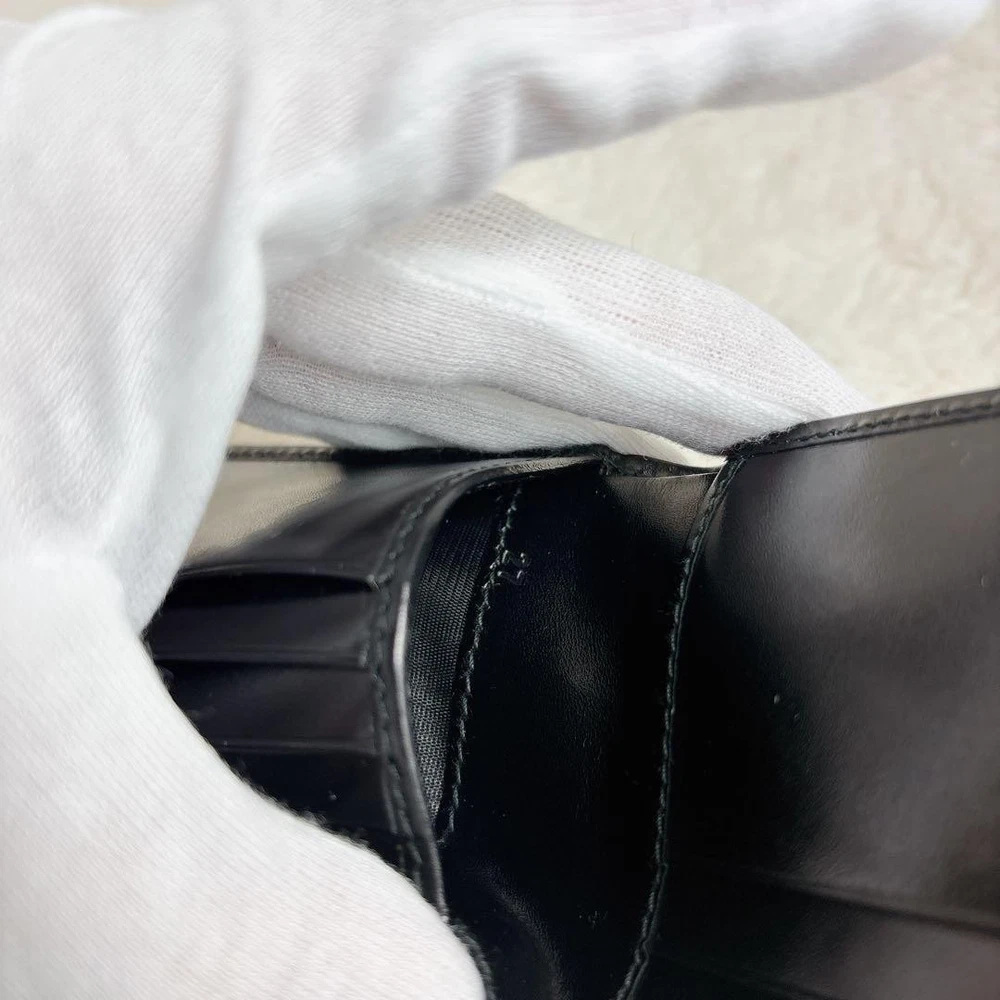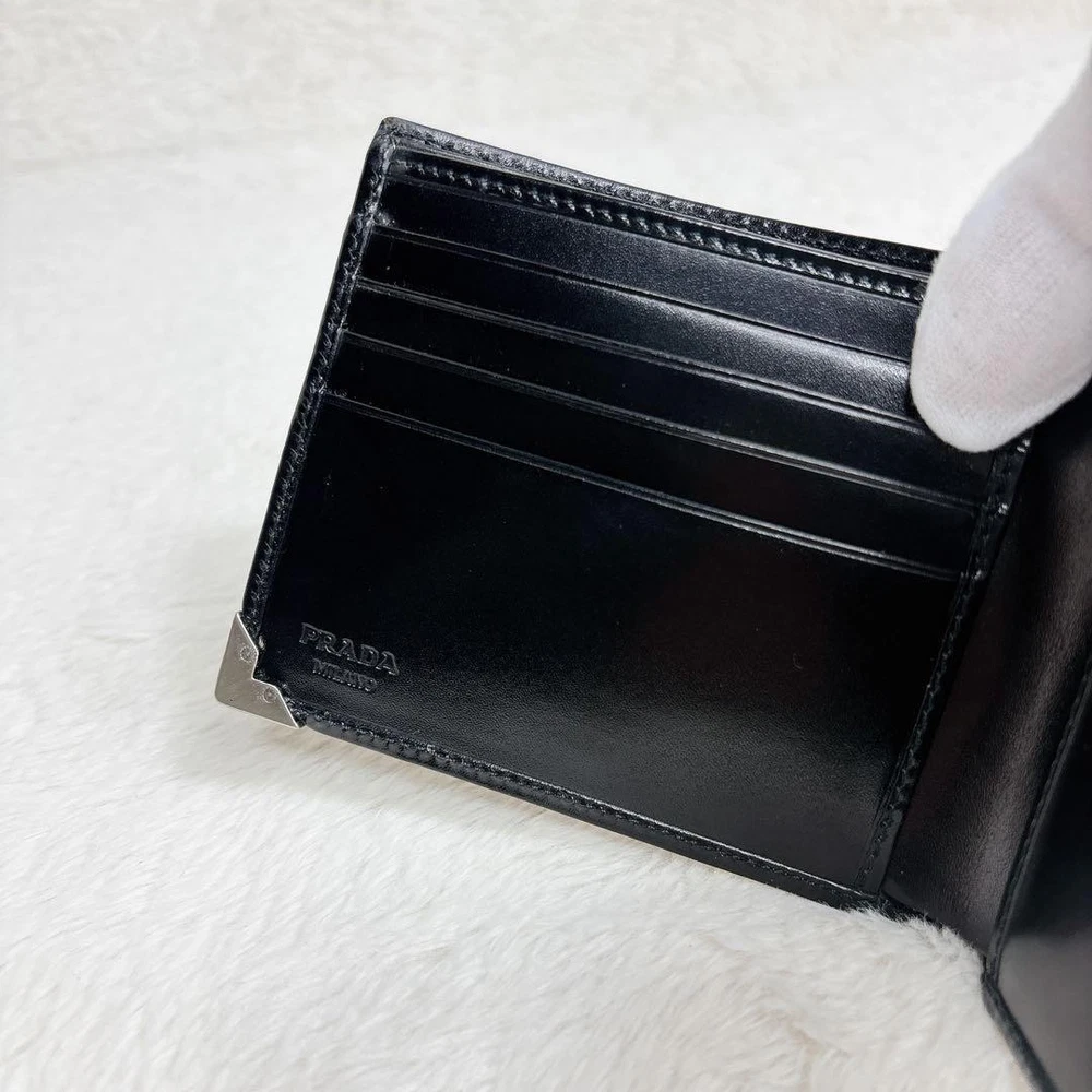 1. This compact wallet is surprisingly spacious and the leather feels amazing! Perfect size for pockets, and the Prada logo adds that classy touch. Even pre-owned, it's in great shape—just adds character. Love it!