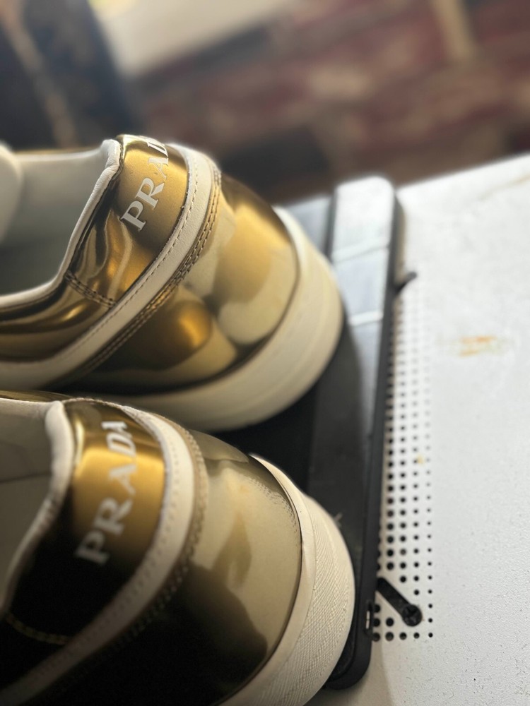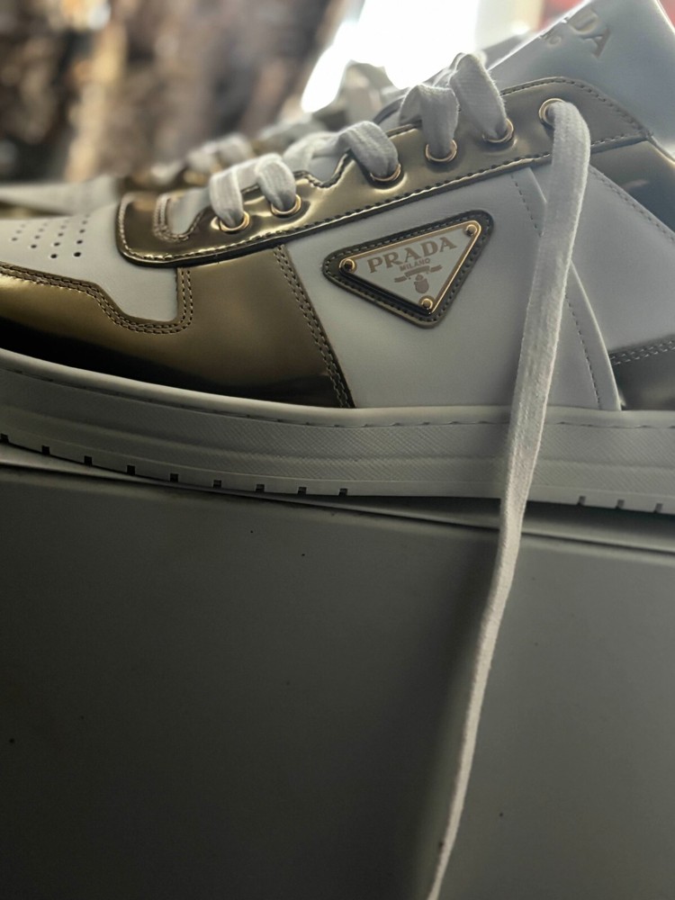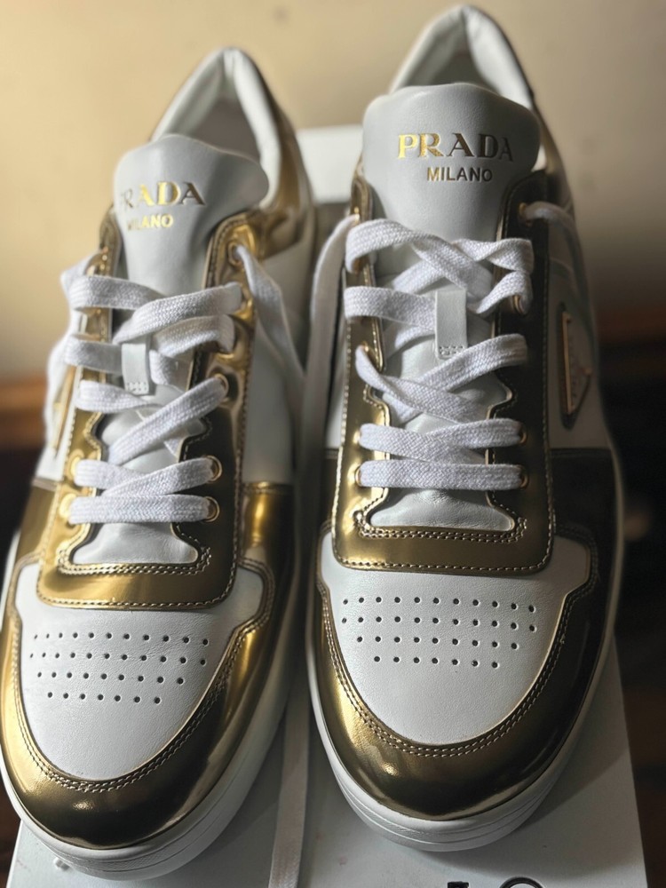 Prada Men Downtown Sneakers US14 Gold White Leather Triangle Logo They have been worn a couple of times I lost the receipt Bought them in Greece, Prada Store. They don't fit me anymore open to offers 100% authentic