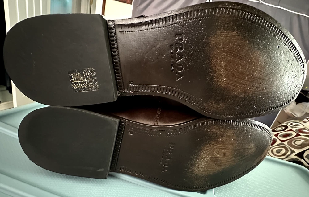 PRADA Mens Dark Brown Leather Dress Shoes. Size 10M (Prada size 9) Made in Italy. Model 2P0709. Great condition. Worn a couple of times. Some signs of wear to soles, heels and toe caps. Leather upper, soles and removable padded insoles. 1"H Rubber heels. Elasticized side and tongue. Strap velcro closure. Comes with Prada vinyl dust bag.