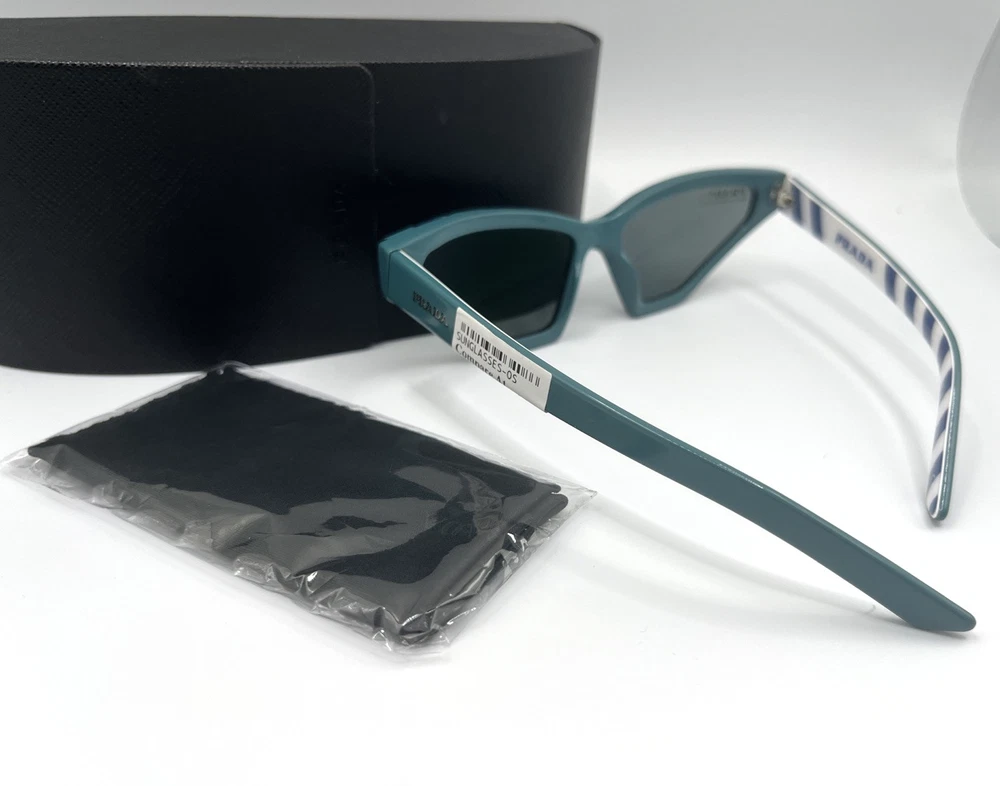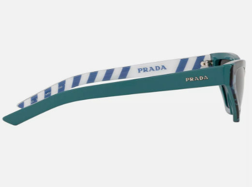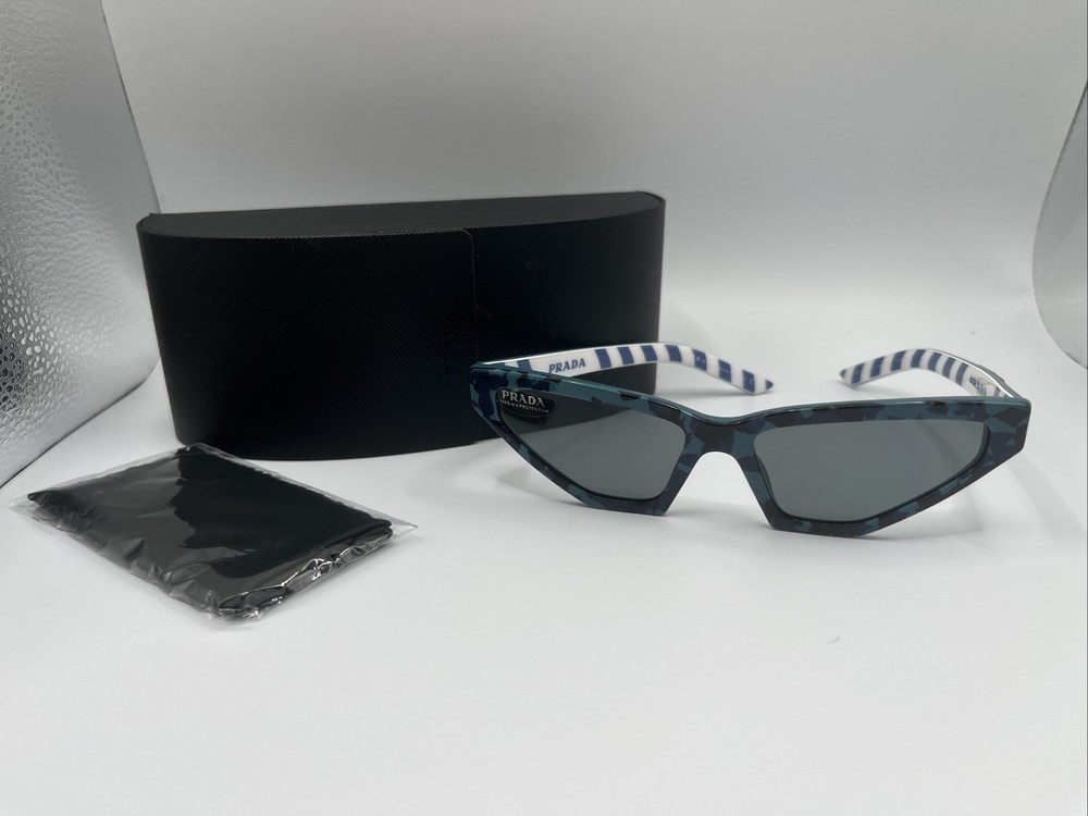 Prada women's Cat eye SPR12V Sunglasses Frame color: Blue / Green Lens color: Grey Marbled and striped print on frame Acetate frame Includes logo case and lens cloth PR823
